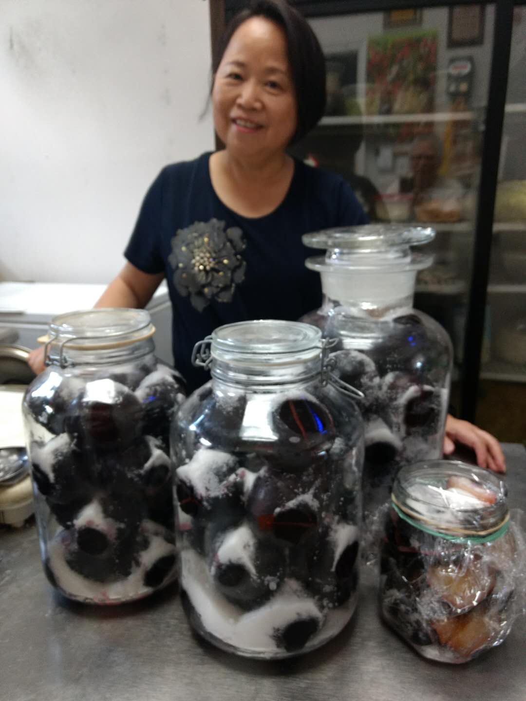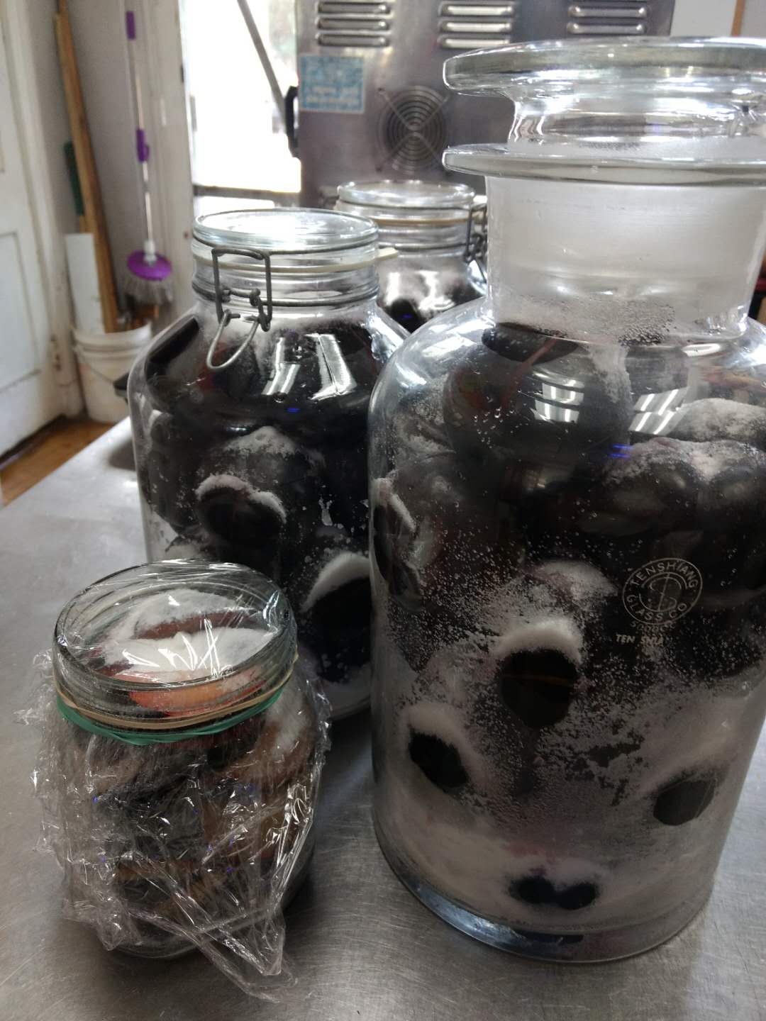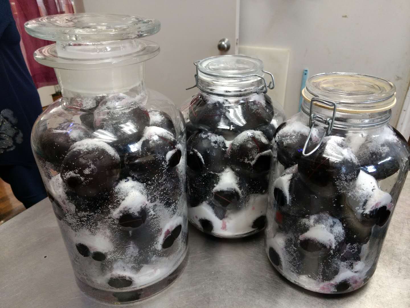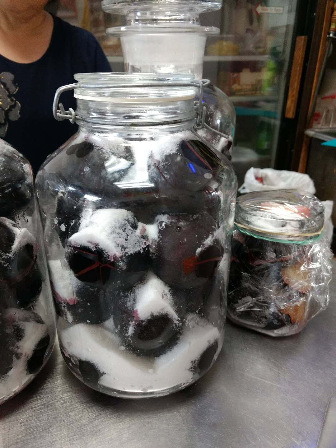 my father sent me photos of his plum wine project. he managed to stuff 2 fido jars (5L and 4L) and a 5L glass wine bottle, as well as a smaller jar missing a clamping lid. i'd later find out they ended up using all the black plums from the case we bought on saturday. that just means i'll need to go back to haymarket if i want more plums. the jarred plums along with heaps of sugar will take a few months to reduce into sweet wine if everything goes according to schedule. my biggest concern is mold, not sure how clean those jars were, having sat in the cafe basement (and one in my house) all this time.