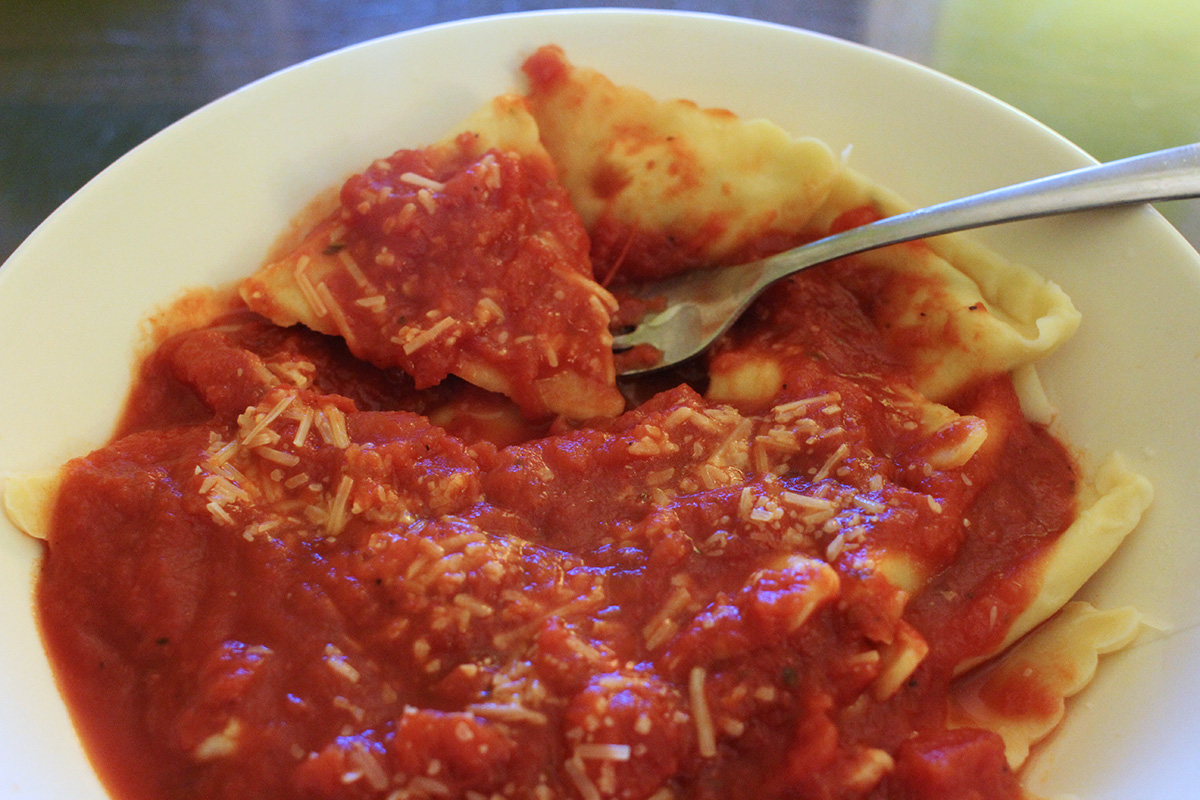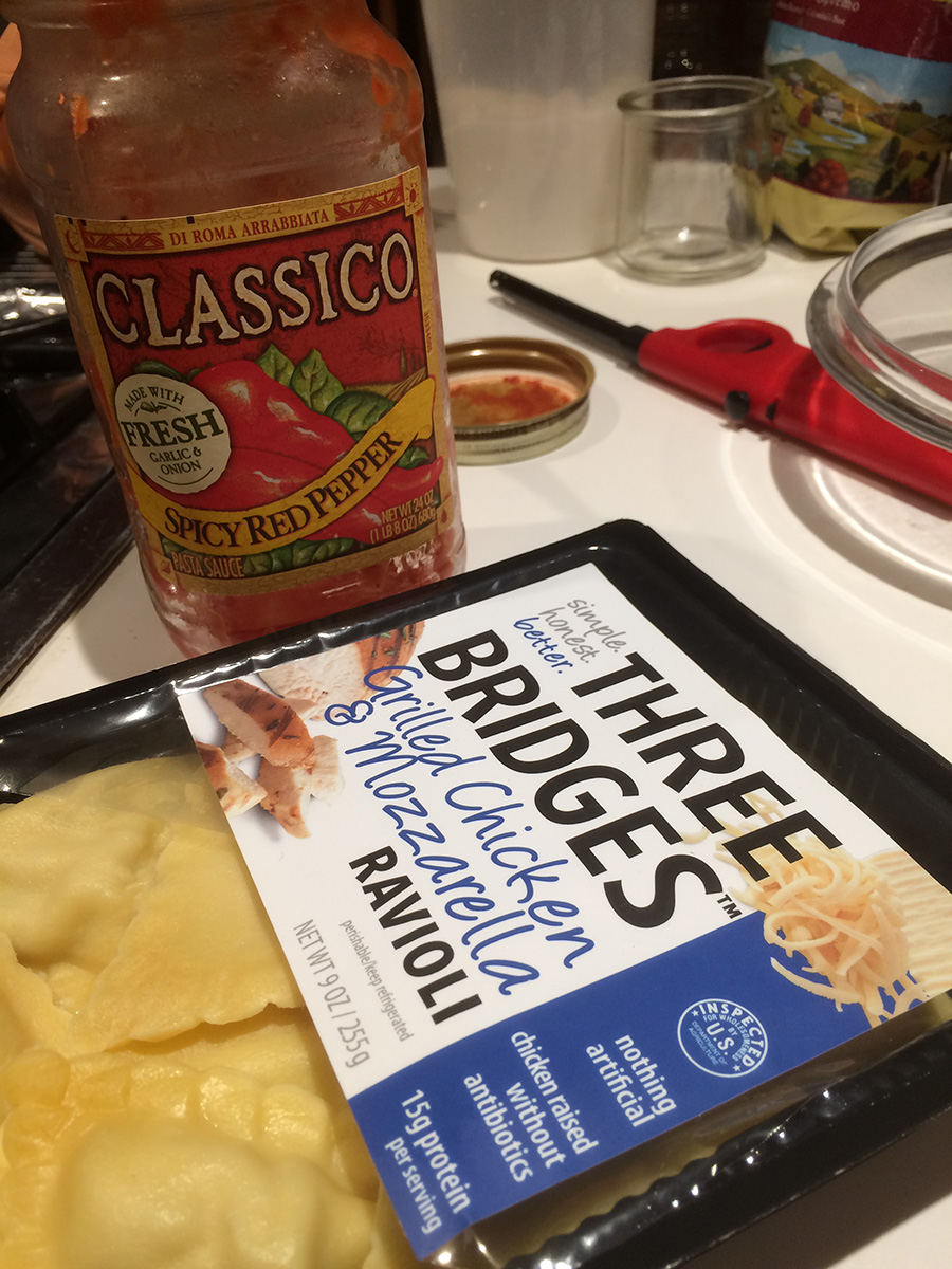 i finally finished by 6:30pm. by then it was too late for guacamole. however, i didn't start making dinner until almost 9pm. i heated up some tomato sauce and boiled a package of chicken raviolis for dinner.