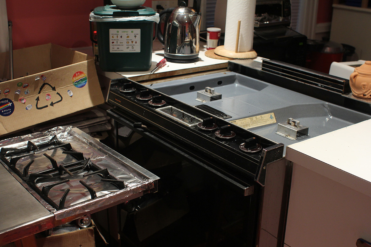 i was going to make some guacamole dip with the 4 avocados that've been ripening on my kitchen counter, but the mess on my stove top distracted me and i ended up spending more than an hour to give it a thorough cleaning. since GC left almost a month ago, i haven't cleaned even though i should've since he really made a mess of it. i knew i had to replace the tinfoil cover but i wasn't prepared to find all this dried liquid underneath. i ended up stripping the entire stove top, washing the burners and the range cover. i was using some brillo pads and would occasionally stab myself in the finger from a stray steel wool fiber. i had some industrial oil removal spray, but that thing is seriously toxic and should only be used outside.