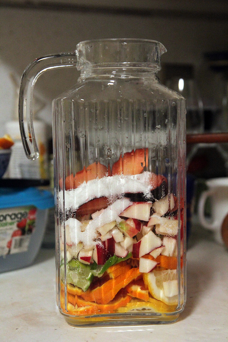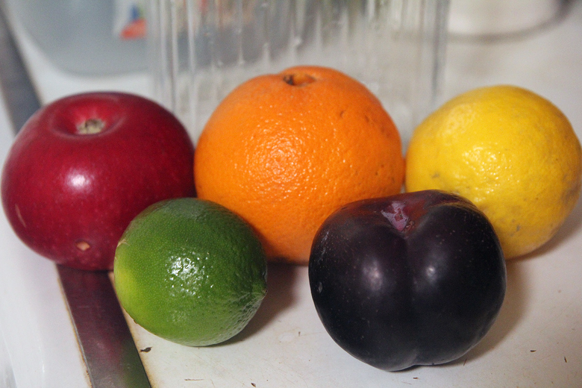 after some fried wontons for lunch, i let my mother try the guacamole i made last night. she said it was too bland, needed to be spicier. i also chopped up some fruit for the sangria. it wasn't intentional, but i seem to have every color of the rainbow represented except for blue: apple, orange, lemon, lime, plum. my mother didn't have a large enough glass pitcher but my sister brought one that was a usable size. i dumped all the ingredients into the pitcher along with 3 tbsp of sugar. to that i added half a cup of triple sec. up until yesterday i'd never heard of triple sec before. my father seemed to know what it was immediately from his bartending days, said it was very sweet. i took a sip and it was definitely sweet and citrusy. i thought the alcohol content would be higher but it was only 14%, a little bit above your typical wine. i left the fruit & sugar & alcohol to steep overnight in the fridge, tomorrow i'll pour in a bottle of red wine (merlot) and see what kind of sangria we make.