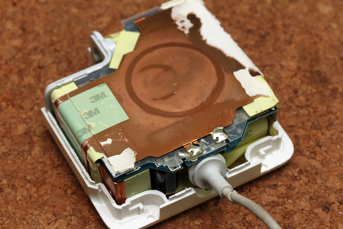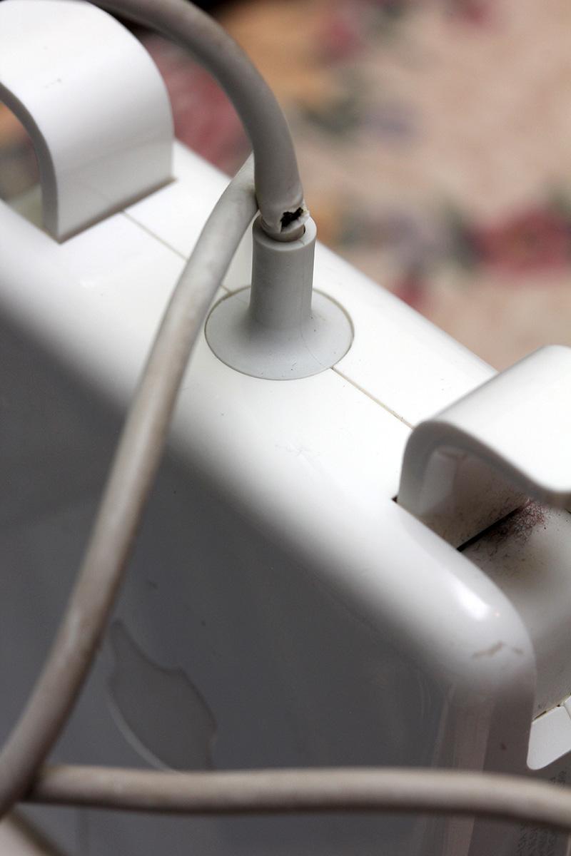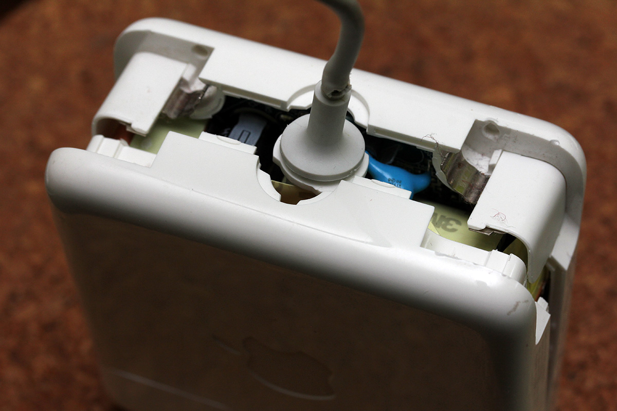 i tried my luck at opening the apple charger and was successful, despite my poor record of destroying electronics whenever i try to take them apart (cases in point: my old panasonic SZ20 camera, the audio cable bracket on my old MBP motherboard). i first pried open the case at the wing clips using a pair of needle nose pliers, the corners opening with a satisfying crack. then i slowly worked apart the rest of the case by hand, making sure to be forceful yet gentle, to not accidentally break anything. not only were the two halves of the case glued together, but there was also some kind of dried putty glue inside the case itself. bottomline: it wasn't designed to be opened. there's actually a way to fix the adapter without a replacement cable, just some creative splicing and shrink wrapping and soldering, though the charger will probably be more durable with a brand new replacement cord.