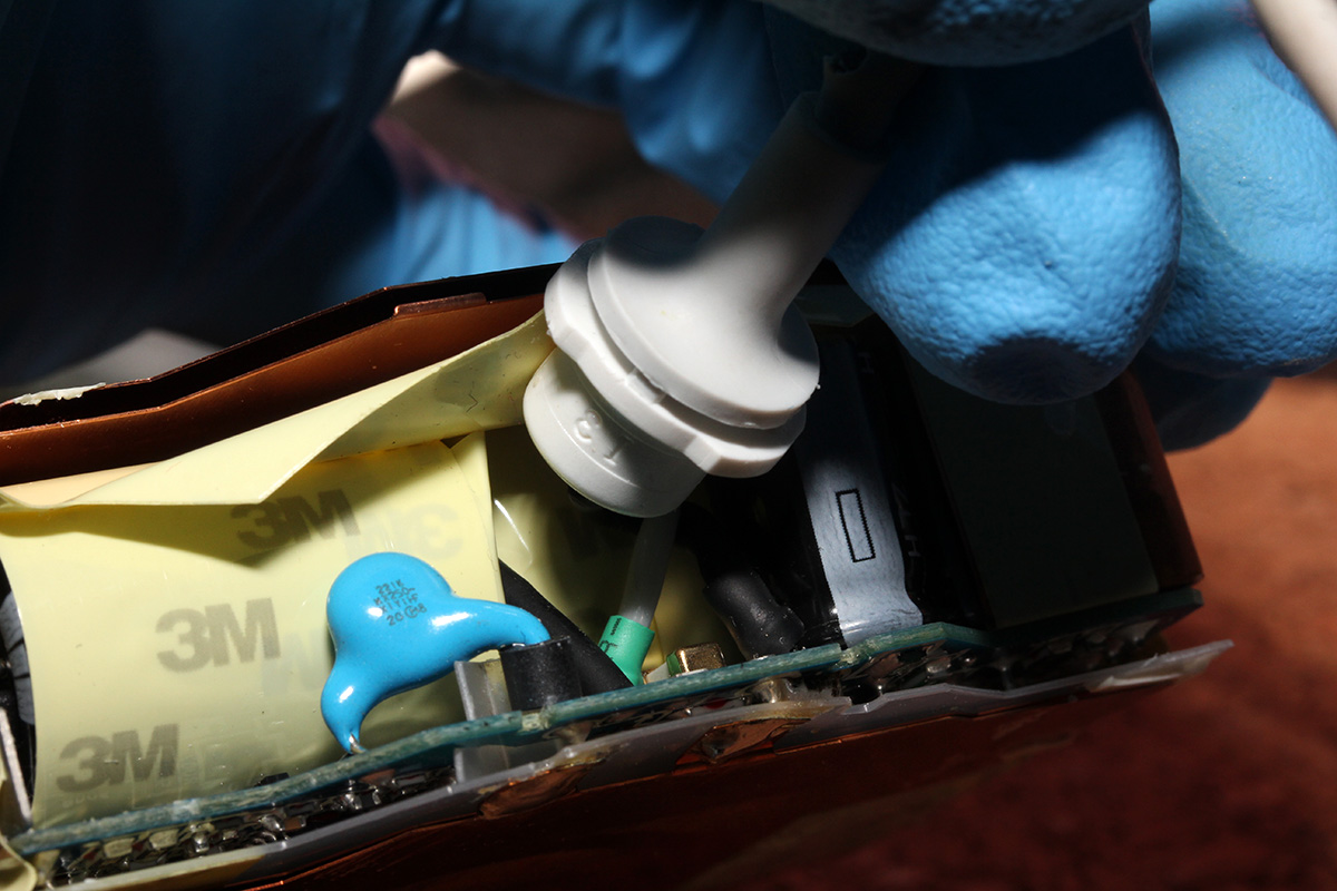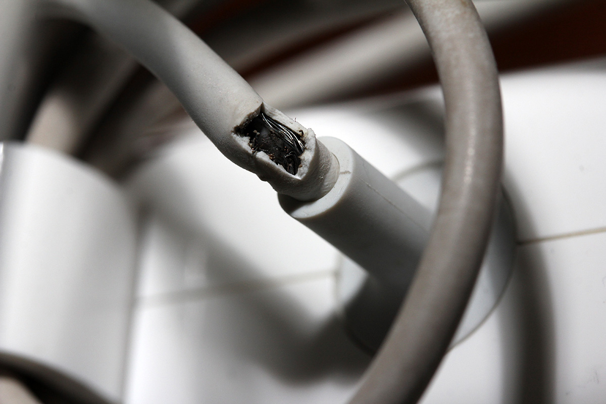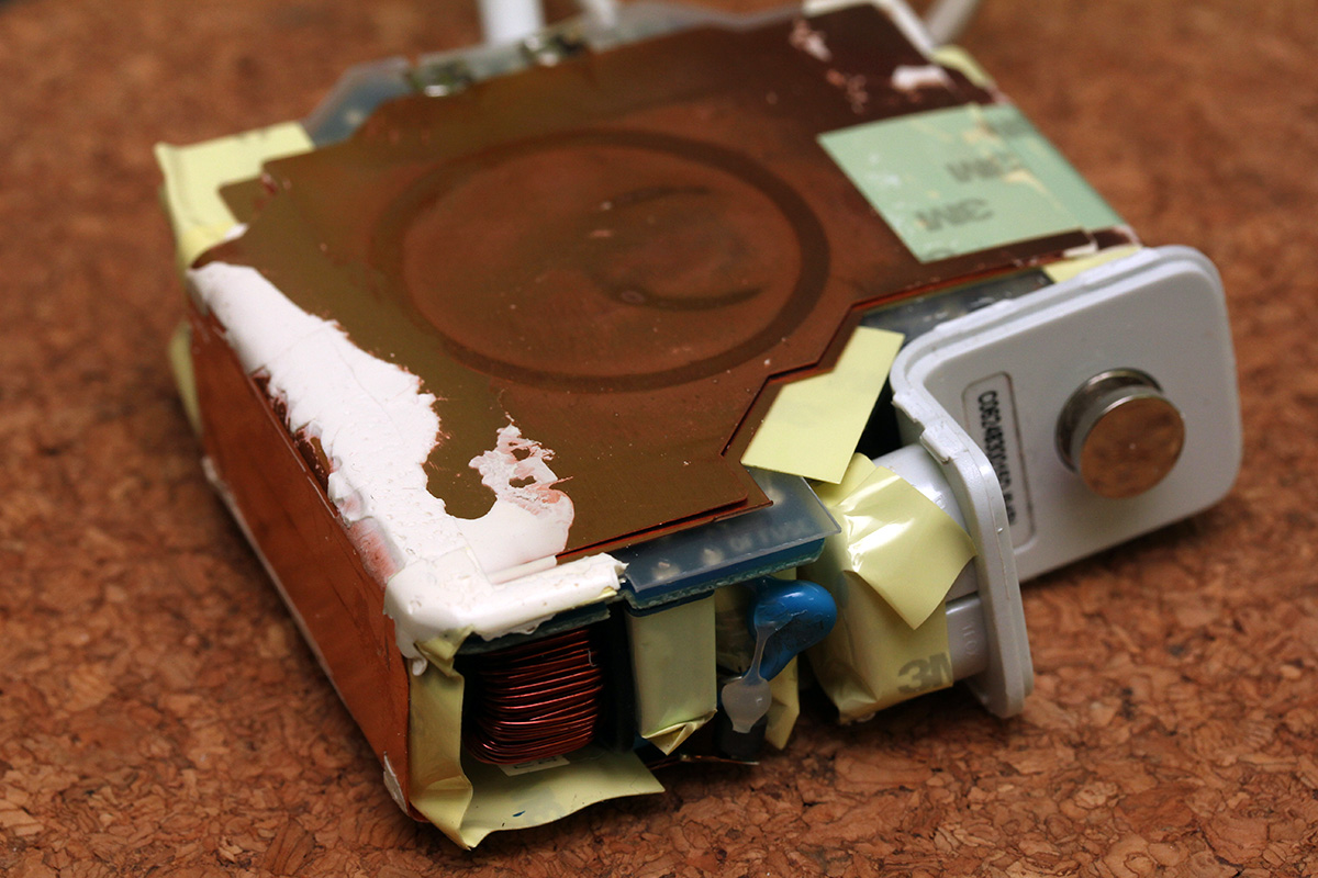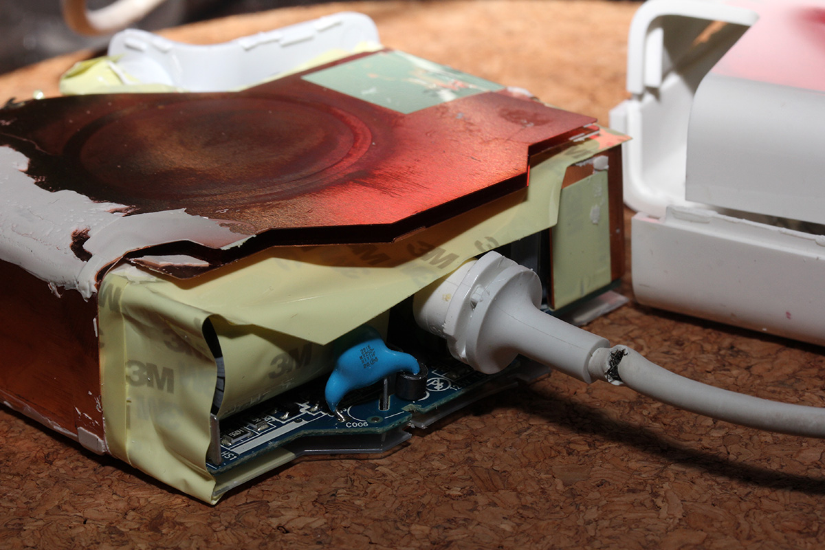 i tried my luck at opening the apple charger and was successful, despite my poor record of destroying electronics whenever i try to take them apart (cases in point: my old panasonic SZ20 camera, the audio cable bracket on my old MBP motherboard). i first pried open the case at the wing clips using a pair of needle nose pliers, the corners opening with a satisfying crack. then i slowly worked apart the rest of the case by hand, making sure to be forceful yet gentle, to not accidentally break anything. not only were the two halves of the case glued together, but there was also some kind of dried putty glue inside the case itself. bottomline: it wasn't designed to be opened. there's actually a way to fix the adapter without a replacement cable, just some creative splicing and shrink wrapping and soldering, though the charger will probably be more durable with a brand new replacement cord.