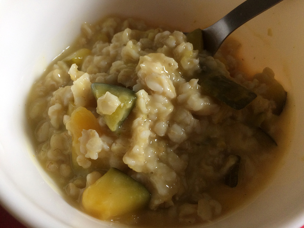 i stopped by the cafe this morning to unload the chair i found last night out of my sister's car. it wasn't heavy, i was able to lift it myself and move it down into the basement for the time being. i then left for belmont, where various vehicles of the people working across the street crowded in front of my parents' place. our street has essentially become their work place. here's hoping for a speedy construction. there was a bowl of buttercup squash oatmeal waiting for me. the squash from our backyard, picked yesterday when we were cleaning up. about the size of a small grapefruit, it was so hard i didn't think it was edible, but it actually tasted pretty sweet once cooked.