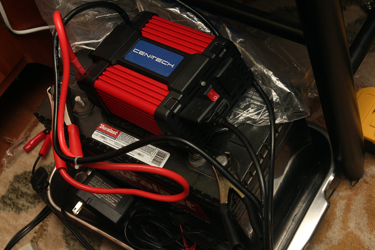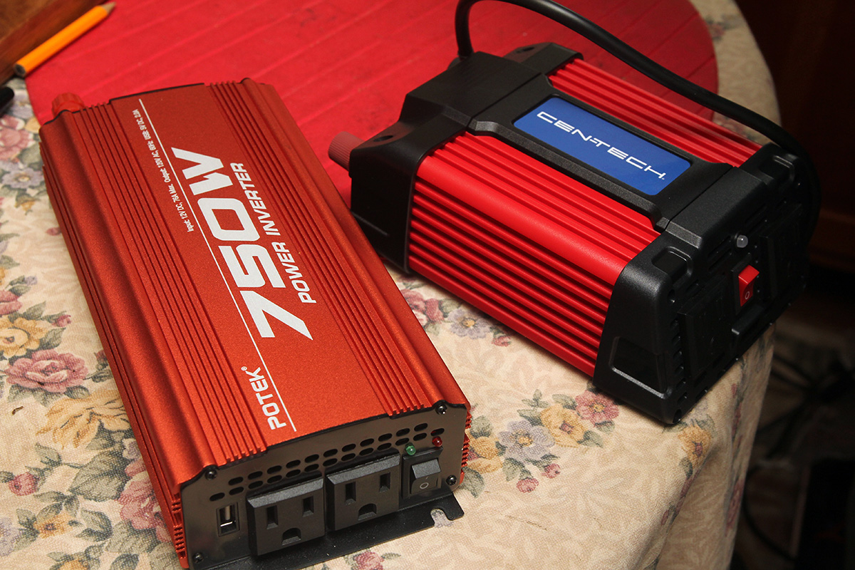 my father tried the new cen-tech 750W inverter. unlike the potek, it had a plastic casing instead of aluminum. unlike the potek, it was completely silent when operating. that was because it never got hot enough for the fan to run, compared to the potek where the very loud fan was always running even with a small load. we tried to force the cen-tech running off of the deep cycle marine battery to get hot enough to trigger the fan. first time was with a dyson vacuum cleaner, but apparently it used too much power (i'm guessing over 800W) which tripped the inverter safety alarm. we then tried a dremel drill running at nearly full power. the cen-tech did start to feel warmer, but still not enough to trigger the fan. we decided to leave it alone for the time being, since normally my father plans on running just the radio transceiver from the inverter, which doesn't require all that much power. if in fact the cen-tech is also broken (that the fan never runs), we can always return it, harbor freight products has a lifetime warranty. my father likes the cen-tech better because the plastic casing means he can leave it on top of the battery without worrying it might short-circuit.