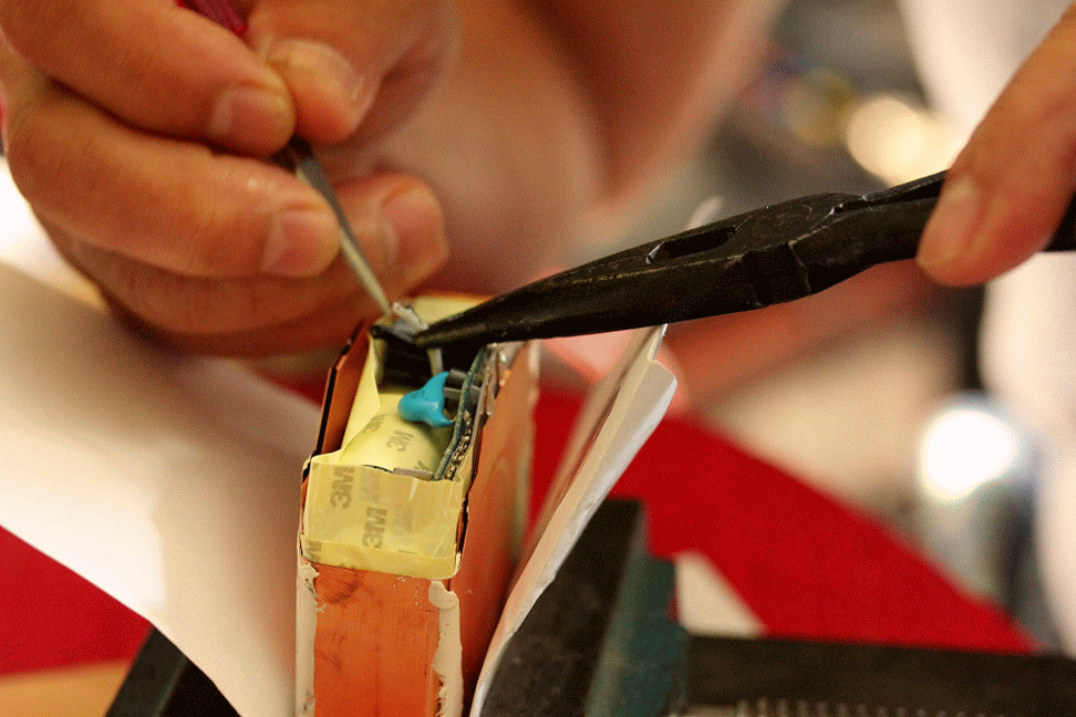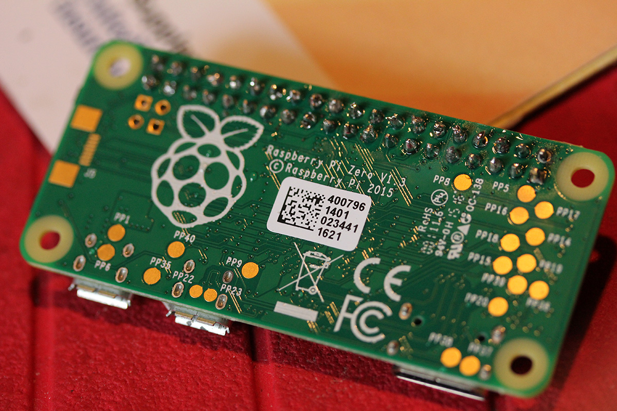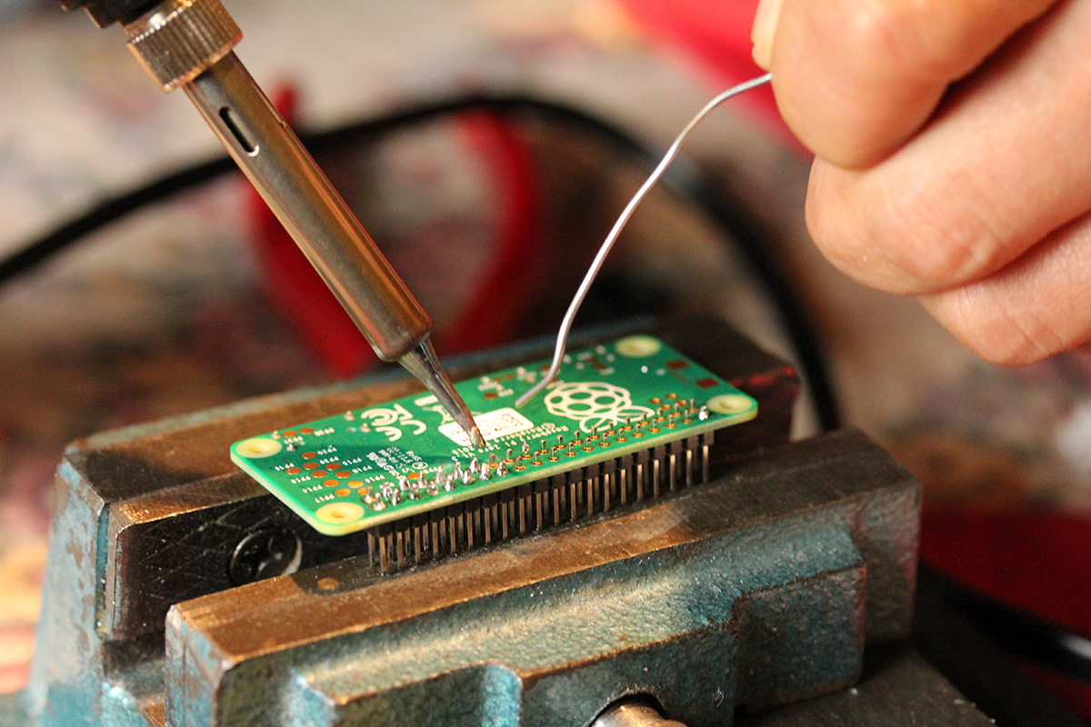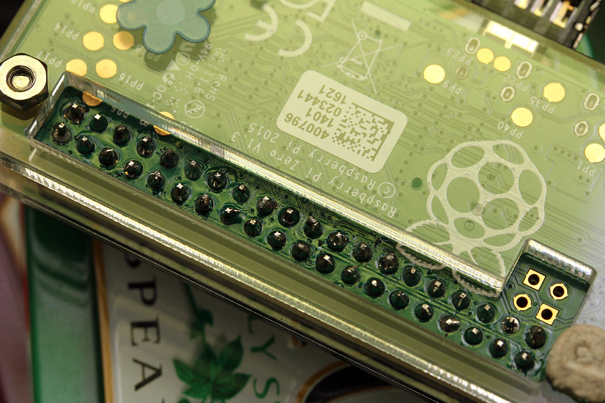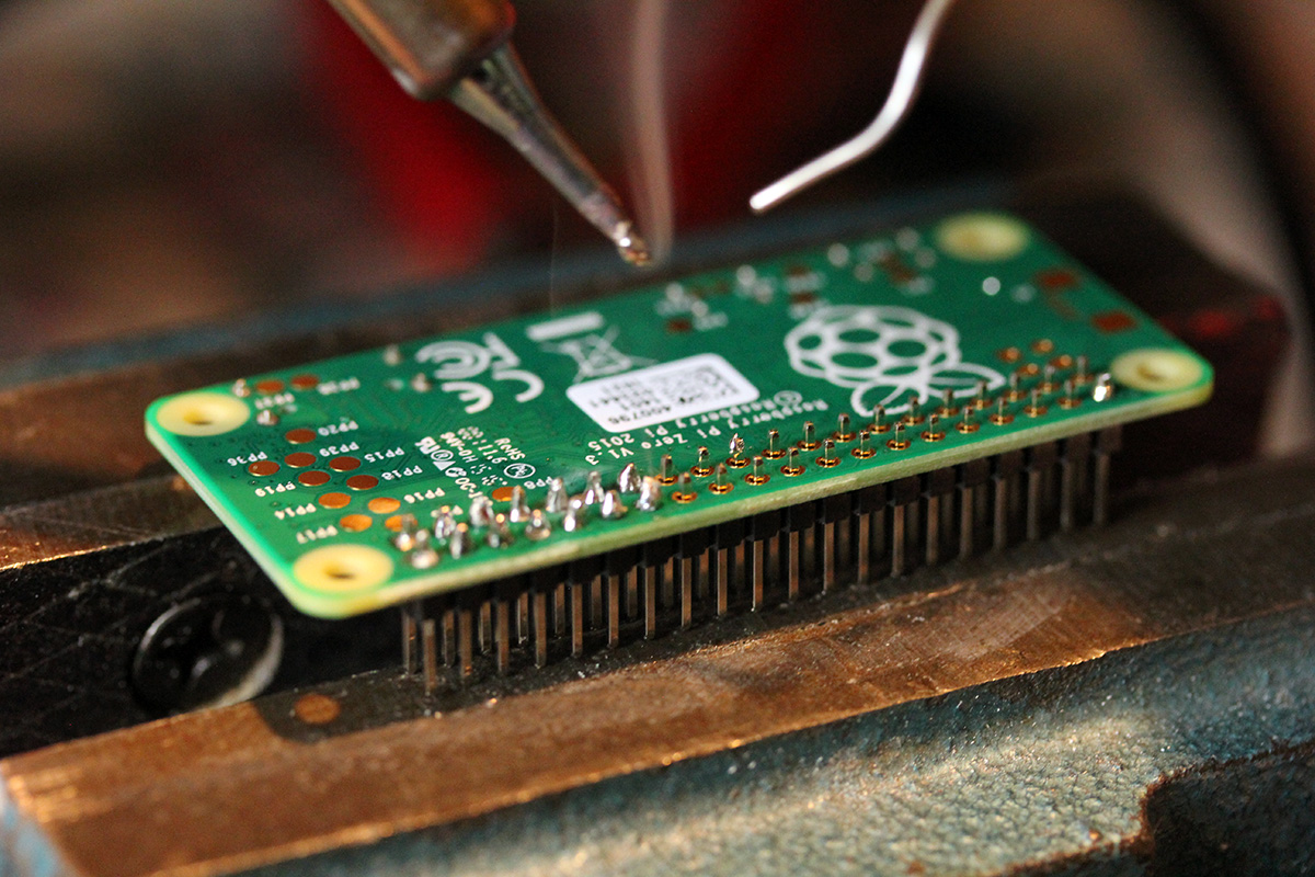 once we got enough practice on the sensors, we moved onto the raspberry pi zero board, which required 40 soldering points. we clamped the board into a vise to make work easier. some soldering points were perfect (shaped like metal hershey kisses), while others looking terrible (fat glob og silvery solder), but not bad for our first time. it was actually fun, because if you hit the pin just right, the solder would melt into the ring with a satisfying shrink, and sometimes you could hear it as well.