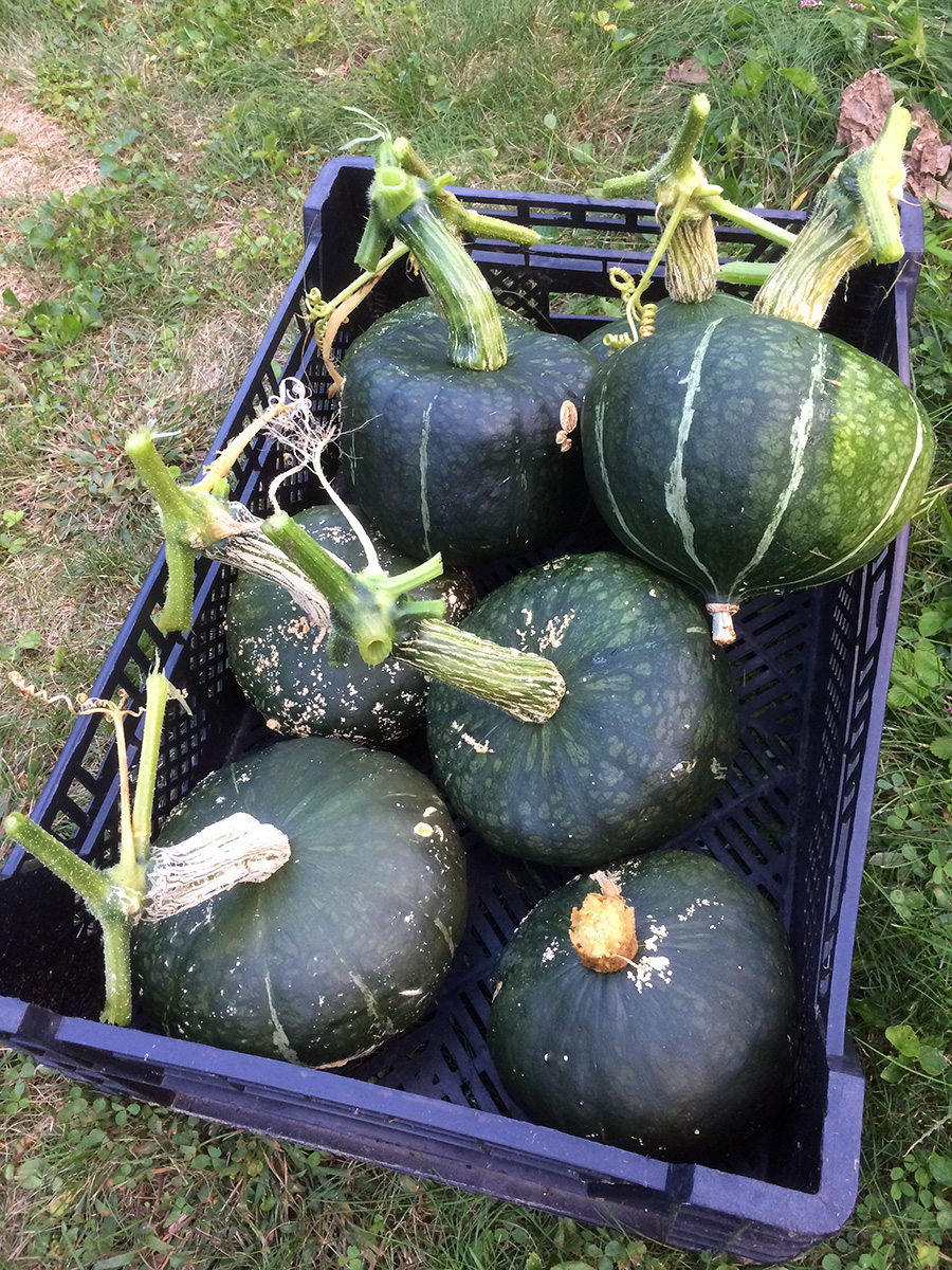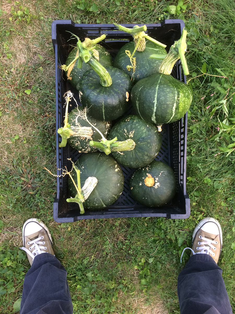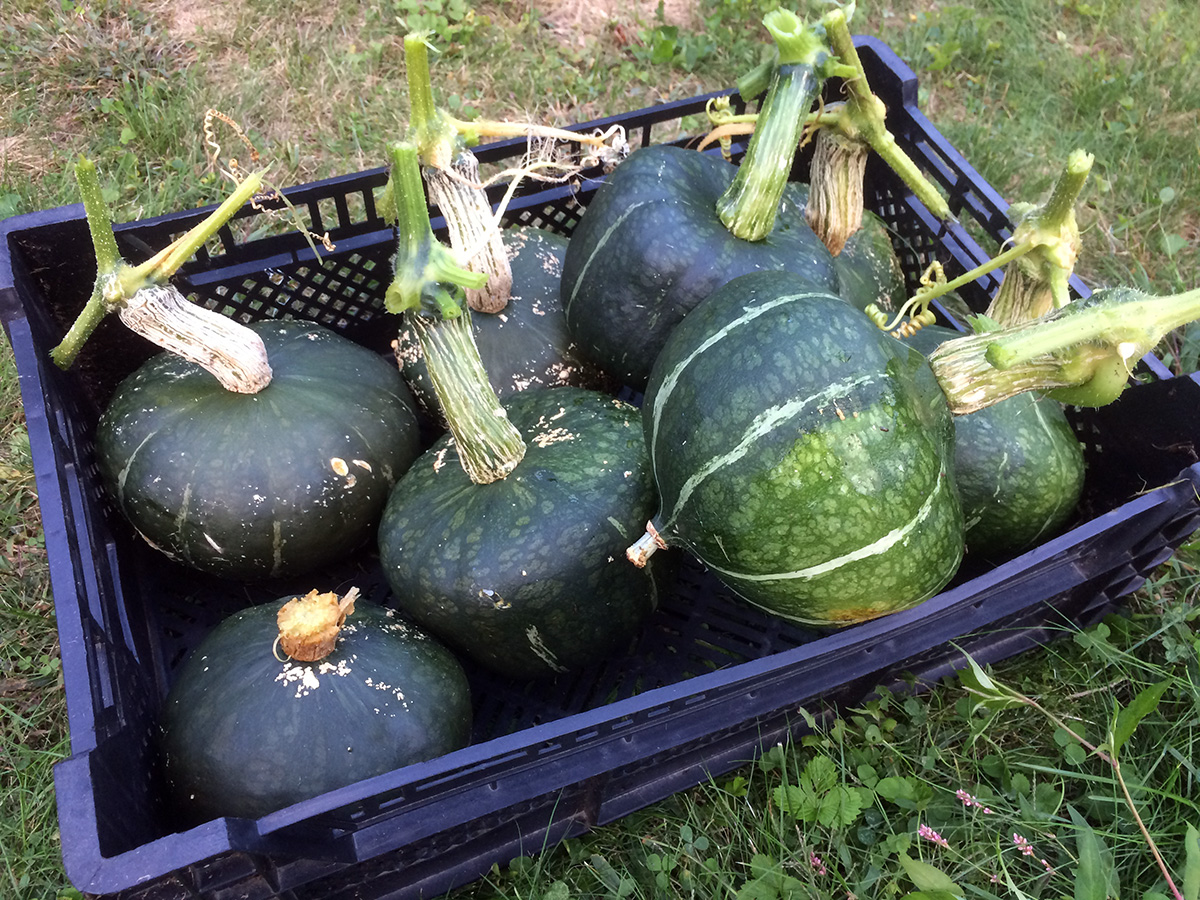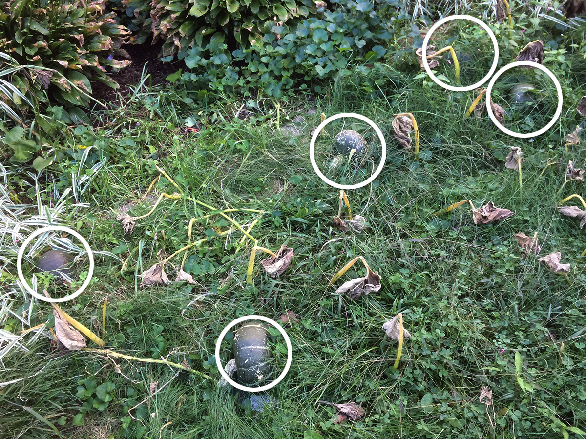 with the temperature turning cooler, it doesn't look like we will be growing any more butternut squashes. so we decided to harvest the ones we do have, given that many of the leaves have already succumbed either to the cooler temperature or disease. we ended up collecting 9 squashes, which was more than we expected, as some were hiding. water was still dribbling from the vines like hoses when we cut them, which shows how well they were growing. all of this from a single plant. the main root had rotted a while ago, but all the vines would send out roots of their own.