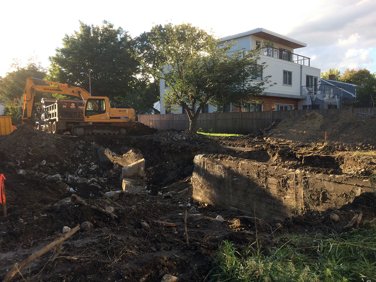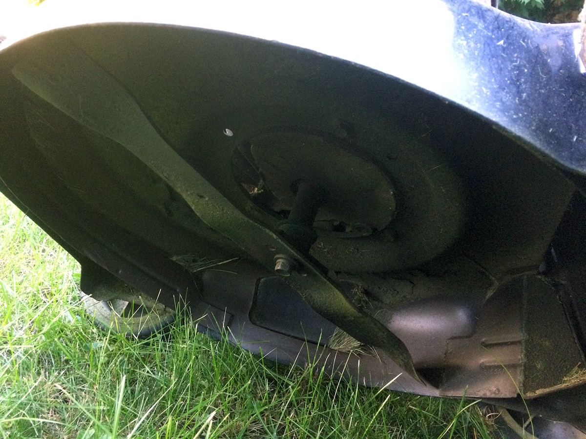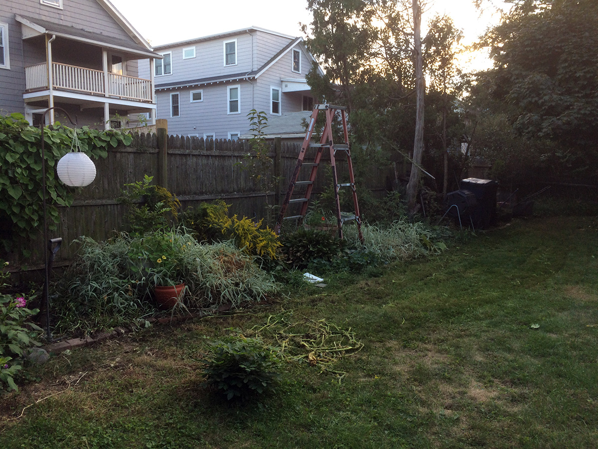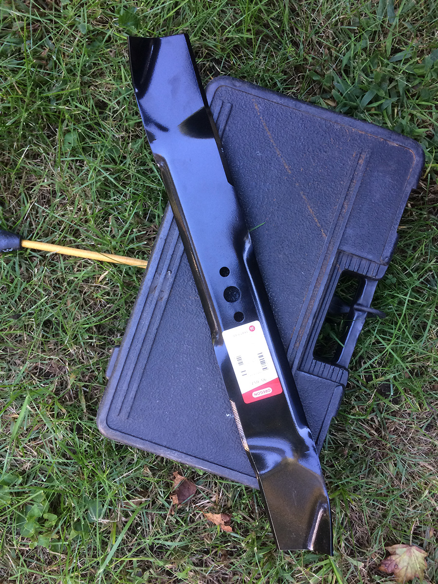 while we were outside inspecting the neighbor's excavation site (there seems to be some hidden unused foundation, like maybe they were possibly thinking about installing a nuclear fallout shelter but never finished the construction), we pushed out the lawnmower to replace the blade. even though it's been cutting grass kind of ragged, the blade still seemed to be in very good shape, perhaps even sharper than the new blade. with some new sharpening, it could very well be better than the new one. removing the old blade was easy; i thought there would be more fixtures but it was just attached by a single nut which i easily took off with a socket wrench. the new blade is about an inch wider, and i was afraid it would strike the inside of the mower, but there's just enough clearance. since i was out, i decided to quickly give the new blade a test, quickly mowing the front lawn. it seems to work just as well as the old blade, i couldn't tell if it was doing a better job cutting the grass. later i moved the mower into the backyard and mowed over all the buttercup squash vines growing on the lawn.