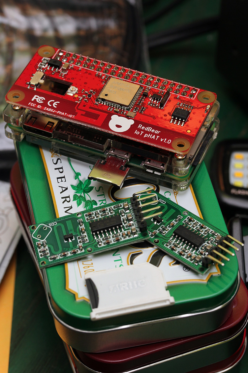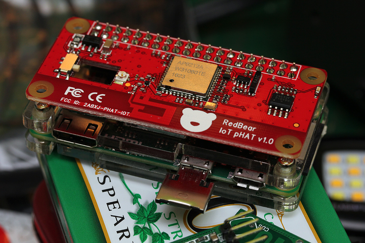after dinner i returned home. my raspberry pi zero with newly soldered header pins could finally use the redbear IoT pHAT module i bought a while back for $5. these modules are no longer relevant now that the pi zero w comes with wifi and bluetooth for the same price as a regular pi zero. and actually, the module takes up all 40 pins so if you wanted to use some pins to run a sensor, you can't when the module is installed. that's why even online, i see vendors desperately trying to get rid of their stock of IoT pHAT.