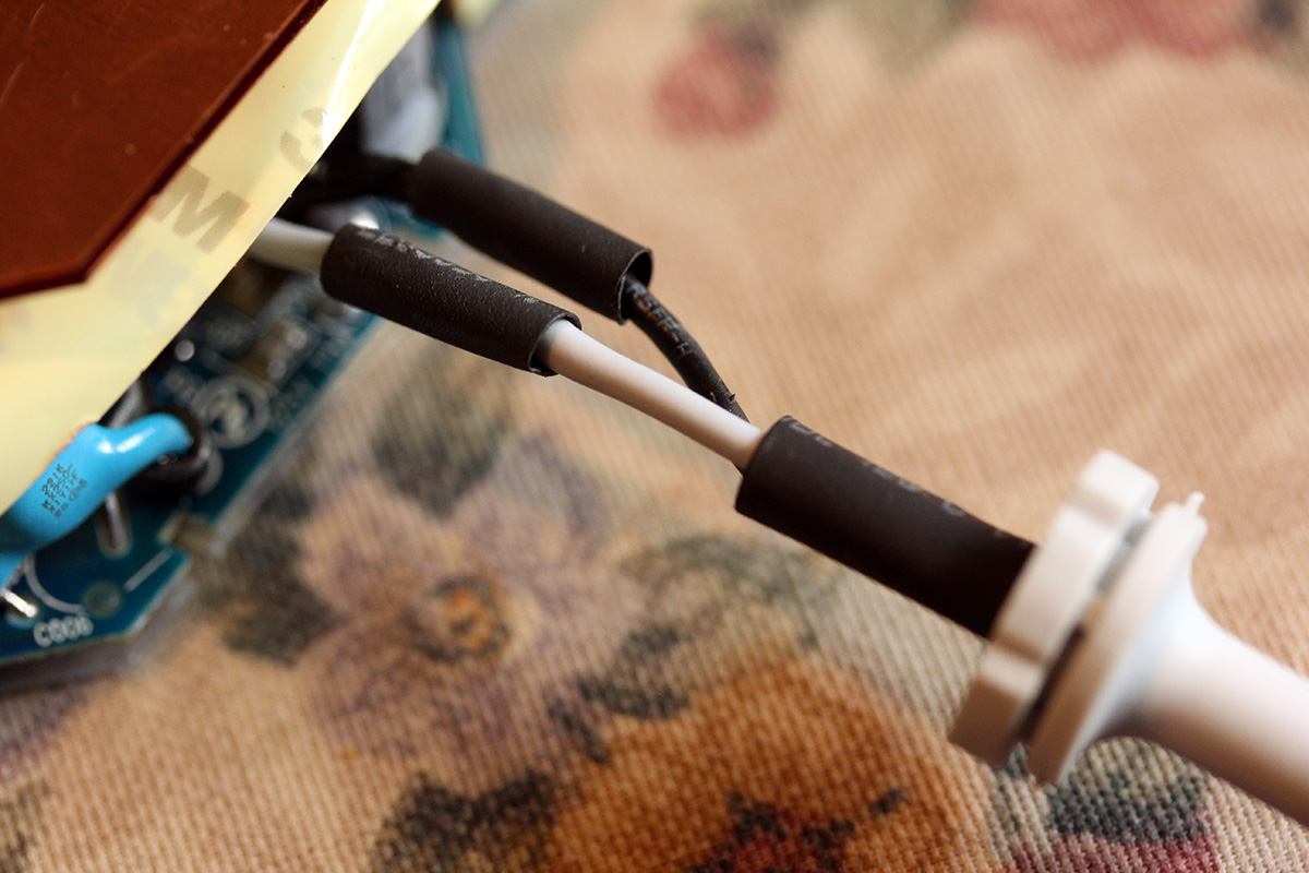 we realized it was easier to splice the 2 wires from the old cord with the new cord because it seemed difficult to desolder the old wires from adapter itself, since the wires were not only attached to the circuit board, but also soldered to some copper shielding. we wanted to cover the spliced regions in heat shrink. the problem was there wasn't that much wire to work with, and the heat shrinks we put on one end started to shrink a little from the heat of the solder joints. fortunately we were still able to move the heat shrink, and after we finished soldering, my father sealed the shrinks with a lighter. we then curled the wires back into the adapter and closed it up. we didn't have any super glue in the house so final sealing will have to wait until tomorrow.