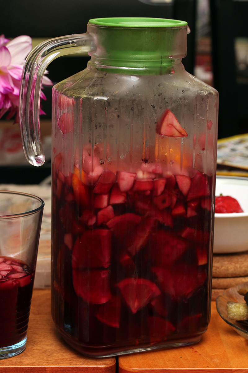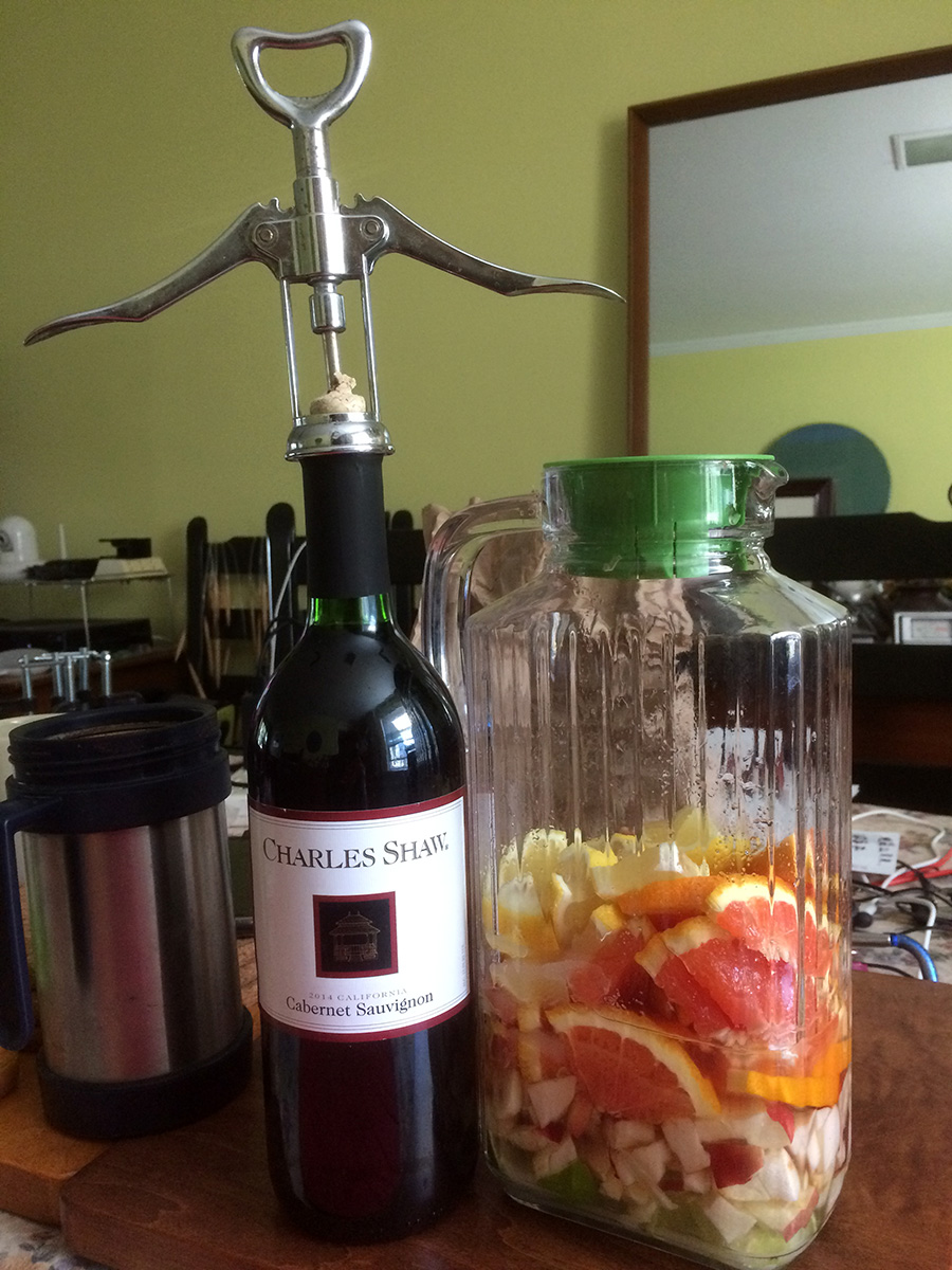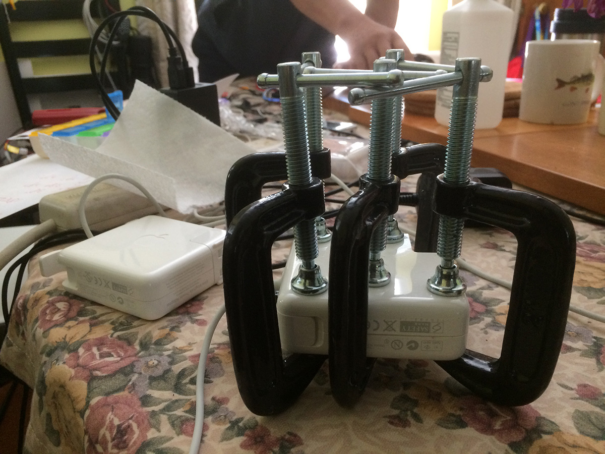 i brought superglue from my house so we could seal up the apple magsafe adapter we fixed yesterday. i also brought some c-clamps to hold the case in place while the glue dries. with the superglue i also sealed the crack on the magsafe cord of the newer adapter, and then we used transparent self-sealing silicone tape to wrap up the rip along with the base of the cord (the weakest point and most likely where future tears might happen). later i whipped up another batch of sangria.