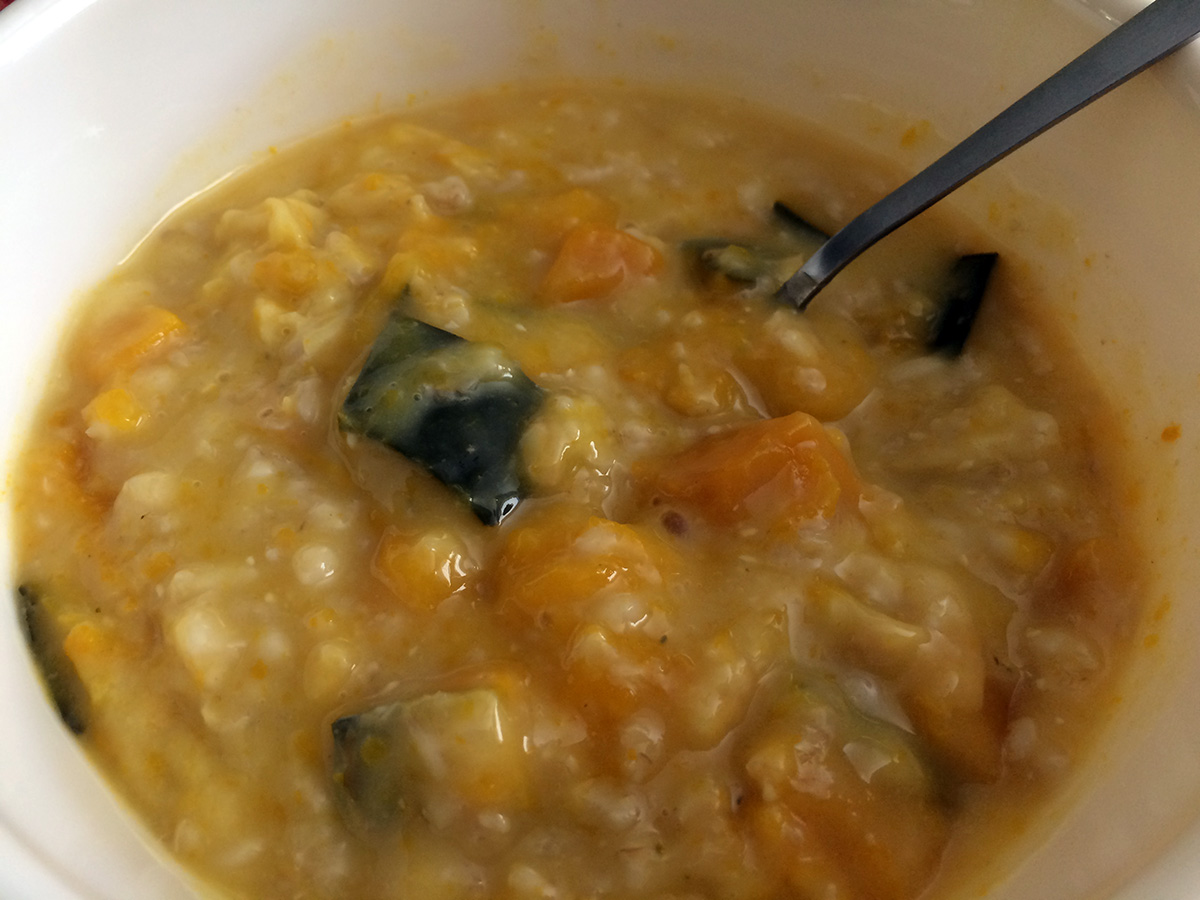 my father cut up one of the buttercup squashes we picked yesterday, the one with the soft stem. he cooked it into some rice porridge. unlike the smaller squash we harvested accidentally a few days ago (it fell off its stem), this one wasn't as sweet.