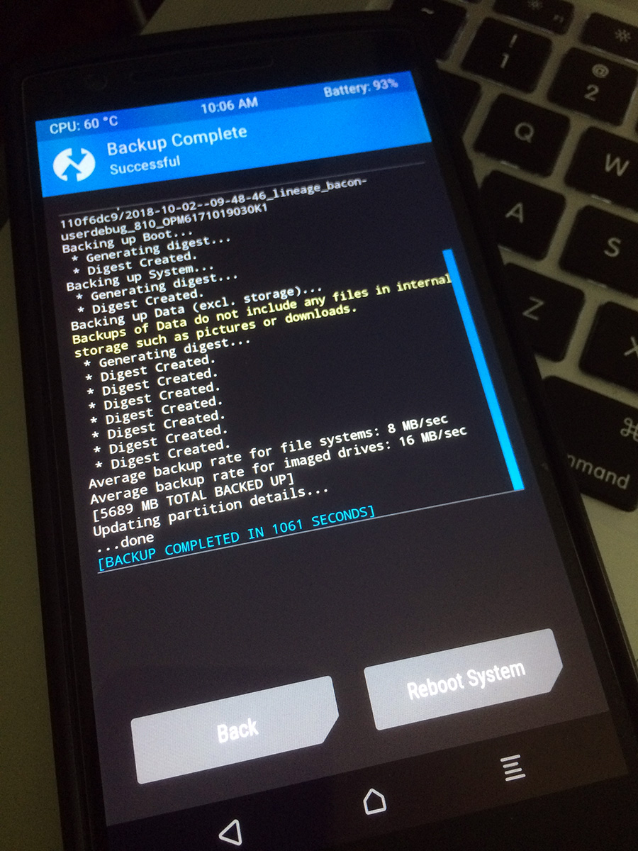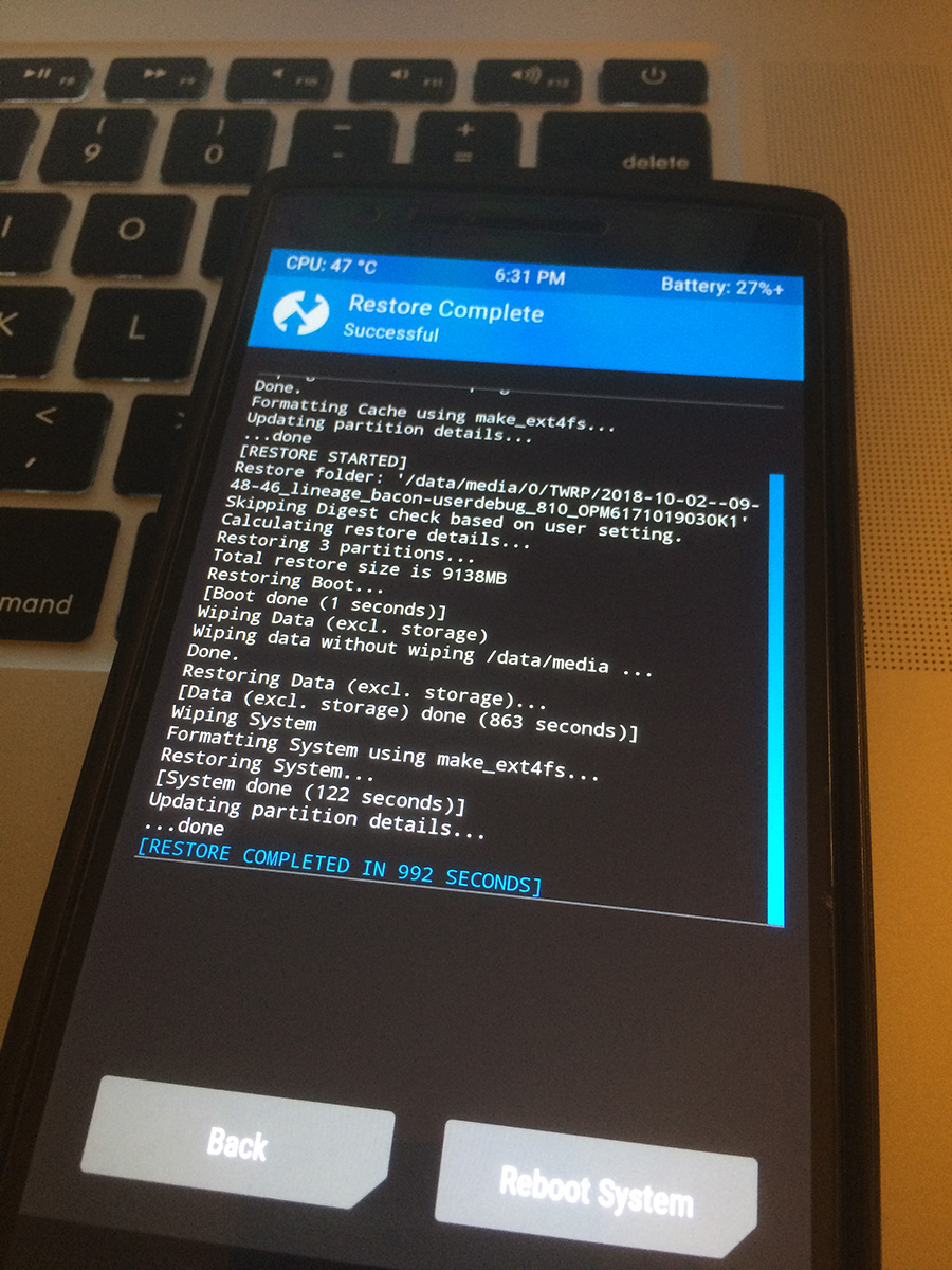 it was time to go back to lineage. good thing i made a nandroid backup earlier, but it was also a moment of truth, to see if the backup actually worked or not. first i had to copy it back onto the phone. that took a while, transferring 6GB via adb using USB 2.0. once the transfer finished i tried looking for the backup in TWRP recovery, but unfortunately it couldn't detect any. using the built-in file browser, i went digging, and found the nandroid nestled deep inside the TWRP folder: /TWRP/TWRP/BACKUPS/110f6dc9/2018-10-02--09-48-46_lineage_bacon. i moved the nandroid directory up into the main TWRP folder; the recovery was finally able to see it. i left it to recover from the backup.