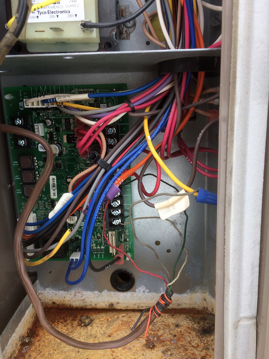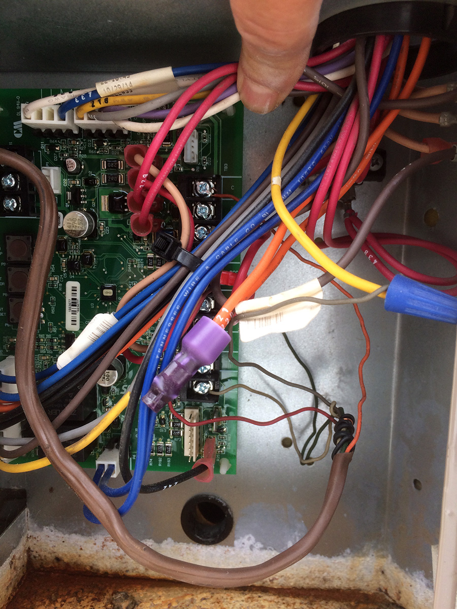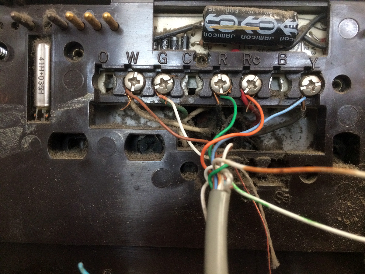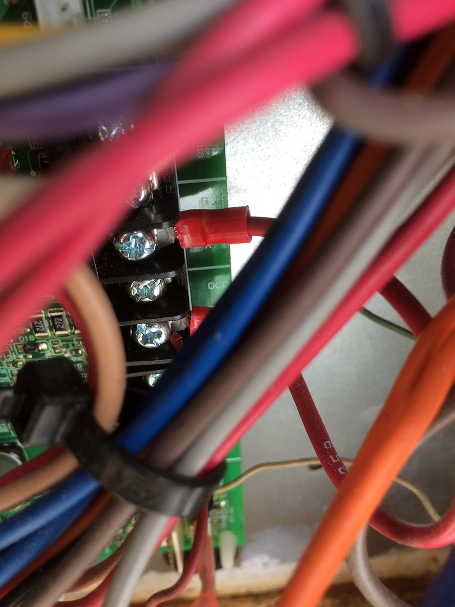 opening the AC control panel, i was happy to see there was a spot on the board for a common wire. however, the rest of the wiring confused me. downstairs, the previous thermostat only used 3 wires, but in the control panel 4 wires were connected. even more mysterious, the wire for the Y call (grey) wasn't connected to the Y call spot on the board, but instead spliced to some other wire that disappears further inside the AC. the wire used for the Y call on the thermostat (white) was connected to the W call on the AC board. also the R call was jumped to something called the OCC which i'd never seen before. confusing wire notwithstanding, it seemed to work so i left everything as is after connecting the common wire (orange).