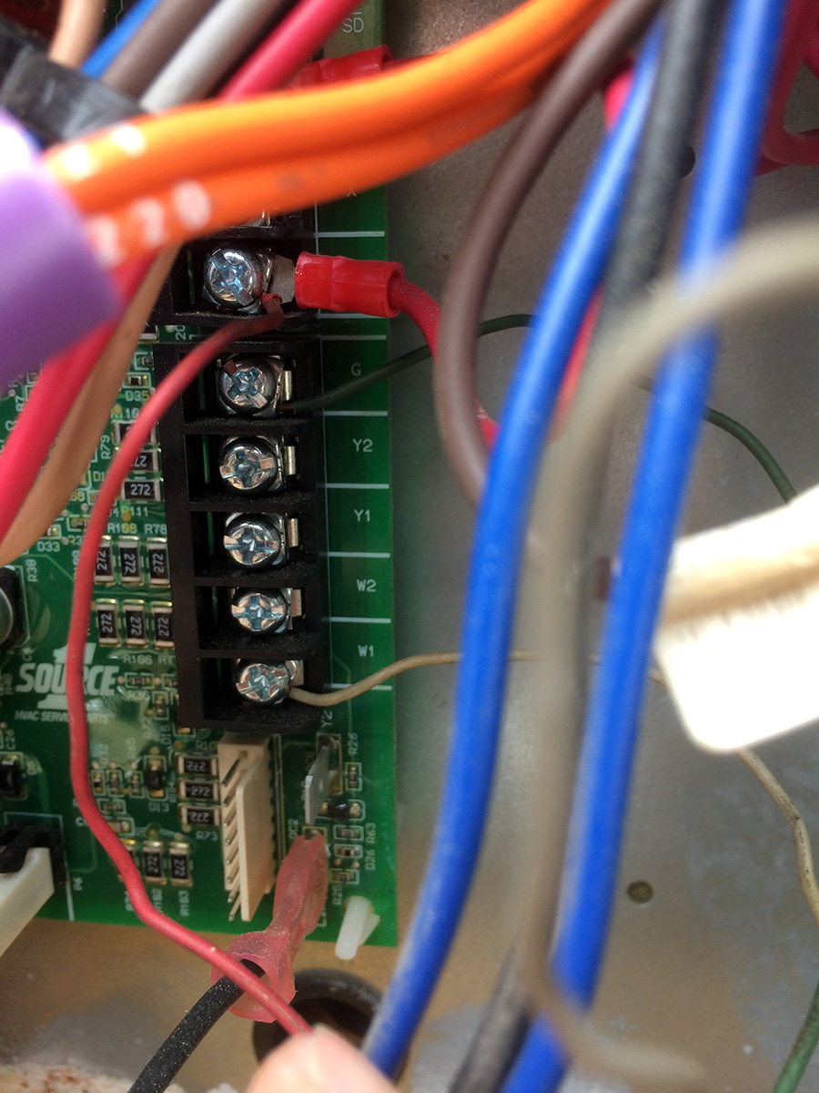 i already checked, and the old furnace in the basement doesn't have a common connector. however, i was pretty confident that the AC on the roof would have a common, so we climbed up to check. luckily even though they didn't run a common wire, they still pulled a 6 wire cable and were just using 3 of them, so we could use one of the spare wires to be the common.