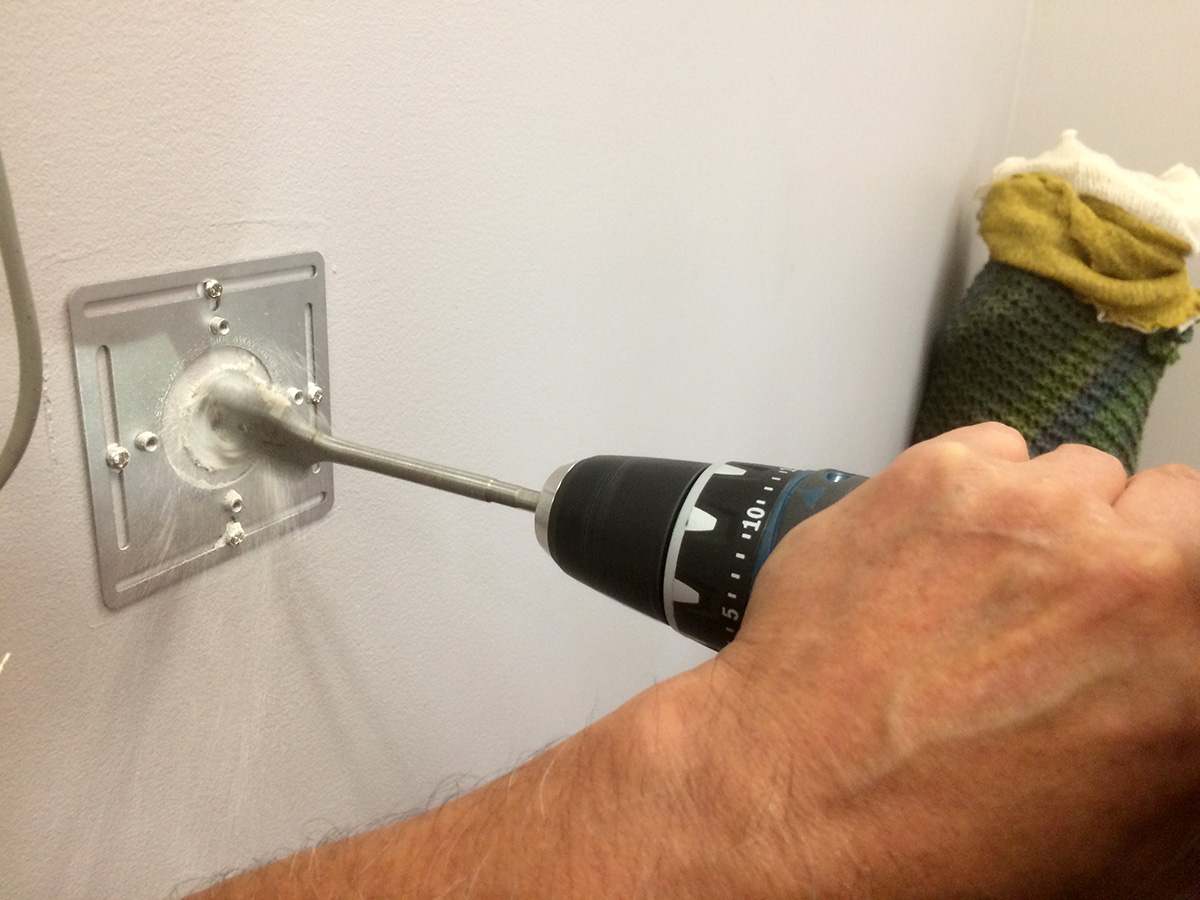 back on the thermostat installation, we secured the wall mounting plate and drilled a 1-1/2" diameter hole into the sheet rock wall. since the existing wires from the AC and furnace were too short to reach the other side of the doorway (where we wanted to mount the nest), we had to pull new wires. we used a length of ethernet cable. all we had to do was snake the wire from the doorway up into the ceiling, a distance of about 2 yards, but that seemed to be the hardest thing we had to do. we tried it from bottom to top, then top to bottom, but finally managed to snake it successfully going from bottom to top. i spliced together the heating/cooling wires with the ethernet cable using wiring nuts.