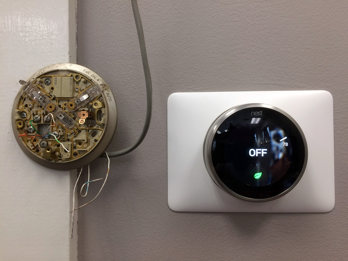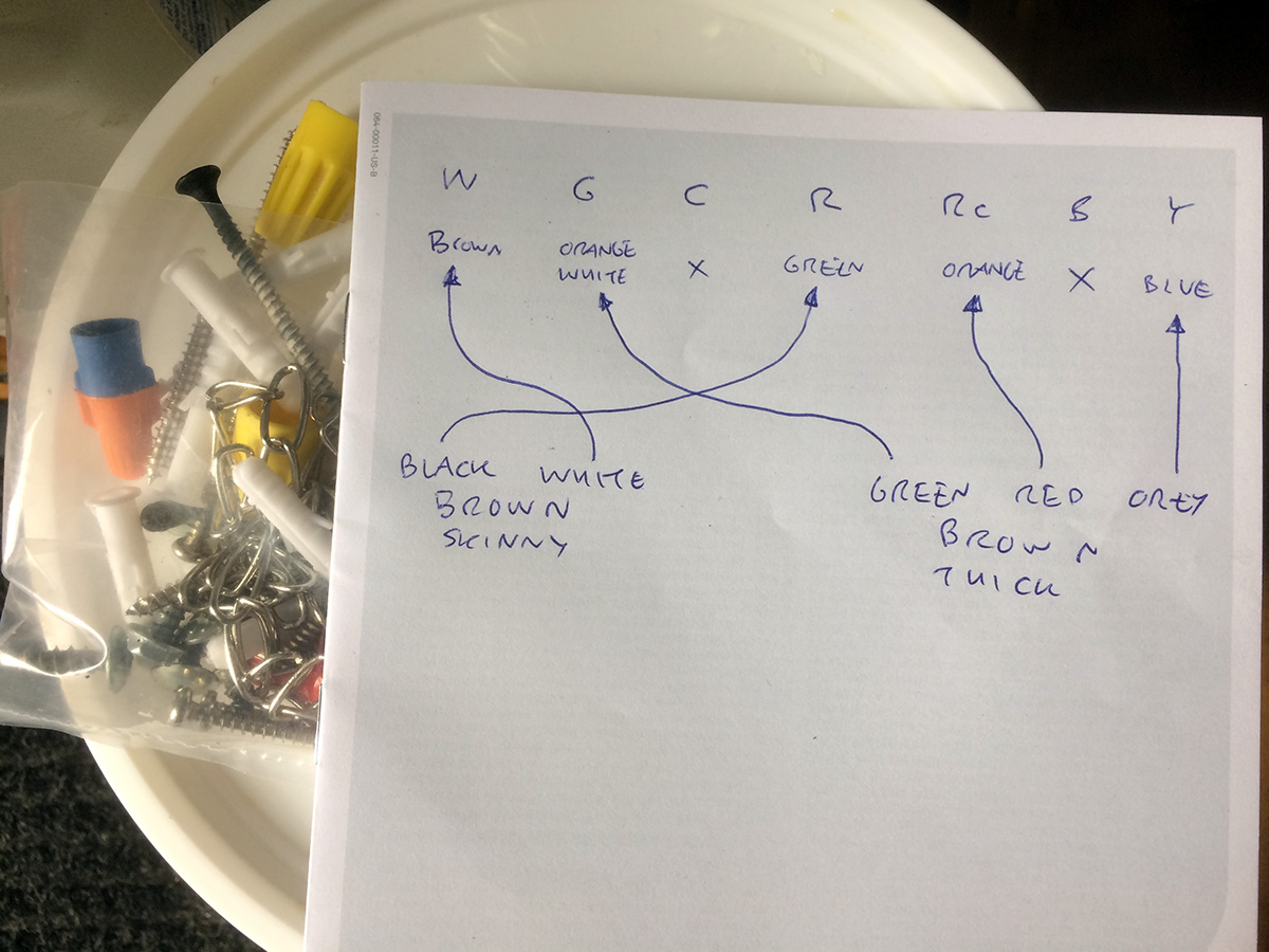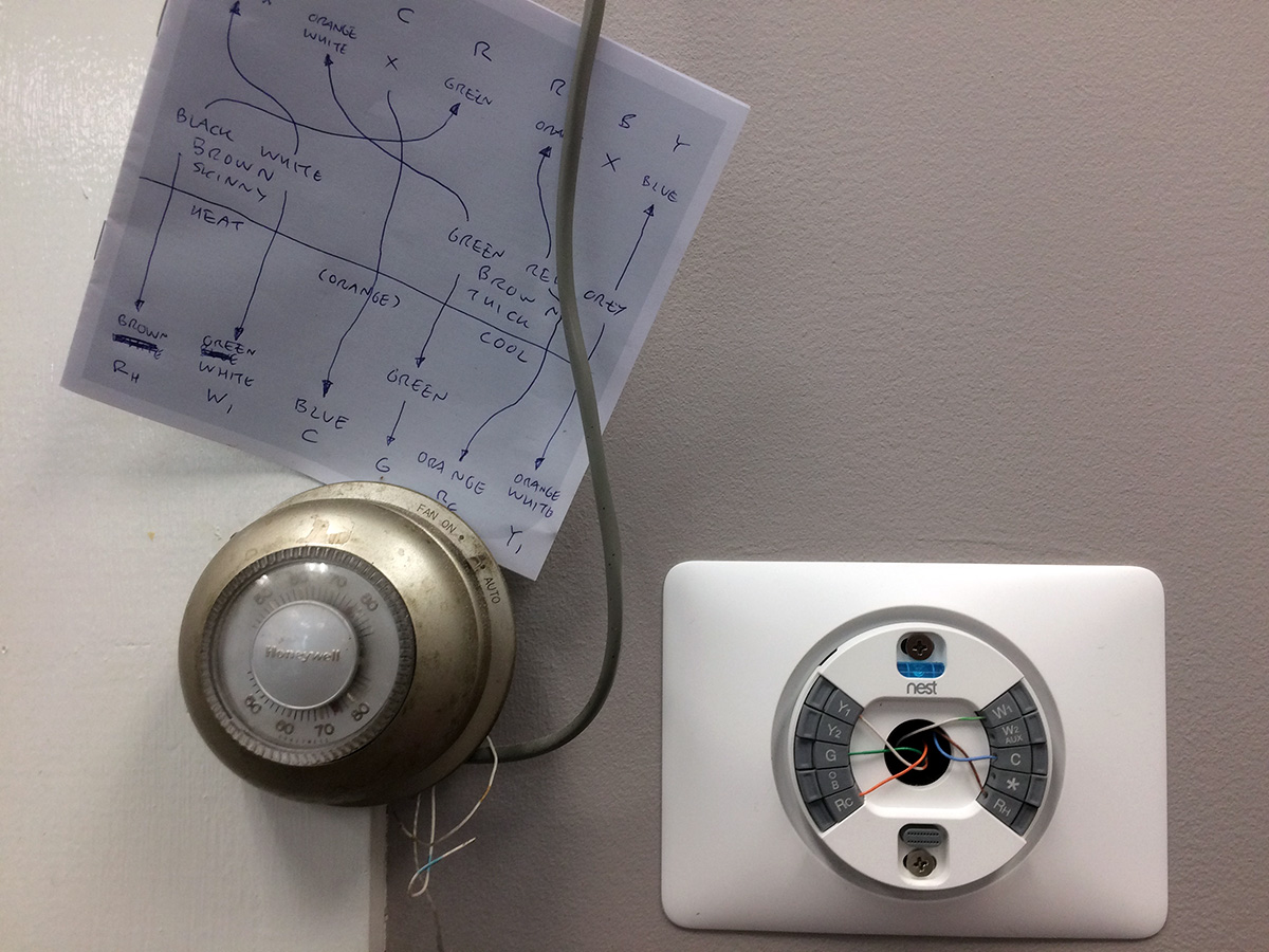 i went to the cafe today ready for some paint prep work but instead i spent the whole day helping my father reroute some wires for the nest thermostat. the cafe has a roof-mounted air conditioner for cooling and a basement gas furnace for heating. first step was figuring out a key to decipher how the wires from the AC and the furnace connect into the existing thermostats. and i say thermostats because even though the wires go through two thermostats, only one of them actually worked. though the AC unit is new, the HVAC installers never ran a common wire since the previous thermostat didn't need it. however, the nest thermostat does require a common to have enough electricity to run the background when neither the AC or furnace are on.