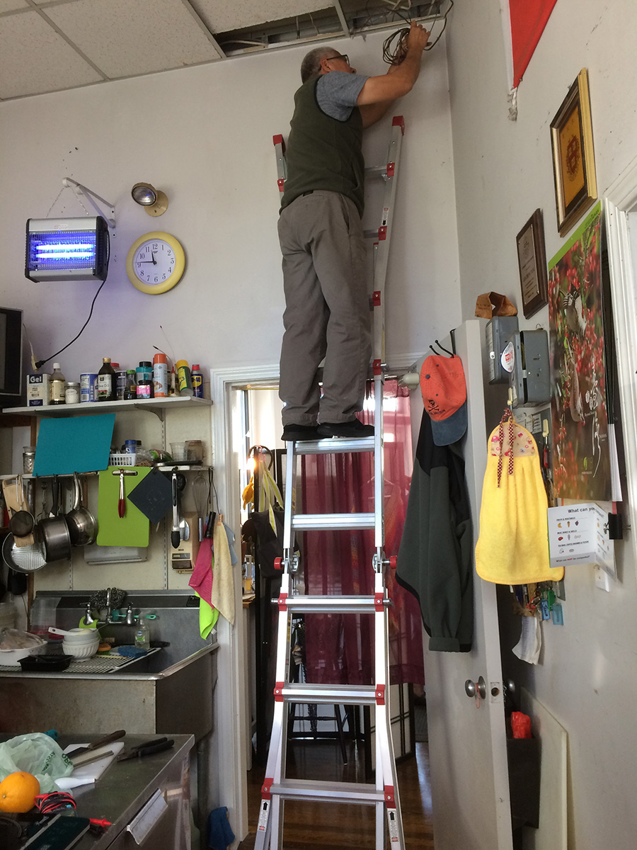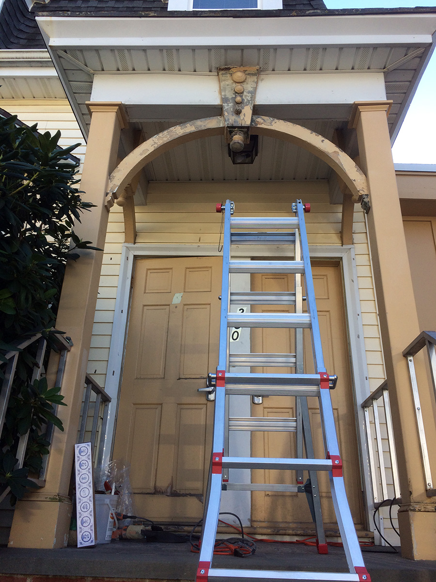 i didn't start working until around noontime. there was something automatic to it, like i was on autopilot. i wouldn't call myself a painter but i seem to have a lot of experience with it and know what i'm doing. i had a choice between two pieces of equipment to strip the paint: heat gun or orbital sander. after setting up the multiladder, i decided to go with the heat gun first. heat gun removes more paint, and litte soft then brittle strips of old paint are easier to clean up compared to sanding particles.