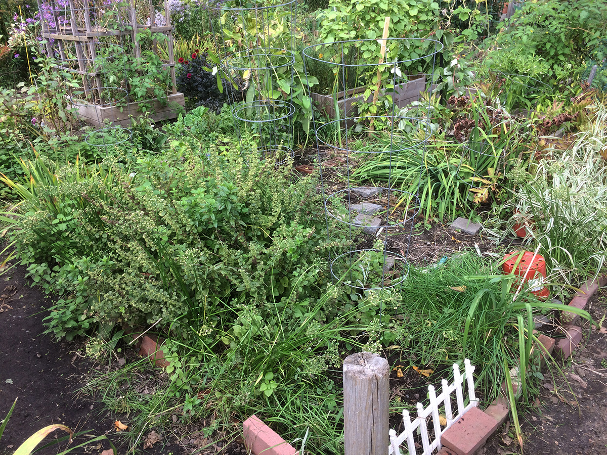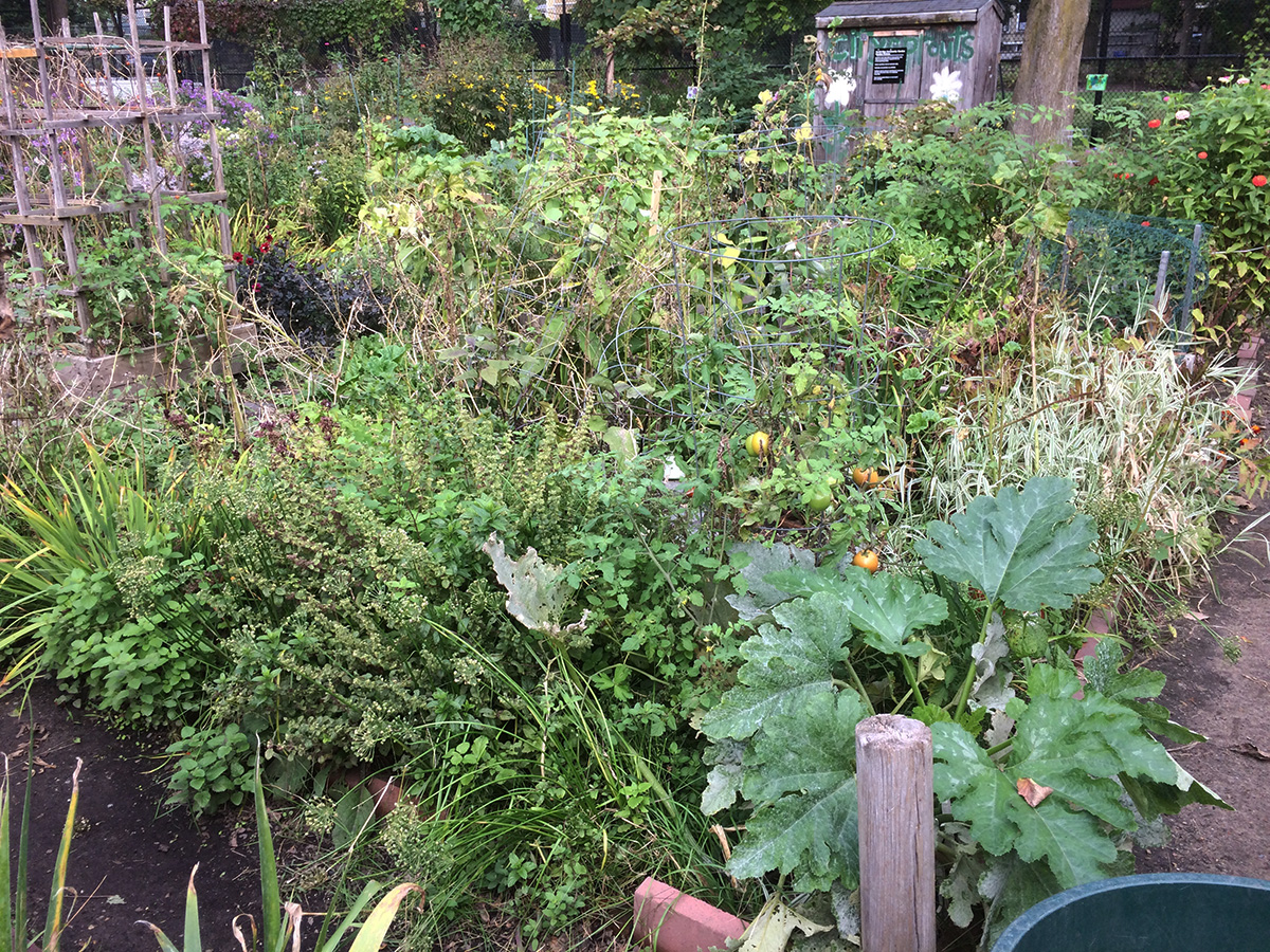 i went down to the community garden this morning to clean up my plot before heading down to porter square to watch the honk parade at noon. it was surprisingly humid and warm outside, 75°F. there wasn't much to do, just pulled up some dead plant stalks. i'll come back in a few weeks to cut everything down to the roots, once we have our first killing frost. i may also think about relocating my poisonous monkshood plant. it didn't flower this year because it was eclipsed by the rampant striped mallows.