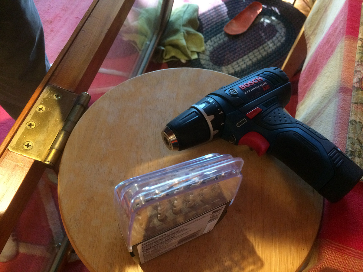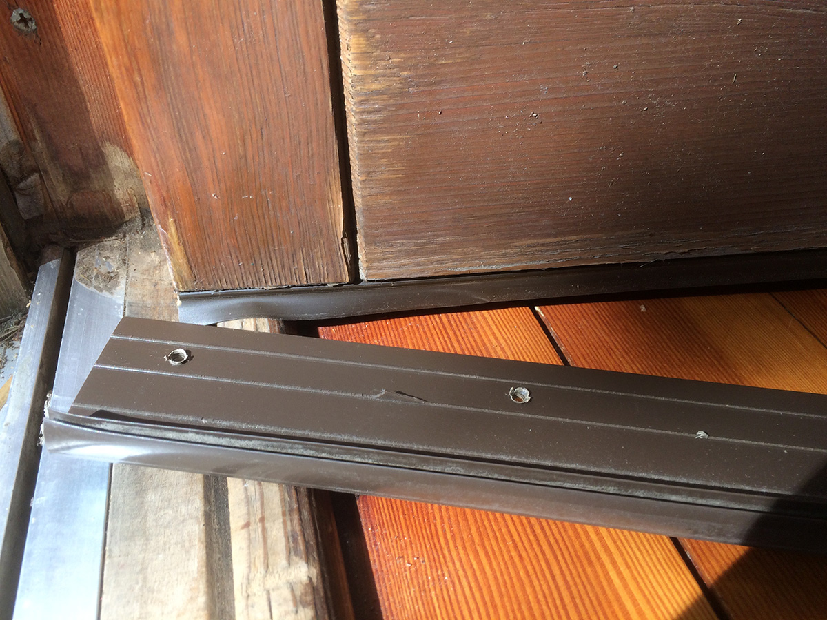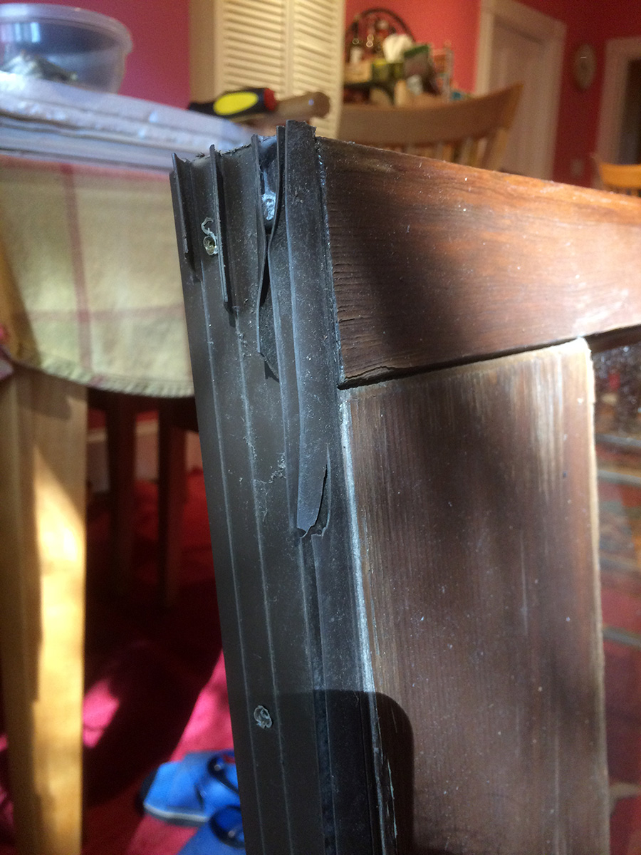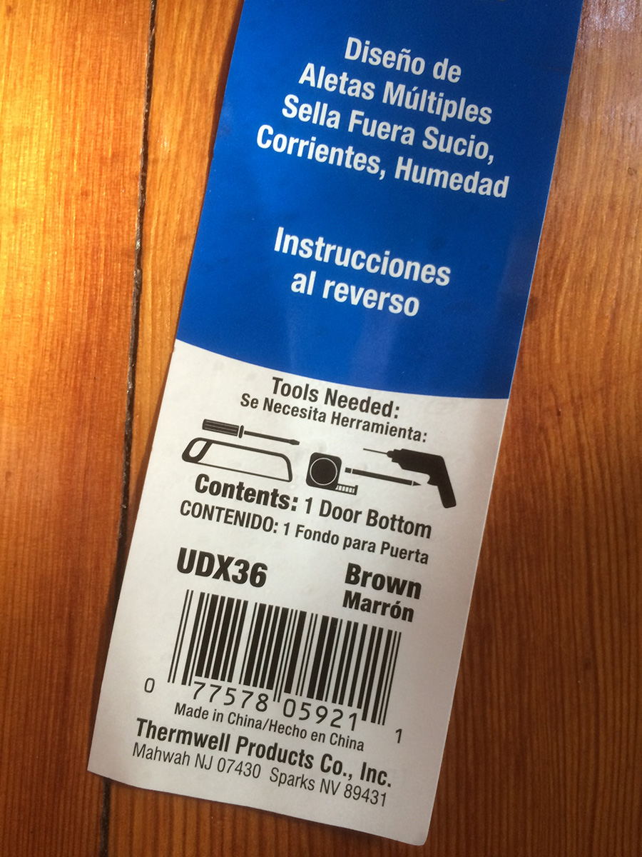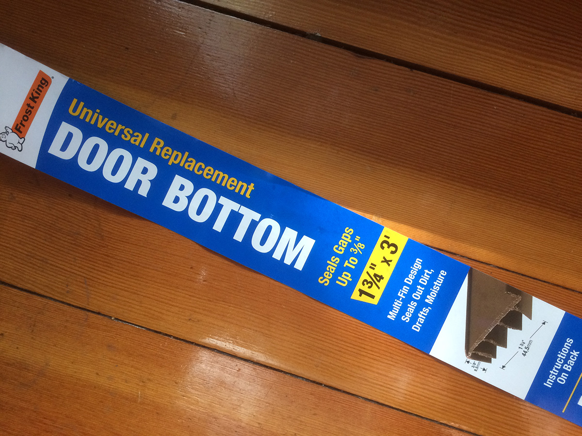 instead, we have to remove the hinges themselves from the door frame. since we had the old door bottom (minus the insulating fins), we used it as a template to figure out where to drill the screw holes. we also used the old door bottom to figure out how long the new bottom should be. once the new bottom was tightly screwed onto the door, we put the door back onto the frame. that was actually the hardest part, as the french door was actually quite heavy (which is good, you don't want an exterior door to do so light somebody could just smash through it). while my father put in the few initial screws, i was in charging of either lifting or lowering the door so the hinges sat flush with the door frame. we were finally done by 11:30am. now i no longer have a big gap underneath my back door that i can see through, and the 5 fins of the new door bottom will keep the draft outside. the only loser here is the door snake, now out of a job. i'm sure in a few years, when the door bottom wears away, the snake will be back.