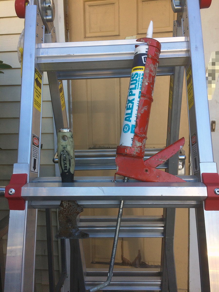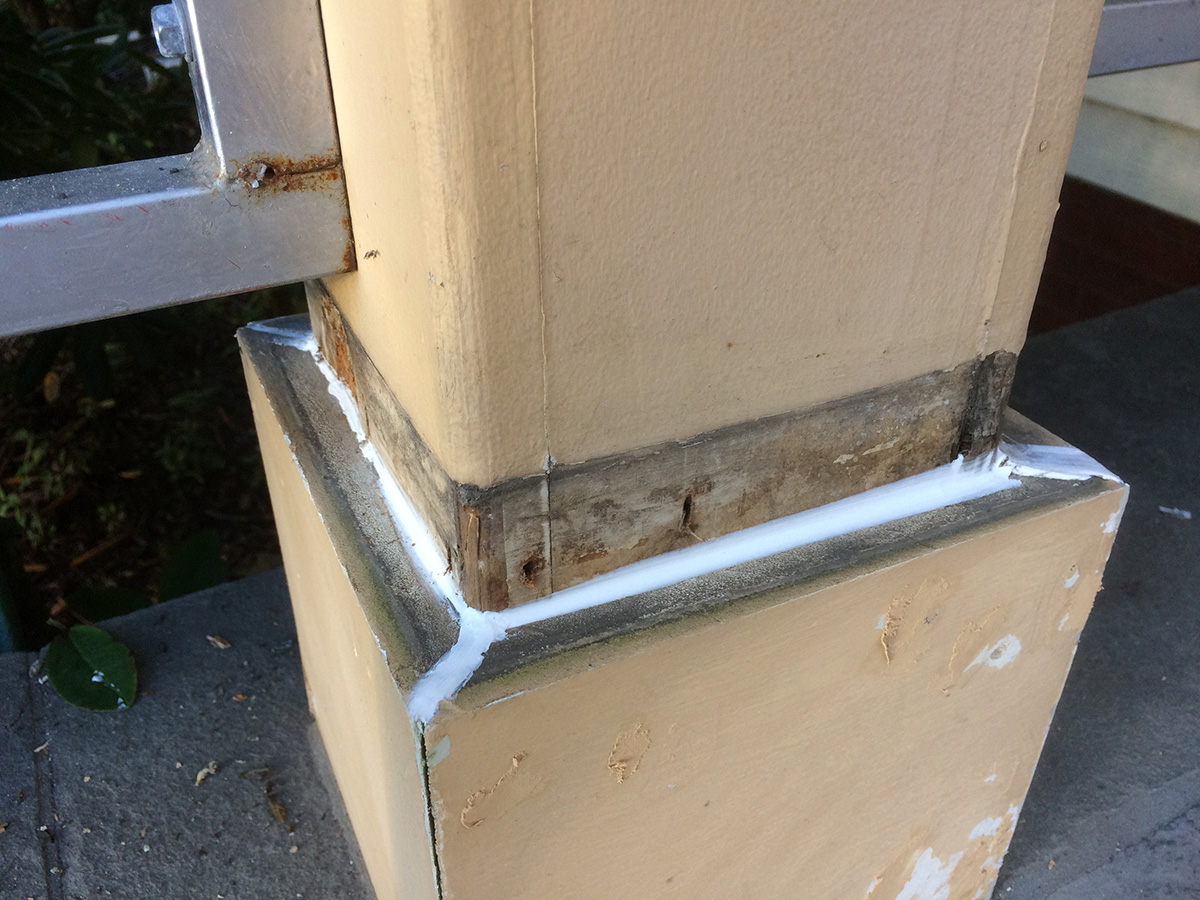 while thinking about what to do for the column rots, i went ahead patching any holes or uneven surfaces with wood filler. plastic wood works great, but it dries pretty fast, and i could already see the surface of the wood filler drying up in the can as i did my patch work. after that i went ahead with the caulking. basically any seams where water my collect needed some caulk. the hardest parts were the joints where the arches met the columns; space was tight, i couldn't get the caulking gun nor even my finger down into the gap. instead i would dribble caulk into these crevasses then using a wet paper towel press the smooth the caulk into place.