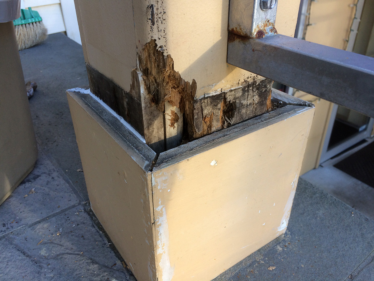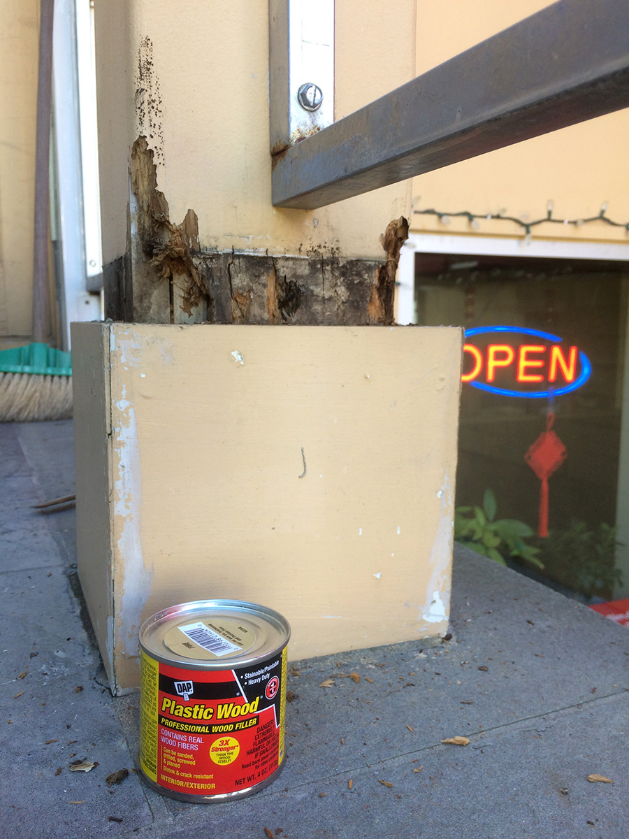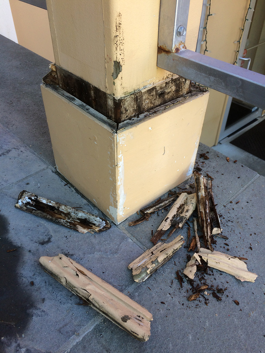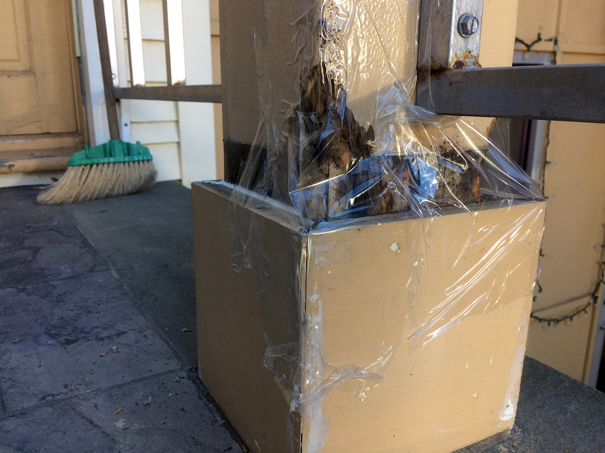 my plan today was to do some patch work, a combination of wood filler and caulk, and depending on how long it took it dry, i would also apply the first coat of primer paint. however, paint prep work is like doing an audit on the overall condition of the work surface; if there's something wrong with the house, i will find it. i already knew the molding around the bottom of the porch columns had a bit of rot. when i gave it a closer inspection, i discovered all the molding were rotten, and the rot had gotten to small parts of the columns themselves, like cavities.