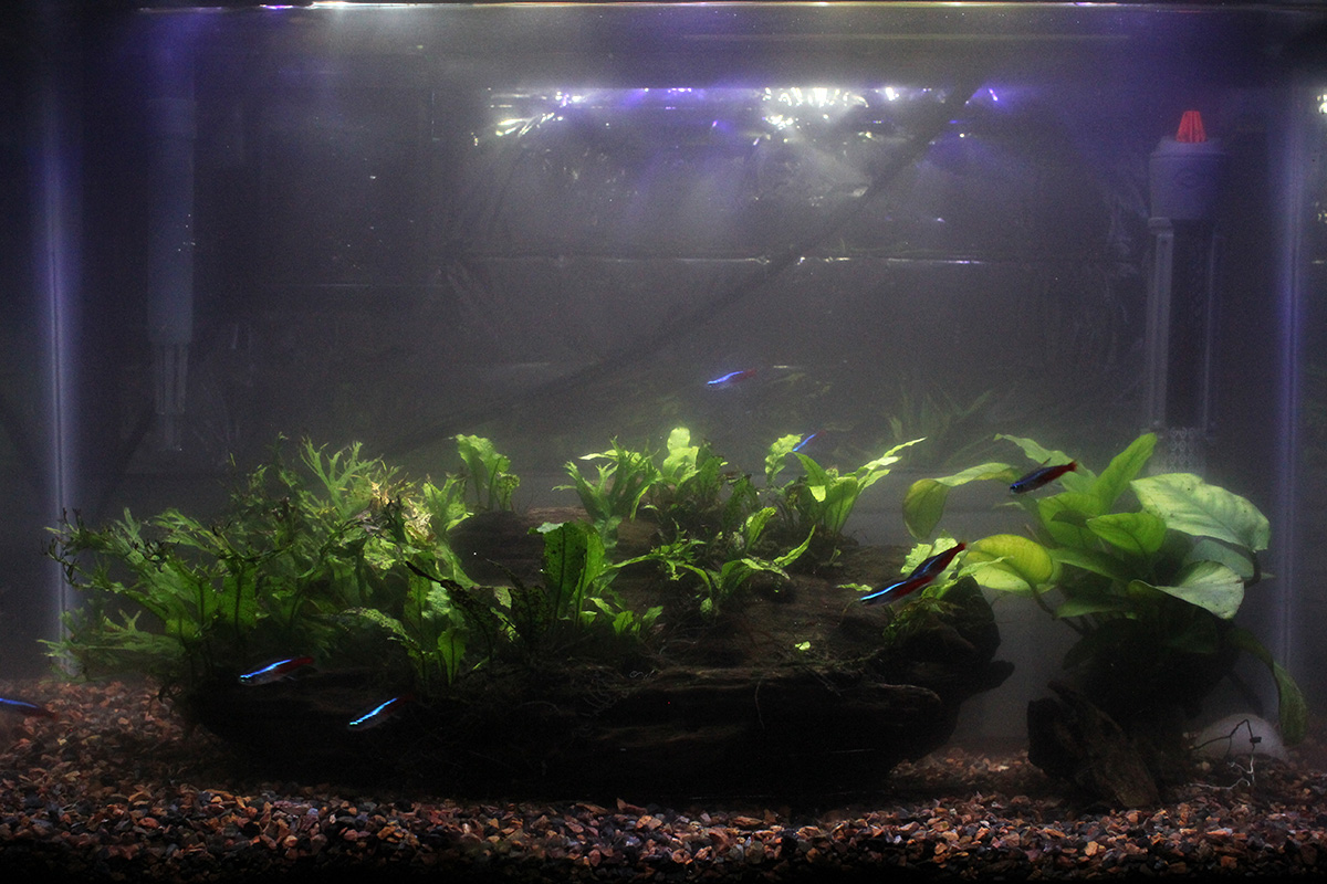 i finally got around to cleaning my aquarium. the last time was in early august, so it seems like every 2 months i do a cleaning. if i was a more responsible fishkeeper i'd do it at least once a month. i did a thorough cleaning, changing the activated carbon and removing the planted driftwoods to gently scrubs the leaves between my fingertips in the sink. i also used my temperature gun to measure the water temperature from the tap - which is much quicker and convenient - instead of using a floating thermometer.