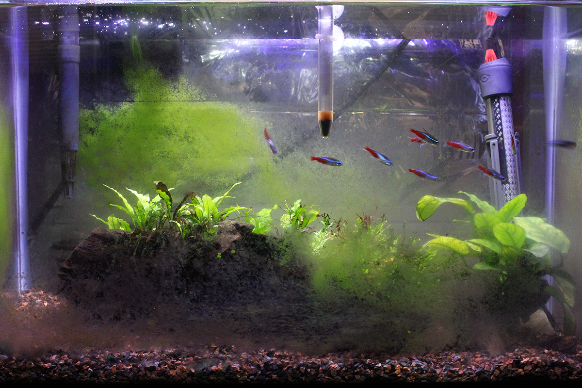 ever since i realized i could do water changes instantly with treated tap water, my aquarium life has been much easier, so there really is no excuse for not cleaning more often. the fish don't seem to mind (i haven't lost any and they seem healthy enough) and i can adjust the water temperature. the way i did it before, with the cistern, in hindsight that was a bad idea because the water sits there for weeks and even months, and occasionally weird light-free algae grow in the cistern. also the water is always room temperature, and during the winter it's too cold and in the middle of the summer it's too warm.