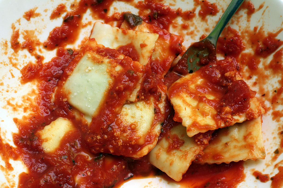 i had spinach and cheese ravioli for dinner. it's sort of one step removed from processed food (or maybe it is processed food), but it's easy to prepare and i feel stuffed afterwards. $1 for a bag of frozen raviolis (single serving), $2.50 for a jar of pasta sauce (enough for 2 servings), some powdered parmesan cheese as a topping.