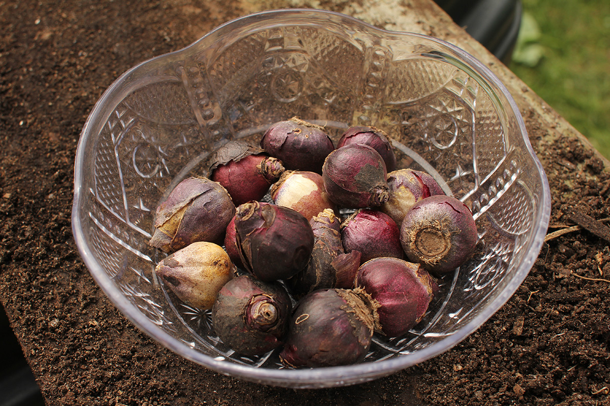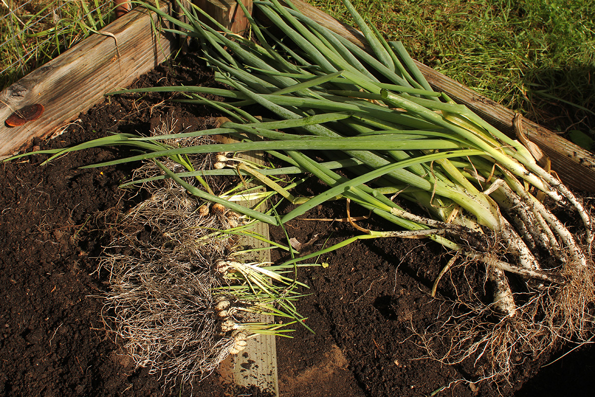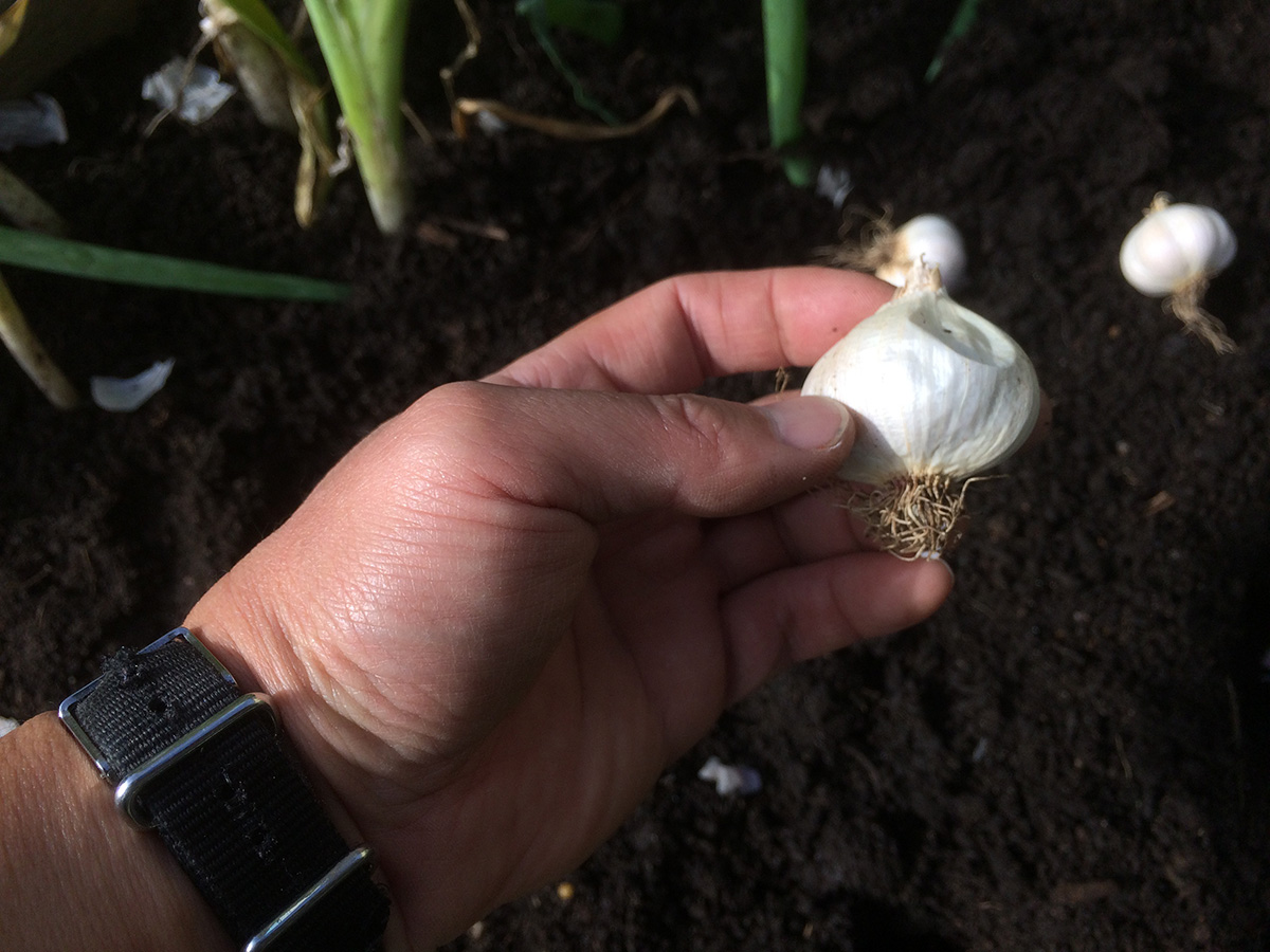 i dug out all the scallions, which i will plant back. these scallions aren't anything special, just remaining scallion roots we bought from the supermarket and replanted. they look nothing like store scallions, which are pencil thin. these are thick, like broom handles, more leek than scallion. also when i was tilling the soil i found a lot of garlic bulbs. they were already sprouting, so it made it easier to find. at first i thought they were hard neck garlics i planted last fall that i failed to dig out, but i think they're actually normal store bought garlics my father decided to plant for fun to see if they'd produce more garlic. i dug them all out and set them again to be replanted later.
