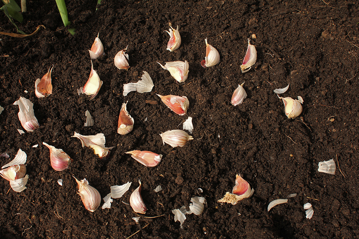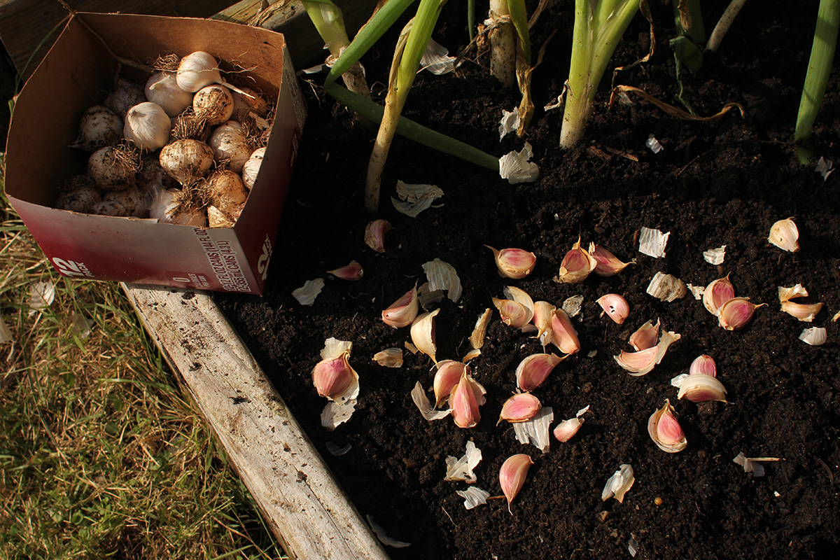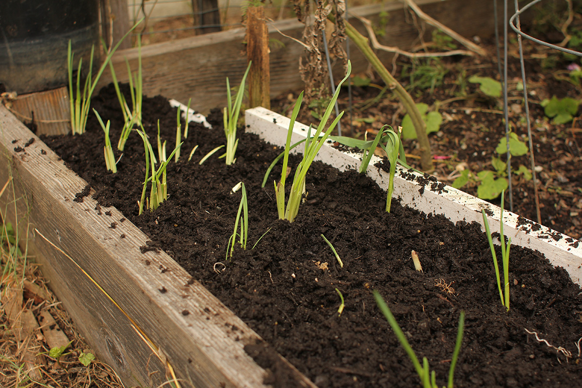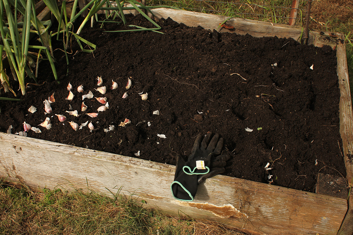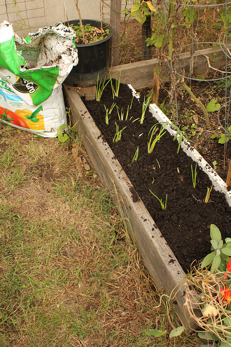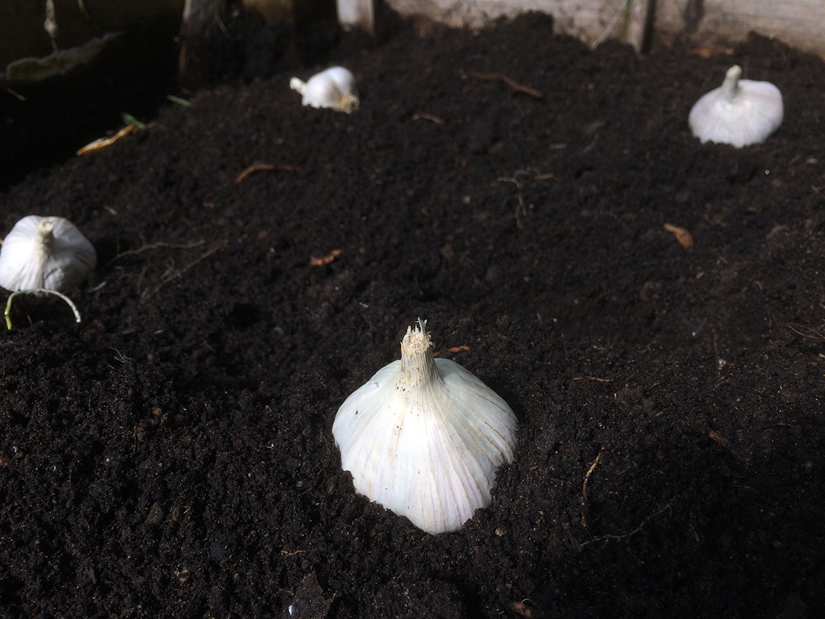 back in belmont, after offloading the bags of garden soil into the backyard, i ended up emptying 2 bags of soil into RB0. the new garden soil was on the wet side and had a rotting smell which reminded me of manure. i mixed it with the existing soil to give it a drier consistency. i replanted the scallions back in their original spot. with the rest of the bed i started digging holes with my fist, about 2-3 inches deep and 6 inches apart. instead of rows, i did a honeycomb pattern. i thought i'd have a lot of red korean garlic cloves left, but i ended up using 6 bulbs, as each bulb only contained 6-7 cloves. i still have 5 more bulbs, which i will plant elsewhere (most like RB2). i read it's important to have light, fluffy soil so the garlic roots can have an easier time growing. after filling the bed, i still had a bit of room, so i separated some of the garlic bulbs i grew this season and planted the cloves. these are also hard neck (like the red koreans) but i don't know which variety. i also grew them from very small cloves, and they're not very big yet, although bigger than what they were before. growing garlic takes patience, as i won't be able to harvest these garlics until the summer, so it's going to take 9-10 months.