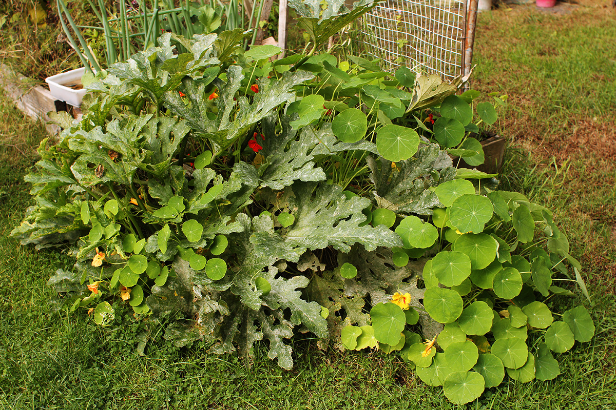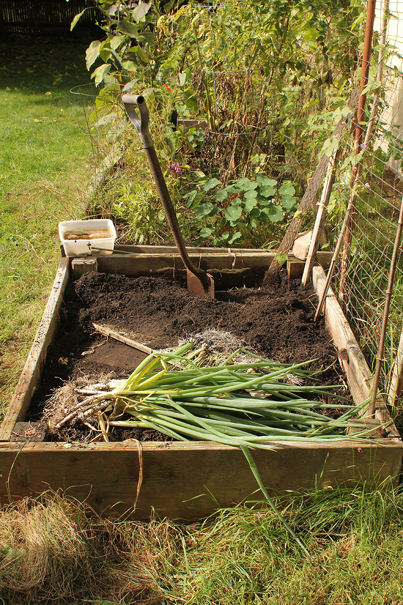 i went into the backyard and started preparing raised bed 0 (RB0), the one closest to the back entrance, the smallest bed. it's where i grew my garlics this season, and i wanted to convert the entire bed to growing just garlic, with the possibility of some cucumbers on trellises and nasturtiums in the corners come next summer. there was currently still a large zucchini squash and some nasturtiums. i pulled the squash even though there were still a few baby squash; i figured this week there might be a killing frost, many of the leaves are already diseased, and it simply wasn't warmer enough for the tiny squash to mature. after pulling it out, i decided to get rid of the nasturtiums as well, so i could completely till the bed.