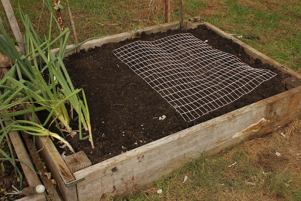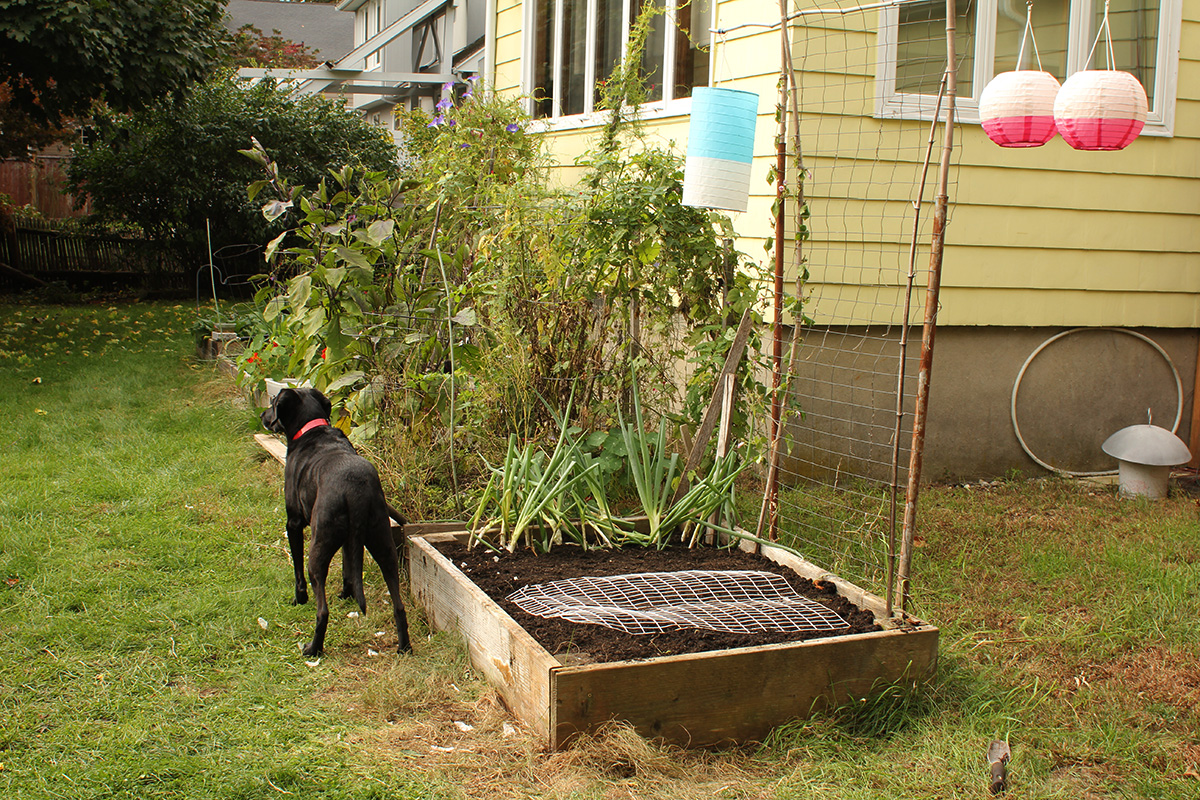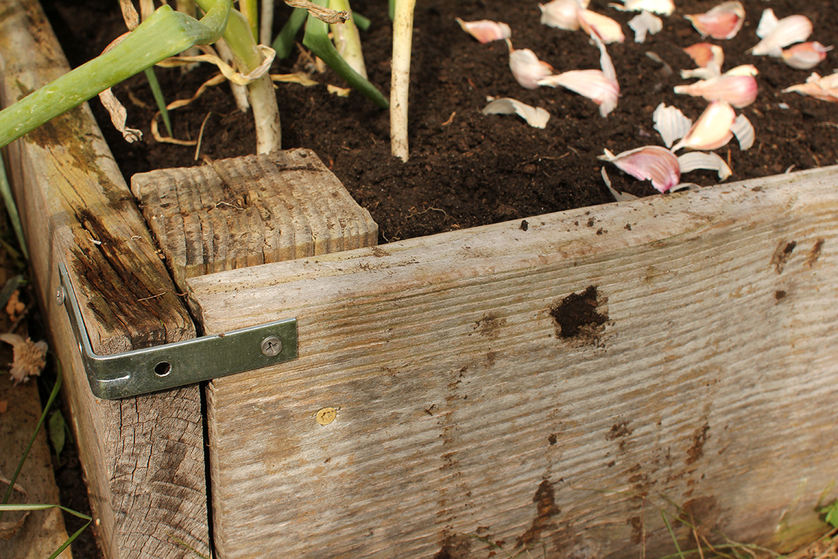my sister was originally going to take hailey for a walk in the woods, but when i told her i needed a ride back to my house (otherwise i'd need to take the bus, and sunday buses run just every hour), she waited around until i finished with my garlic planting. i also planted some spring beauties (Scilla siberica) i bought from OSJL. and those regular garlic bulbs i found, i replanted them along the side of RB1 after sectioning it off and filling the "well" with fresh garden soil. my sister also helped me to fix the splitting corner on RB0 with a metal L-bracket.