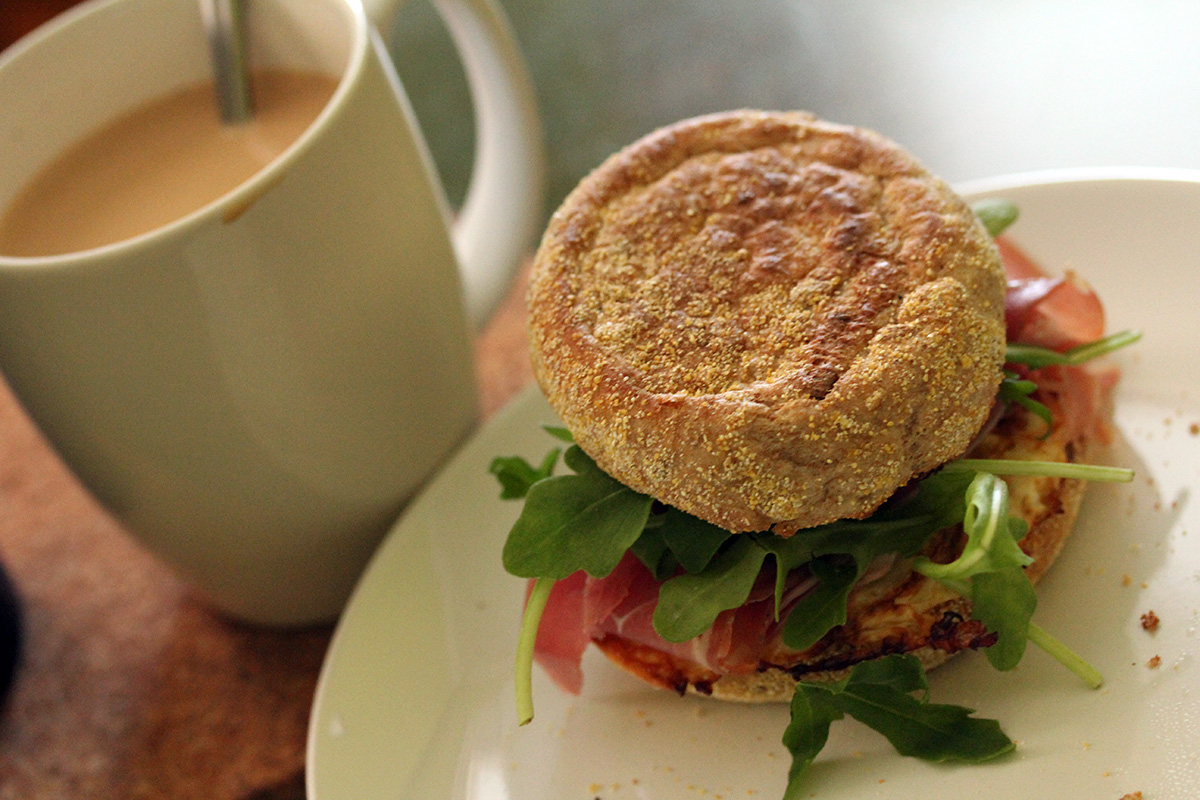 i slept early last night so was able to wake up early as a result. because of 2 days of rain, i haven't done any paint prep work since monday, so i was ready to get back to it. i made myself some moka pot coffee (can you believe it been more than 3 weeks since i last had coffee? definitely not an addict) and one of my fancy breakfast sandwich: egg & prosciutto & goat cheese & arugula on a whole wheat english muffin.