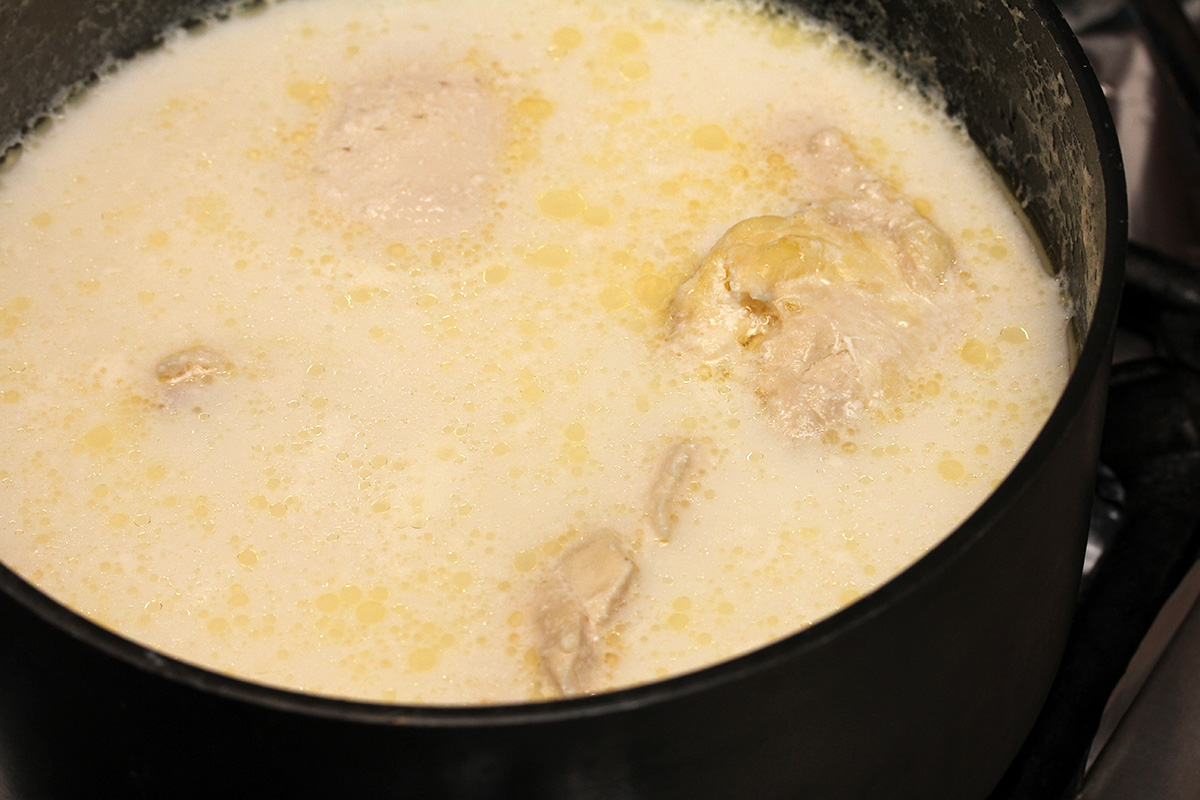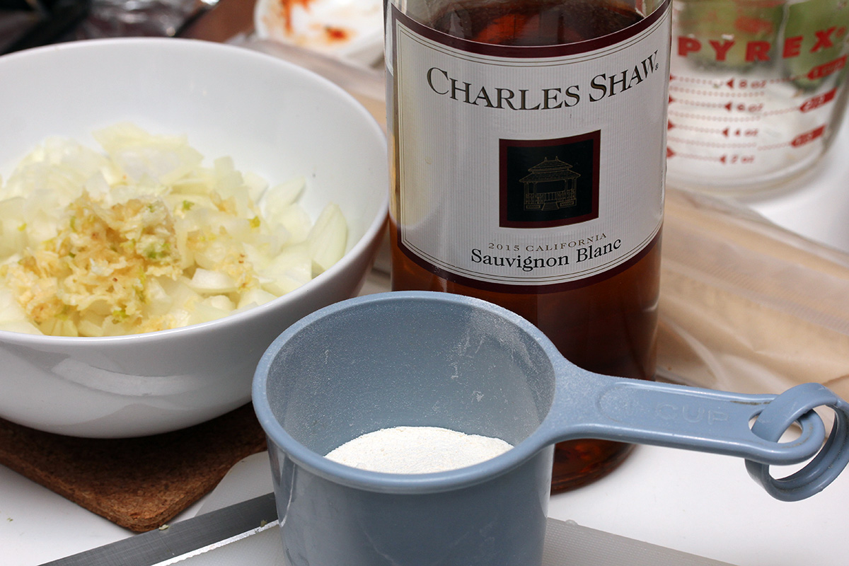 2 instant pie crust 3 tbsp butter 1/3 cup flour 1 can chicken broth (2 cups) 1 cup milk 1/3 cup white wine |
