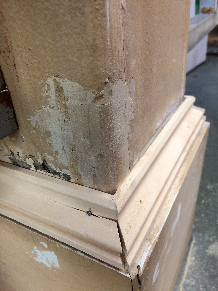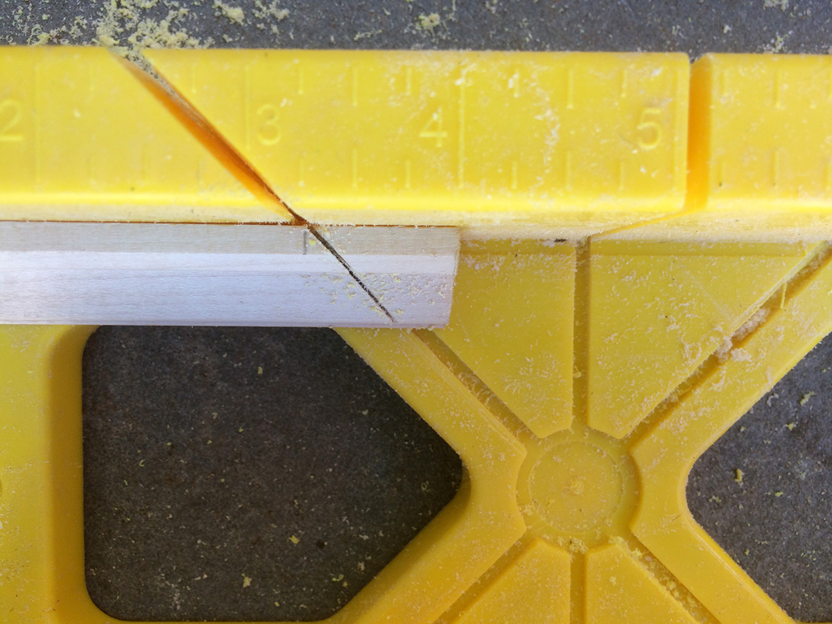 i started by sanding down the patched areas from monday. i then started cutting the molding with the miter box. there's definitely something wrong with the box, it seems to be incapable of making a straight cut, but instead slants the cut so the corners don't match up correctly.