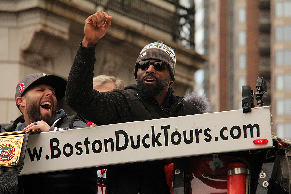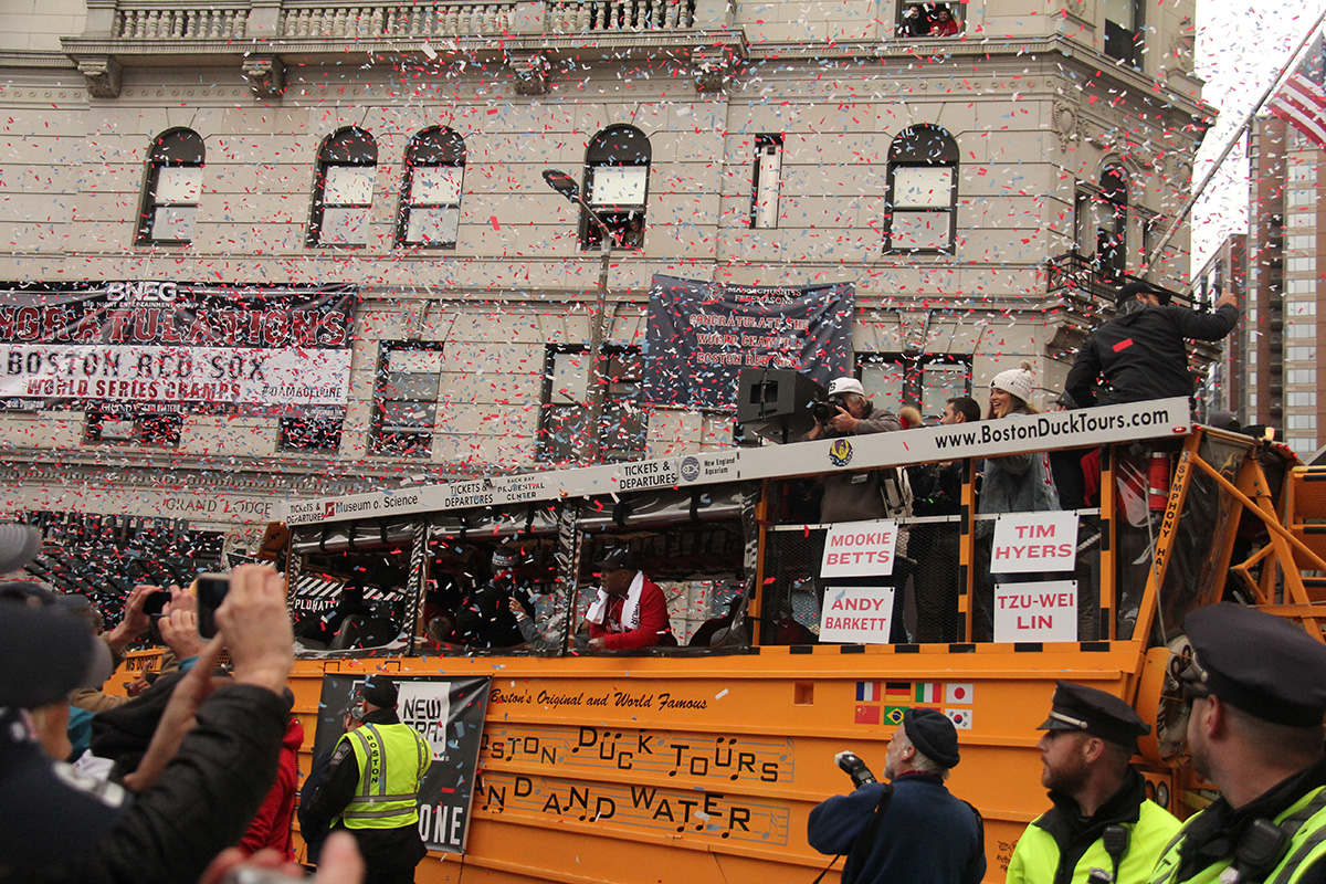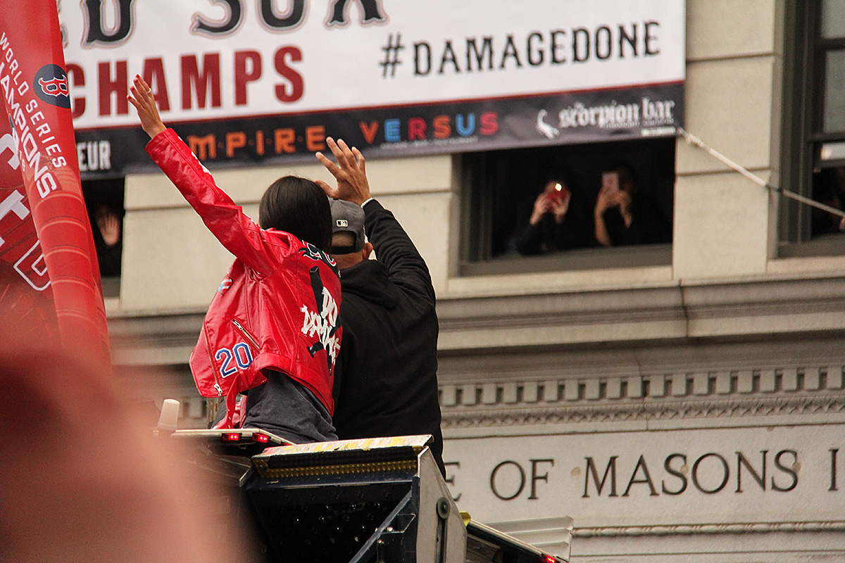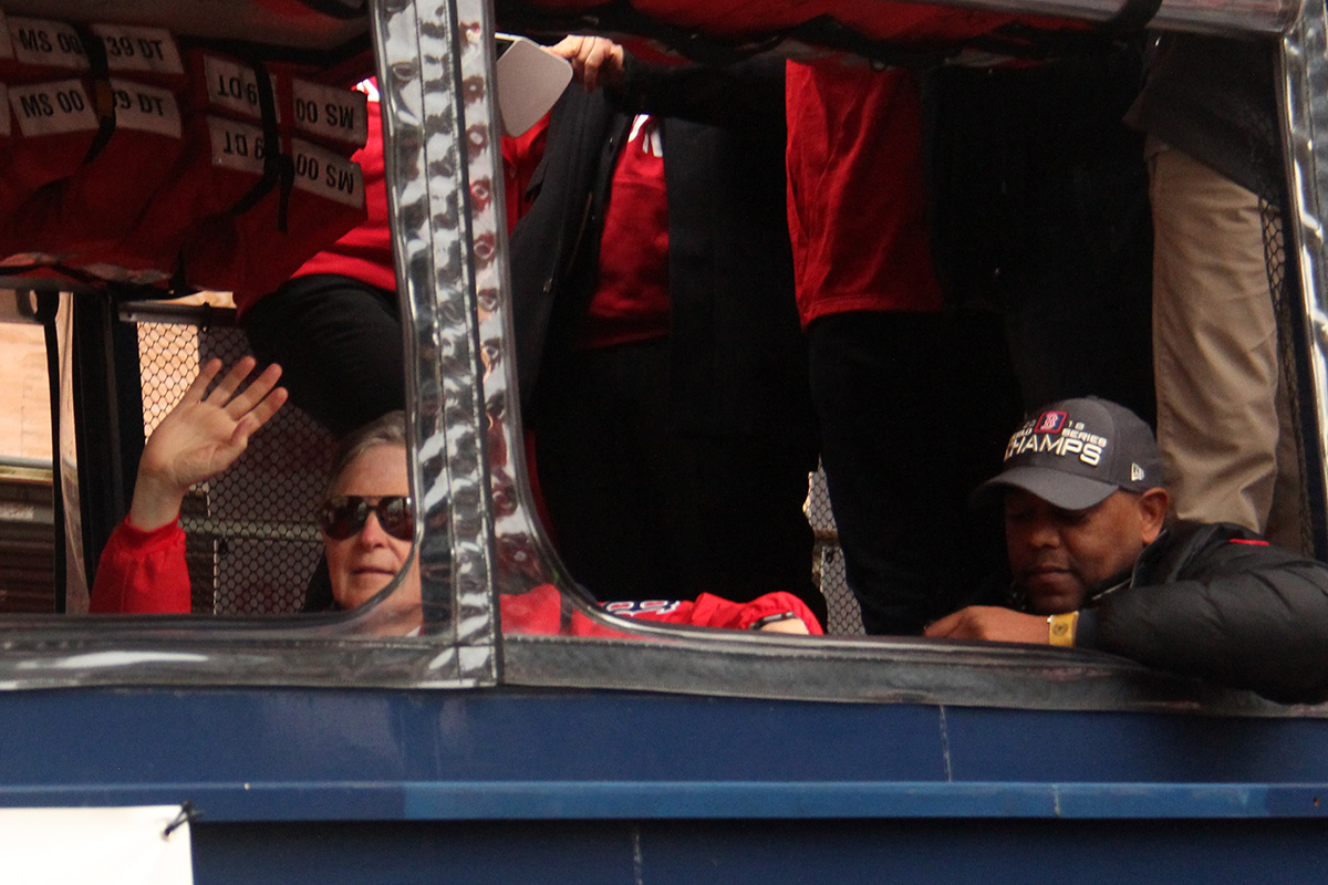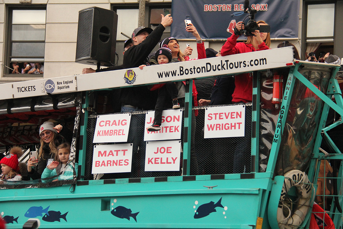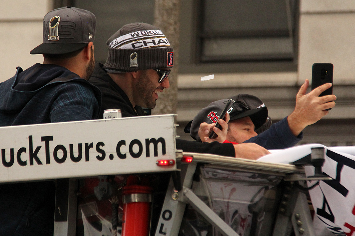 i came to realize pretty quickly that despite the fact that i had a great spot, i wouldn't be able to see any players standing on the other side of the duck boat. so i didn't see david price, or alex cora, or chris sale, or MVP steve pearce, or benintendi (was he even there?), or eovaldi. however, i did see some others: dustin pedroia, jackie bradley jr, rick porcello, mooke betts, joe kelly, and eduardo nuñez. i even saw jerry remy.