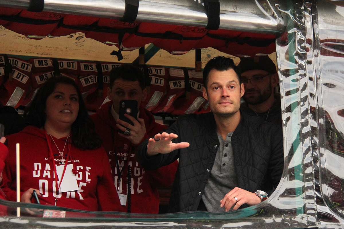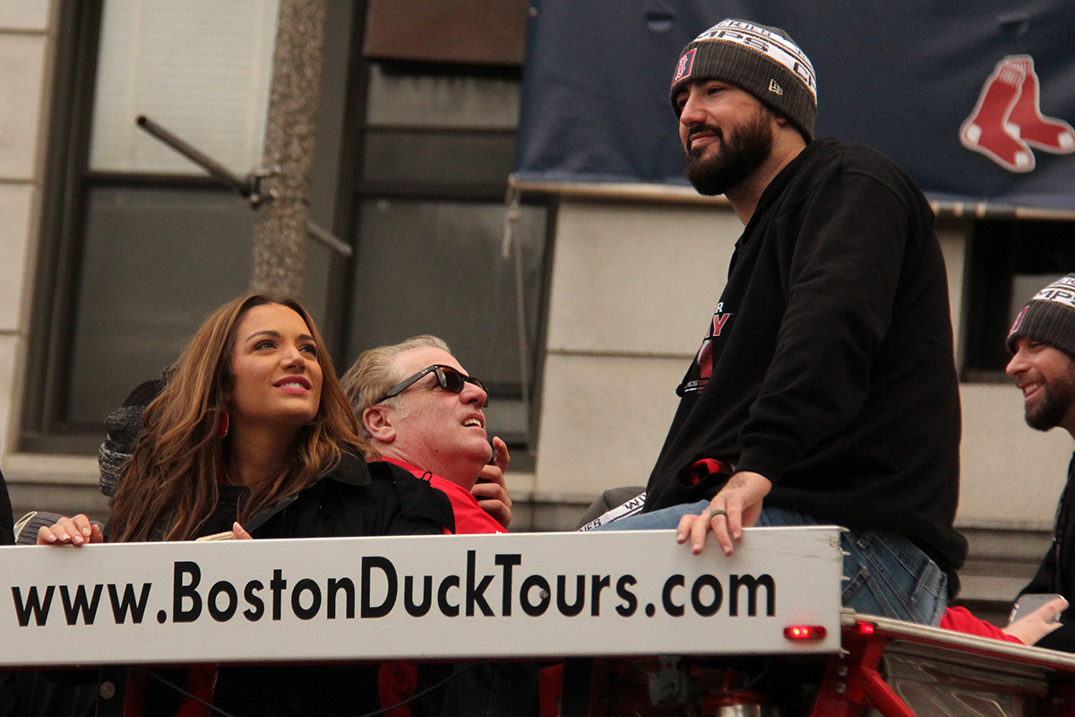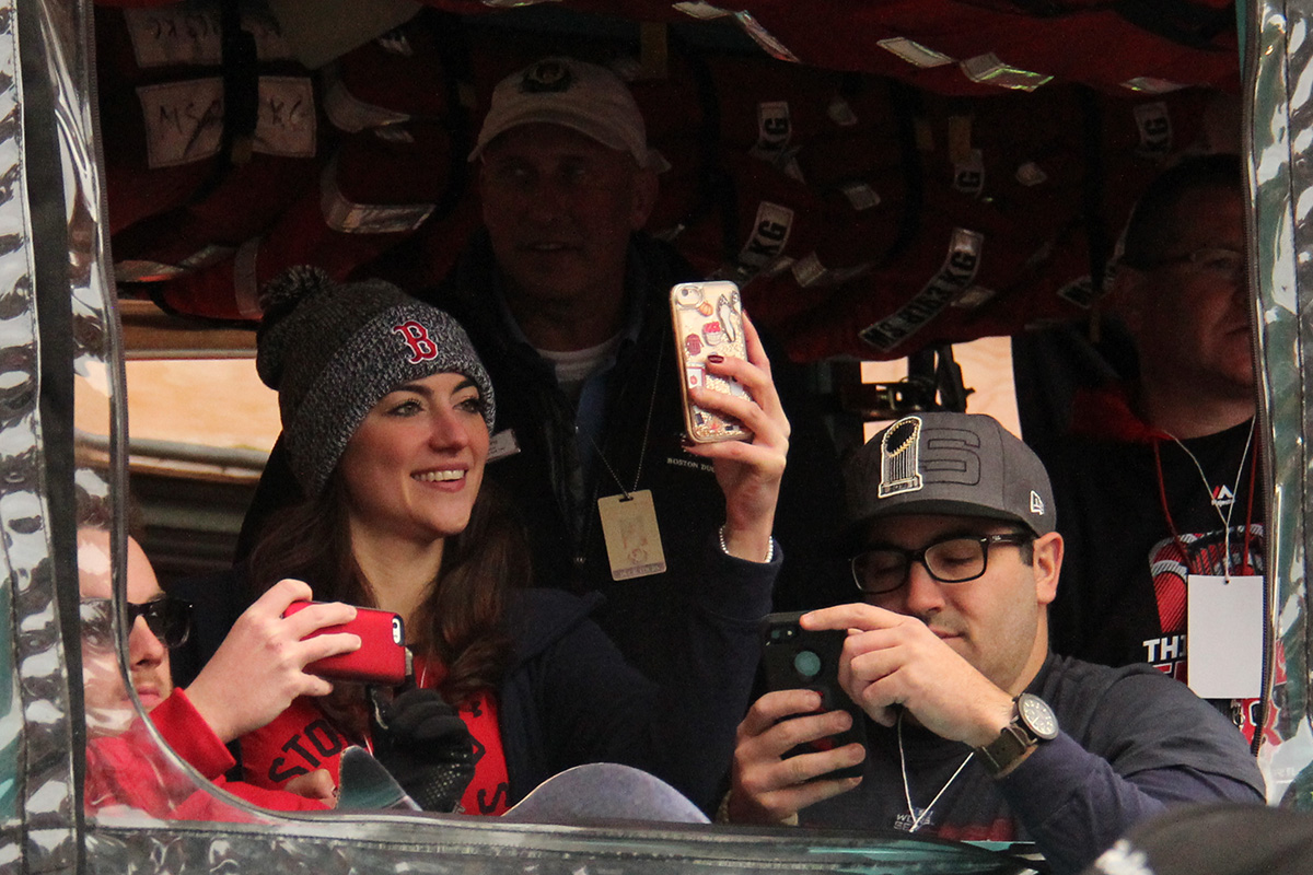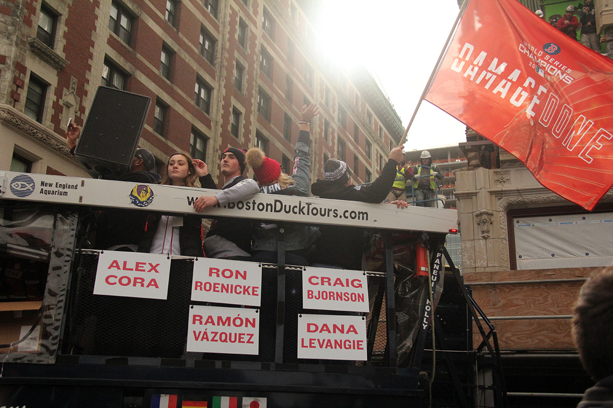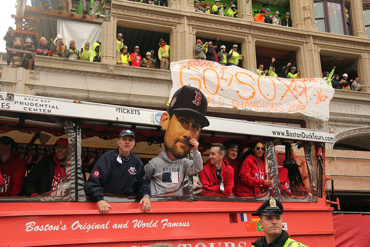 i came to realize pretty quickly that despite the fact that i had a great spot, i wouldn't be able to see any players standing on the other side of the duck boat. so i didn't see david price, or alex cora, or chris sale, or MVP steve pearce, or benintendi (was he even there?), or eovaldi. however, i did see some others: dustin pedroia, jackie bradley jr, rick porcello, mooke betts, joe kelly, and eduardo nuñez. i even saw jerry remy.
