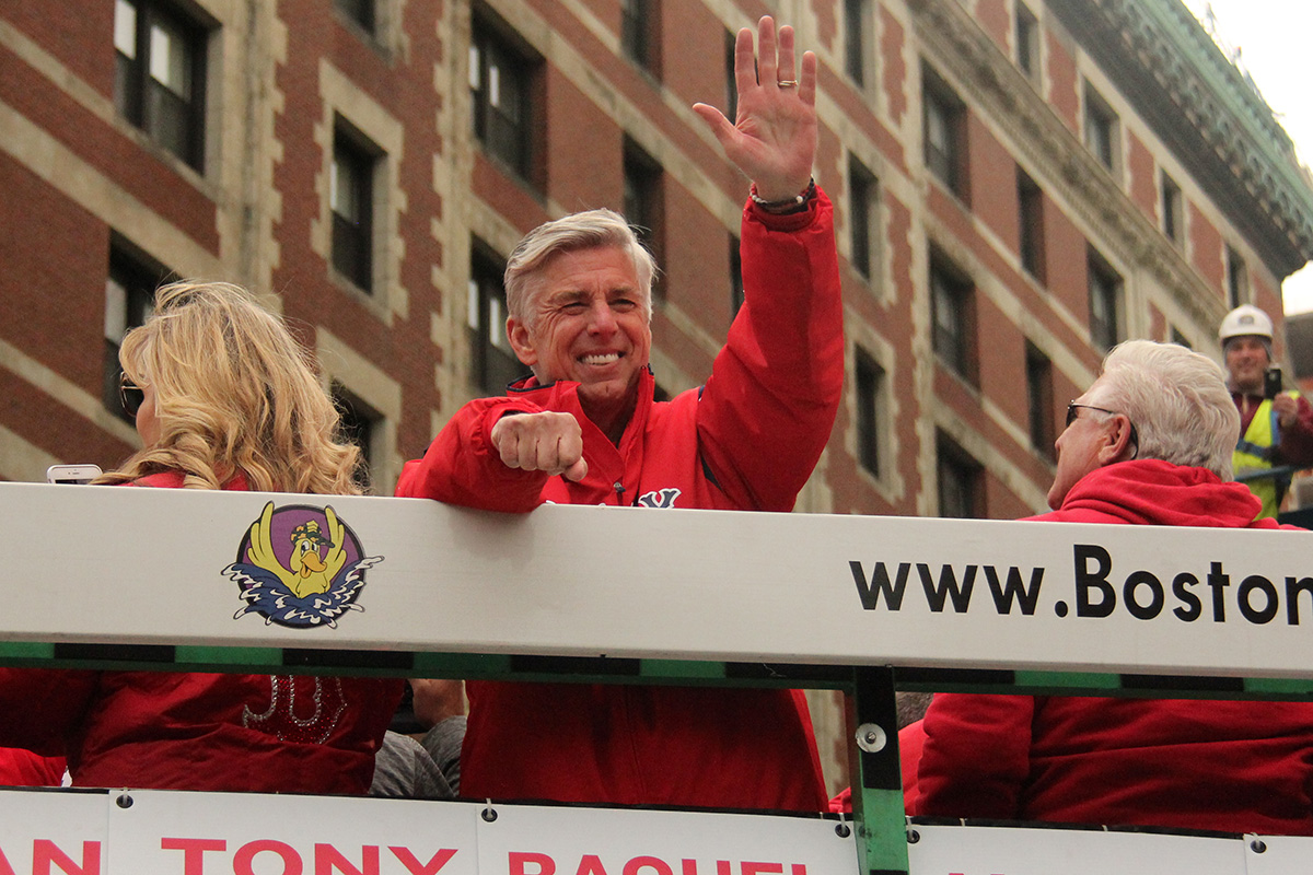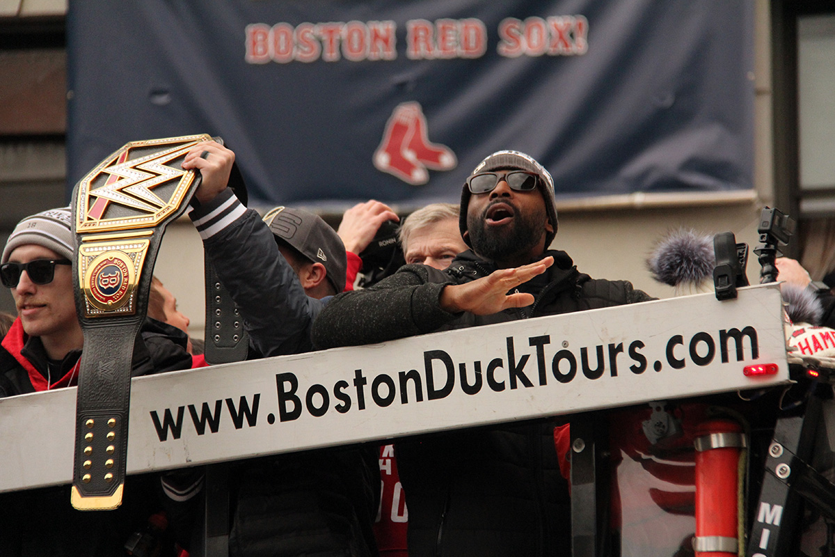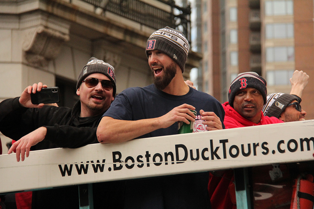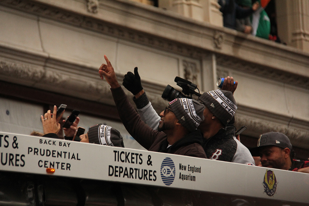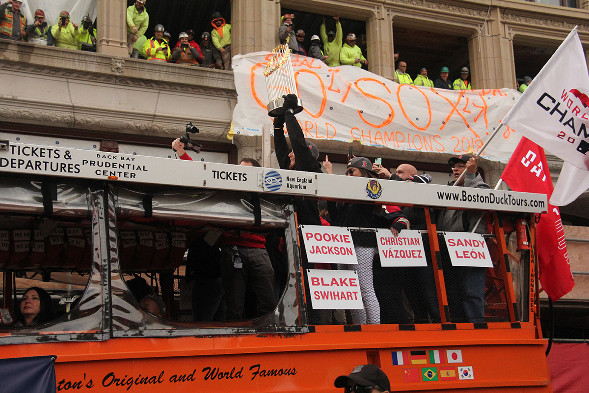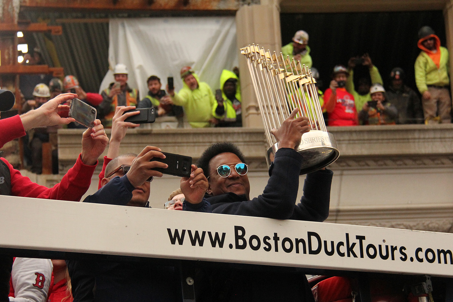 i came to realize pretty quickly that despite the fact that i had a great spot, i wouldn't be able to see any players standing on the other side of the duck boat. so i didn't see david price, or alex cora, or chris sale, or MVP steve pearce, or benintendi (was he even there?), or eovaldi. however, i did see some others: dustin pedroia, jackie bradley jr, rick porcello, mooke betts, joe kelly, and eduardo nuñez. i even saw jerry remy.