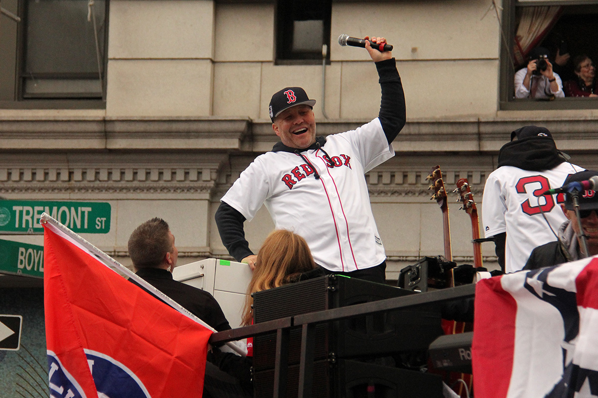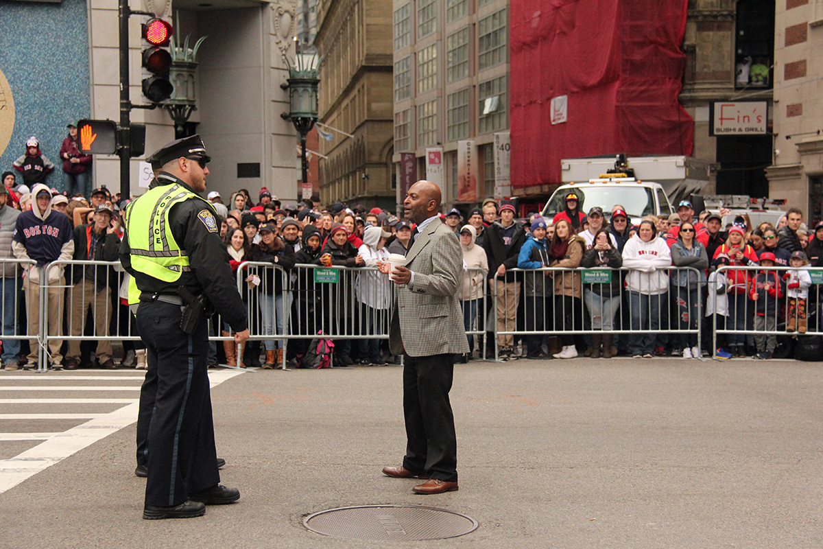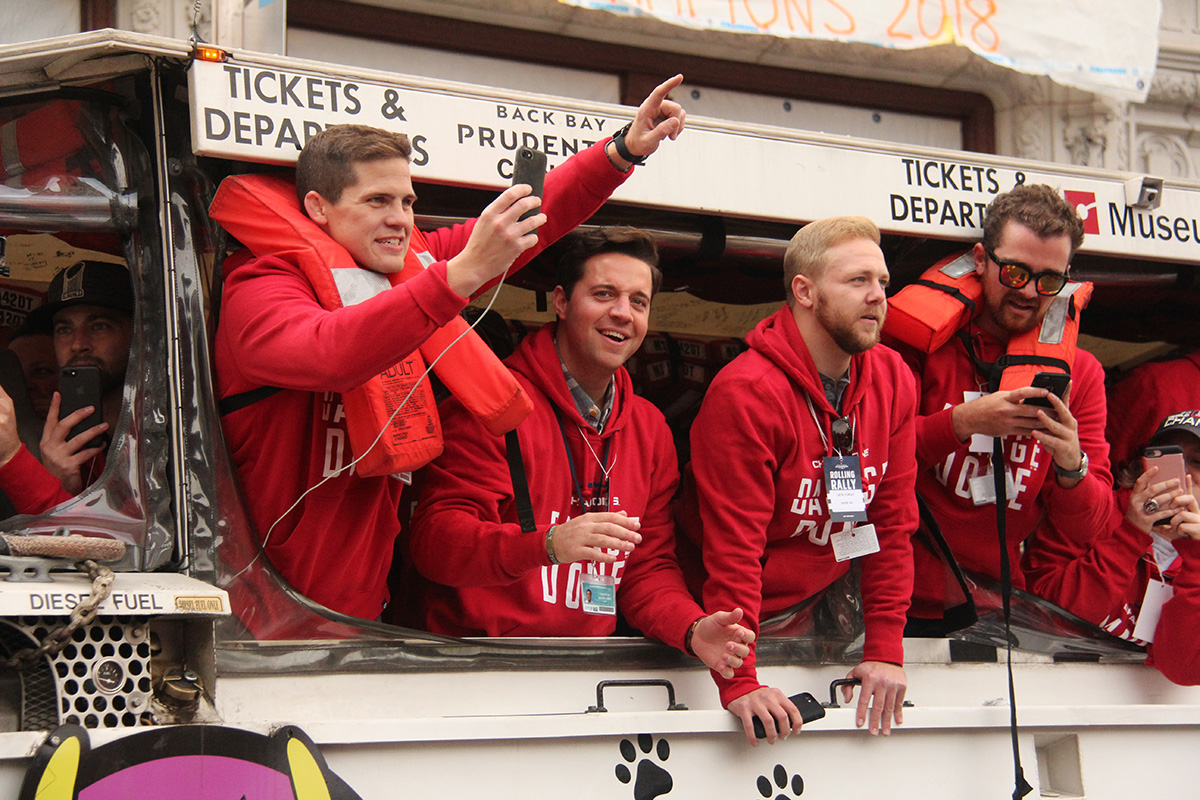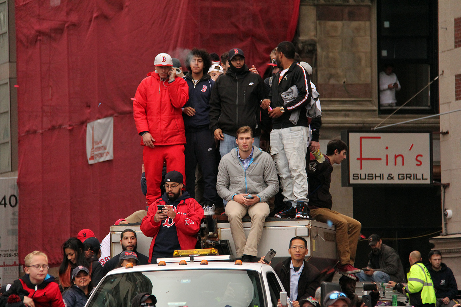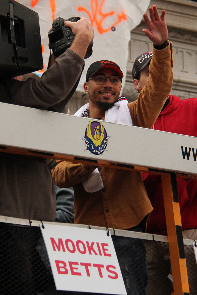 i came to realize pretty quickly that despite the fact that i had a great spot, i wouldn't be able to see any players standing on the other side of the duck boat. so i didn't see david price, or alex cora, or chris sale, or MVP steve pearce, or benintendi (was he even there?), or eovaldi. however, i did see some others: dustin pedroia, jackie bradley jr, rick porcello, mooke betts, joe kelly, and eduardo nuñez. i even saw jerry remy.