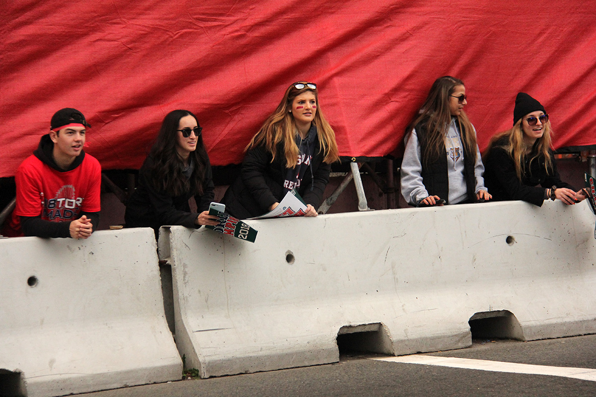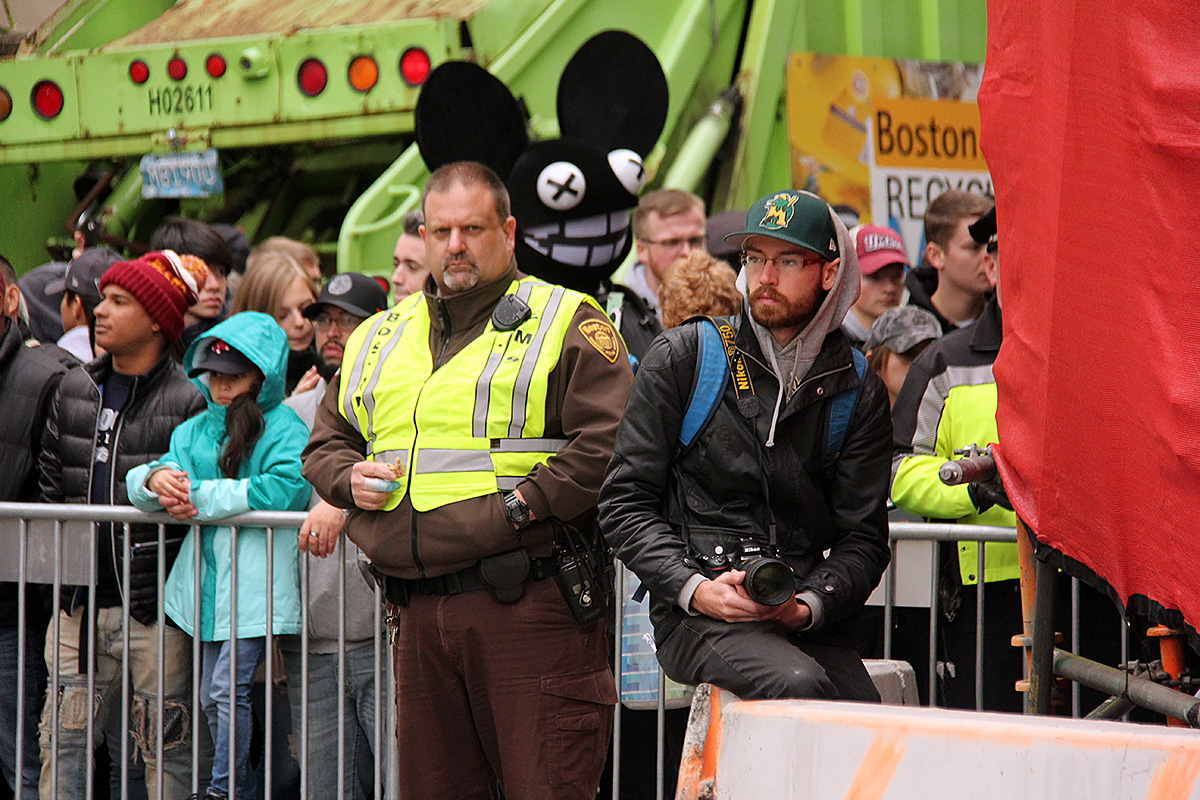 you come early to a parade to get a good spot, especially if you want to get photos and not get a bunch of heads in your shots. already people had staked out claim along the barriers. i was hoping to find a single opening to squeeze through. i thought i found one in front of the masonic lodge, between an older man and some teenage girls. but i should've known it was already taken because the man had his arms outstretched and later i discovered he actually knew the teenagers, and mentioned to them about when somebody they knew was coming back. i decided to look elsewhere while there was time. i returned to the inner corner, which was currently still opened, but eventually would be barricaded up with a fresh front row real estate. i waited between 2 short and pudgy older ladies and a group of coeds. once it looked like the police gave the sign, we all rushed to the barricade, only to realize it was a false alarm, and went back to the curb. when the cops gave the eventual okay, everyone rushed in like a black friday frenzy. i got a spot, but one of the old ladies didn't, so i gave mine up for her, figuring i could still shoot over her head. later when the cops pushed back the barricade to make more room for the oncoming duck boats, that created just enough space for me to squeeze to the front.