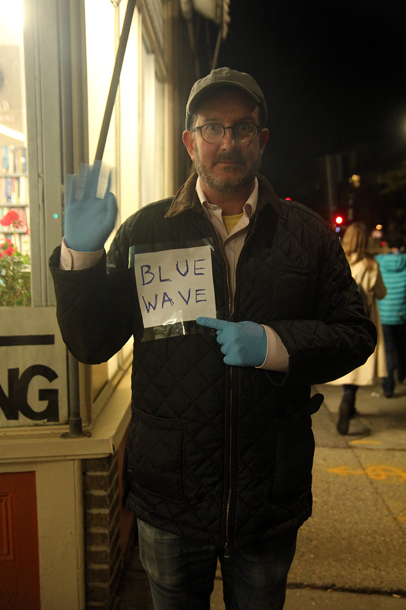 bruce contacted me around 5:30pm, regarding plans to see the halloween festivities around the neighborhood. we decided to meet in an hour, even though i already saw chaperoned children in costumes roaming the streets about an hour ago. bruce asked me to bring a pair of disposable blue gloves when i went over to his place at 6:30pm. it was part of his impromptu costume, "the blue wave."