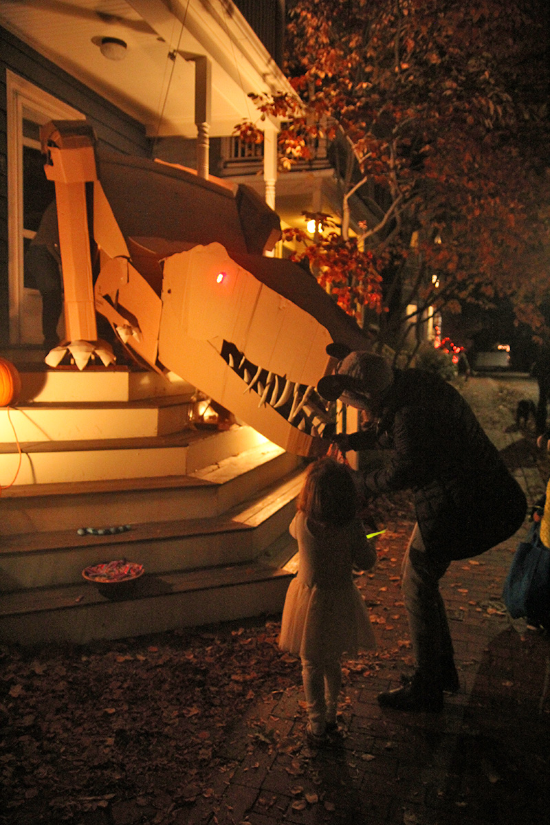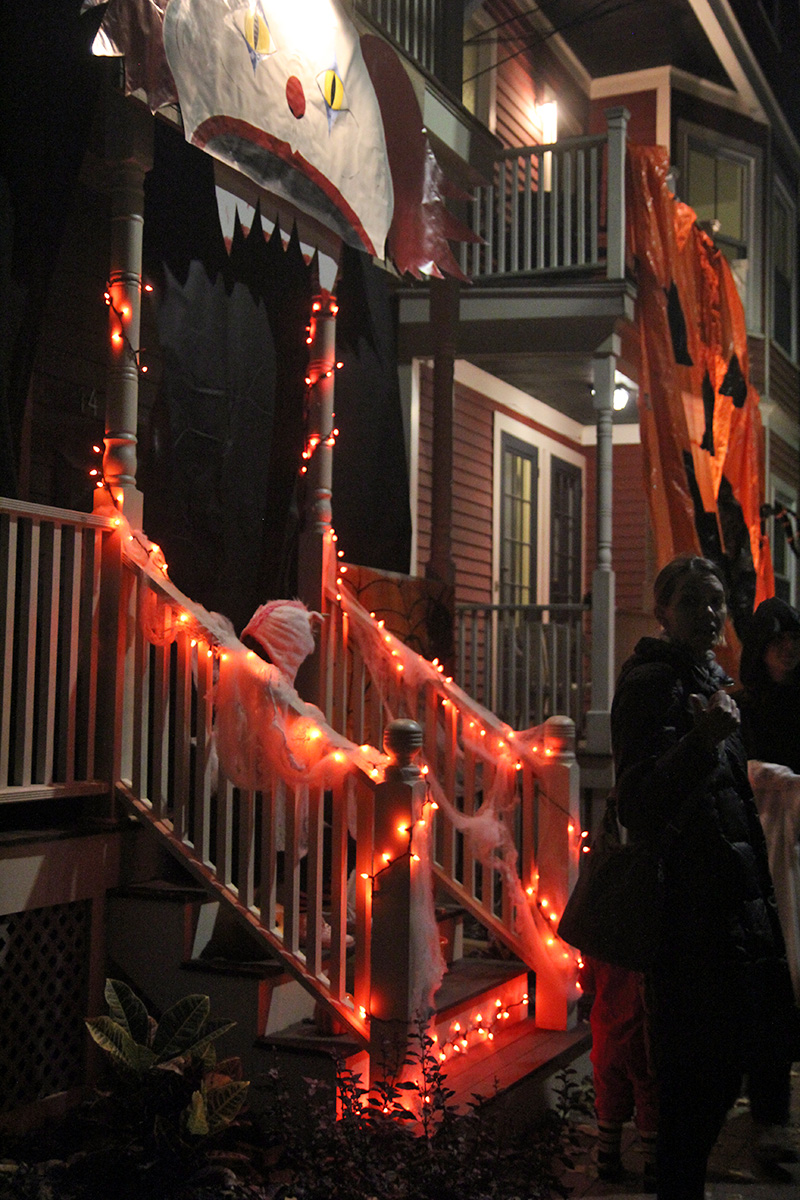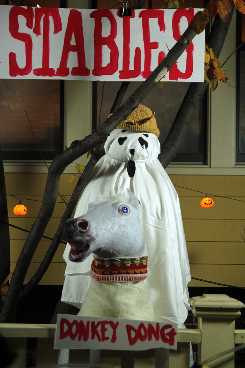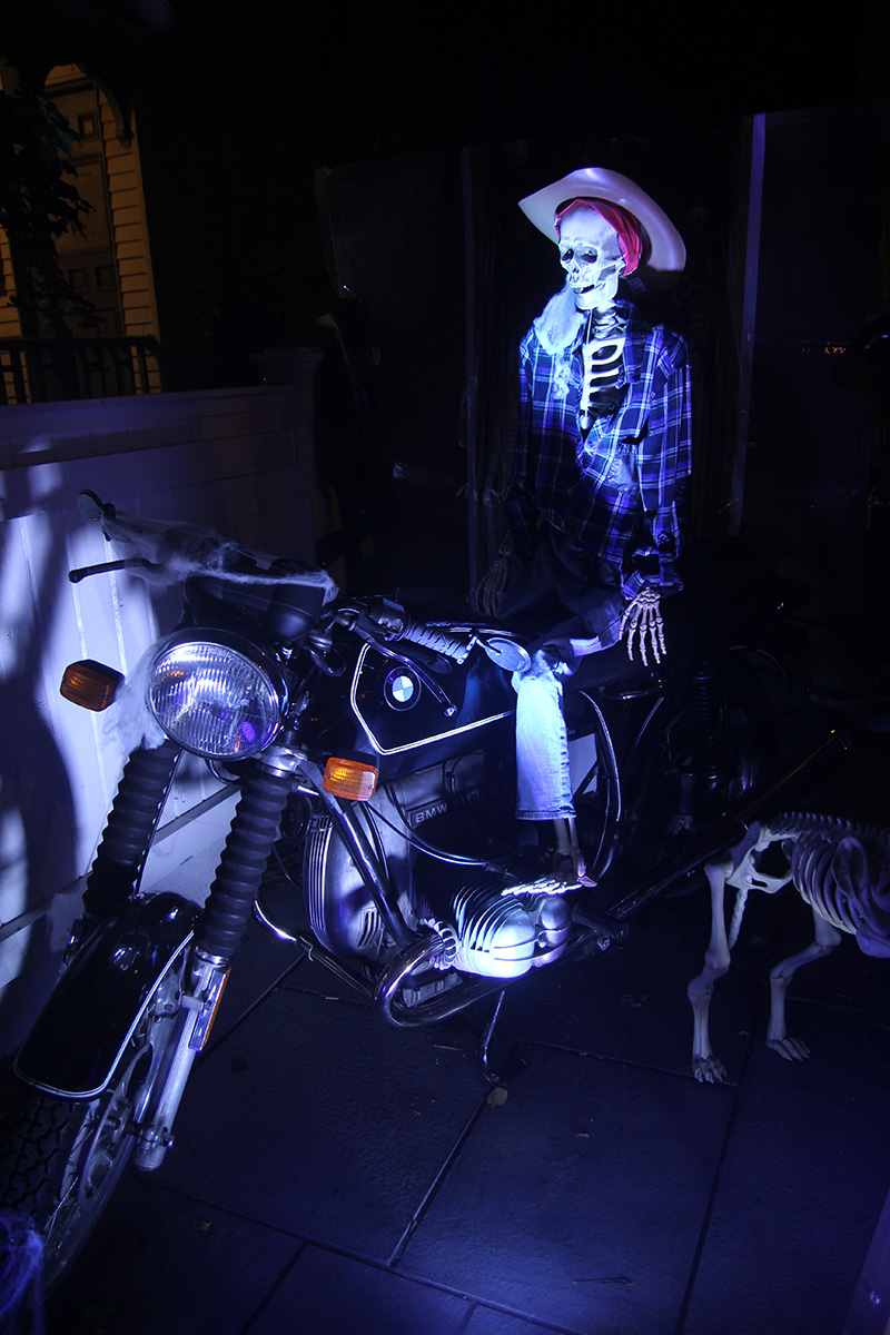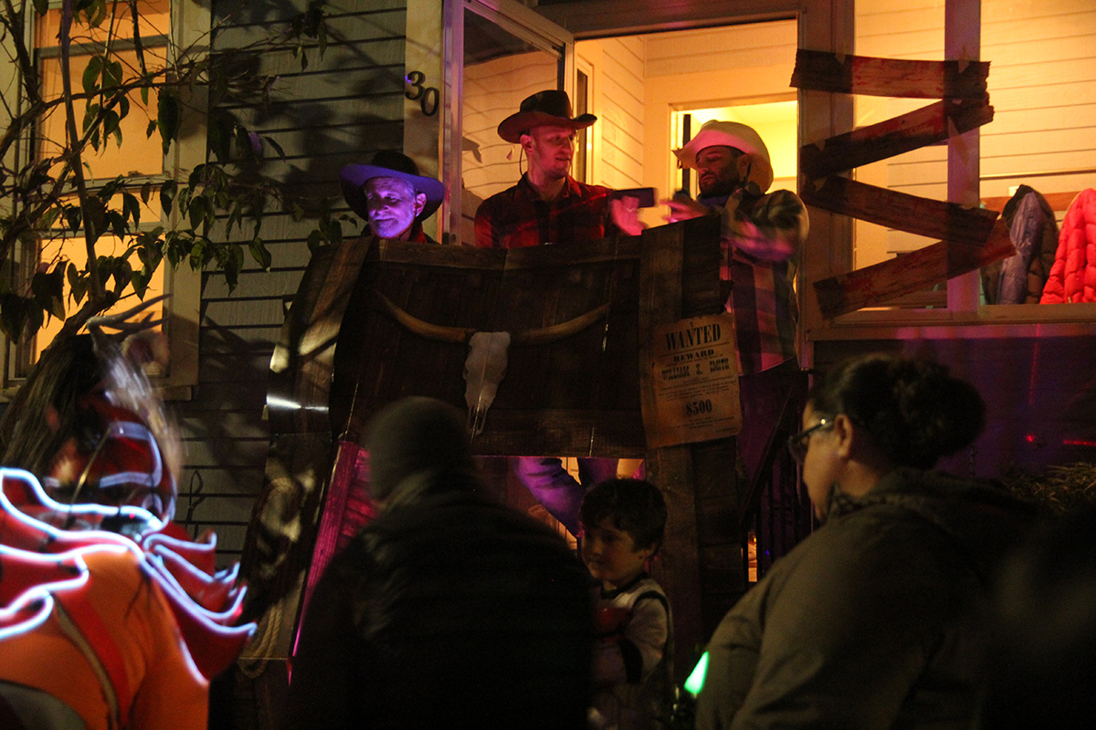 this year's halloween theme on crescent street was western related. we arrived right when the honk band showed up, playing their instruments up and down the street before leaving. i was a little disappointed that nobody came knocking on my door, even though i turned off the porch light. there's always that one group - usually teenagers - that adhere to well established halloween signals and ring every single house anyway. i did have candy, but i guess it'll all to go my personal collection (kit kat with glow-in-the-dark wrappers). i saw my upstairs neighbors had turned on their porch light, but because their doorbell was broken, they left a bowl of candy on the stoop. the bowl was of course empty.