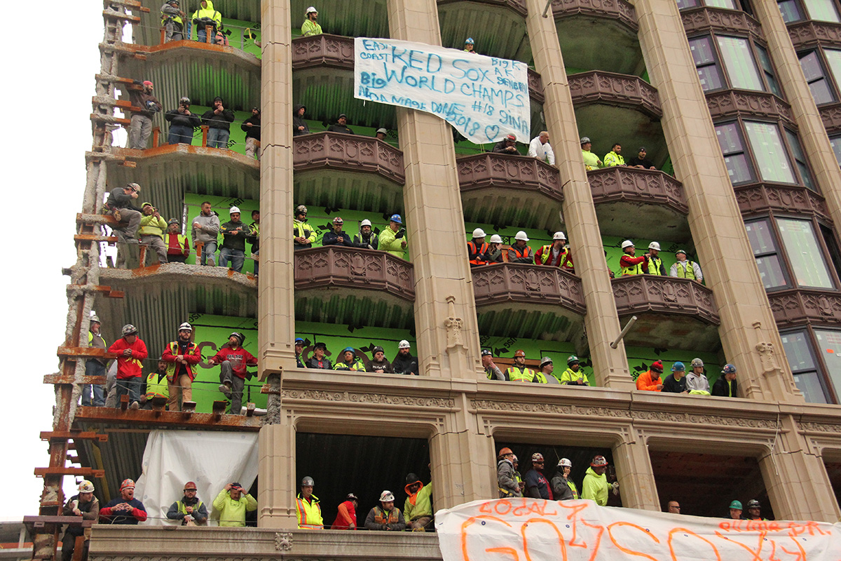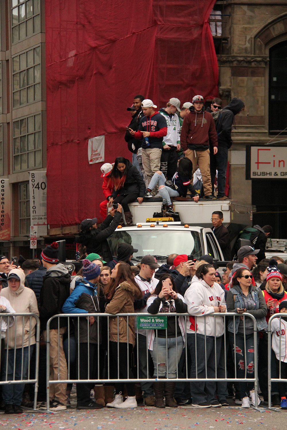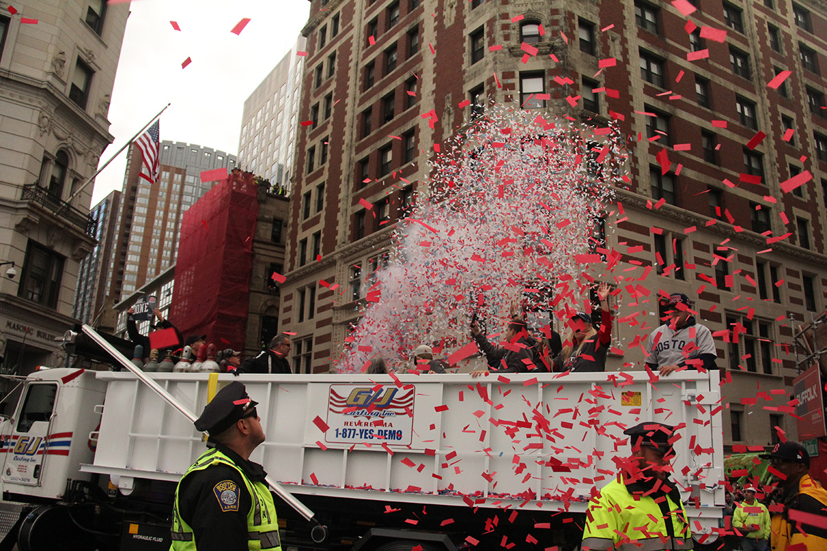 the parade actually got here faster than i expected, close to noontime. we knew it was coming because we could hear the crowd of people further down the parade route cheering. the construction guys - since they were higher up - could also see them approaching and were already getting excited. overhead, helicopters circled the sky. first to arrive were the confetti trucks, blasting everyone with colorful strips of tissue paper. that was followed by a flatbed truck with the dropkick murphy's playing onboard. the duck boats were next, bringing the players. i forgot the boats were labeled with who's onboard, makes for less guess work.