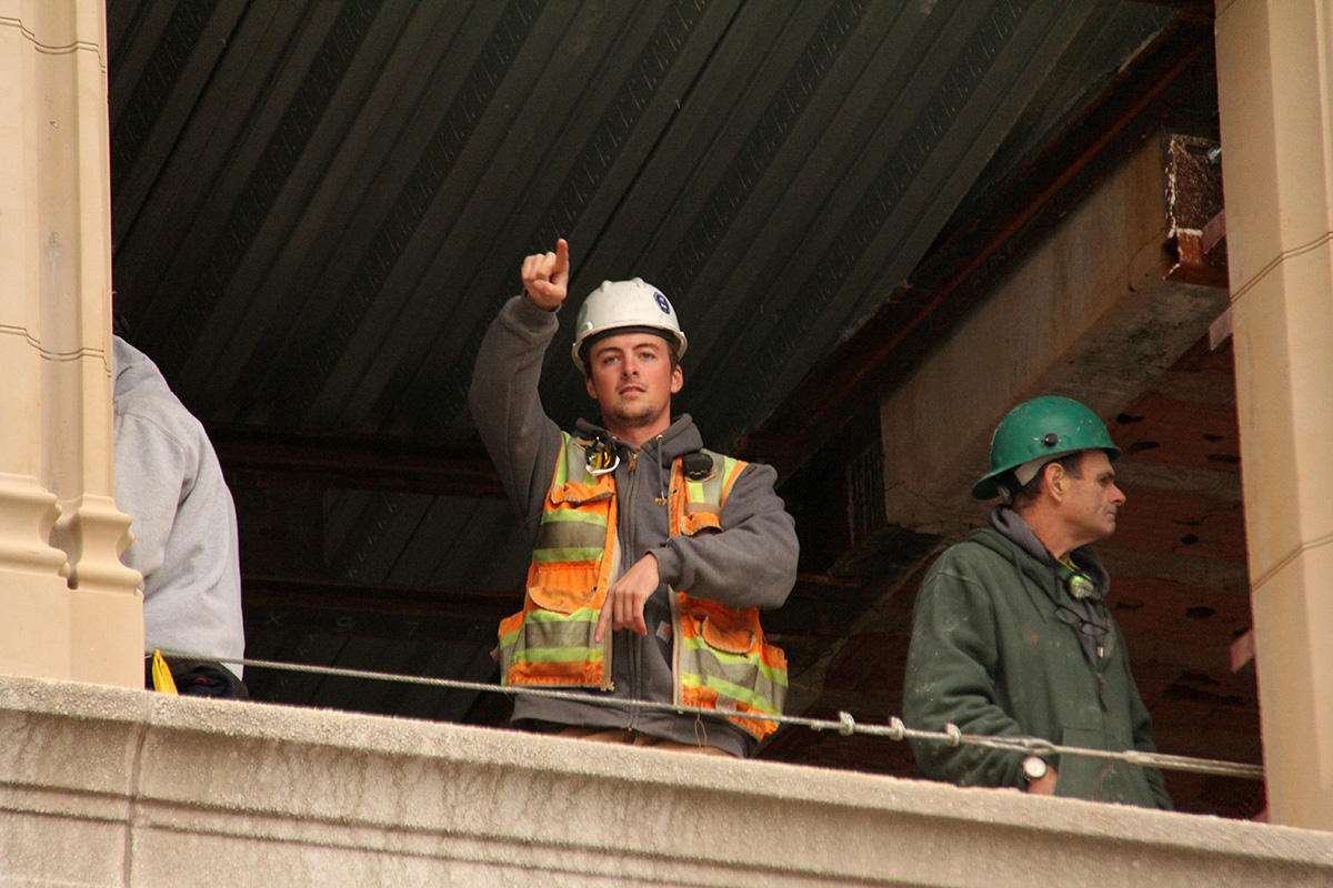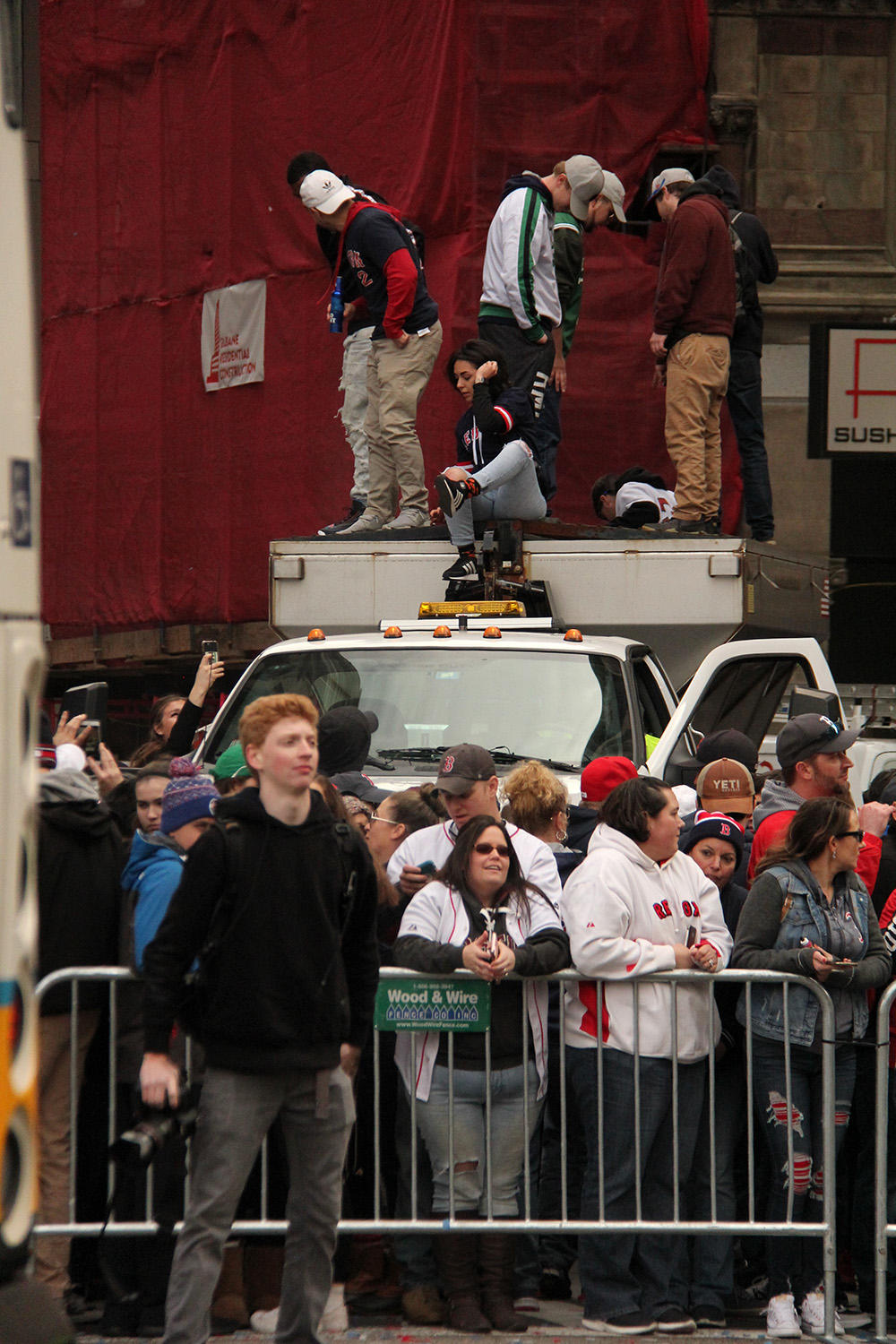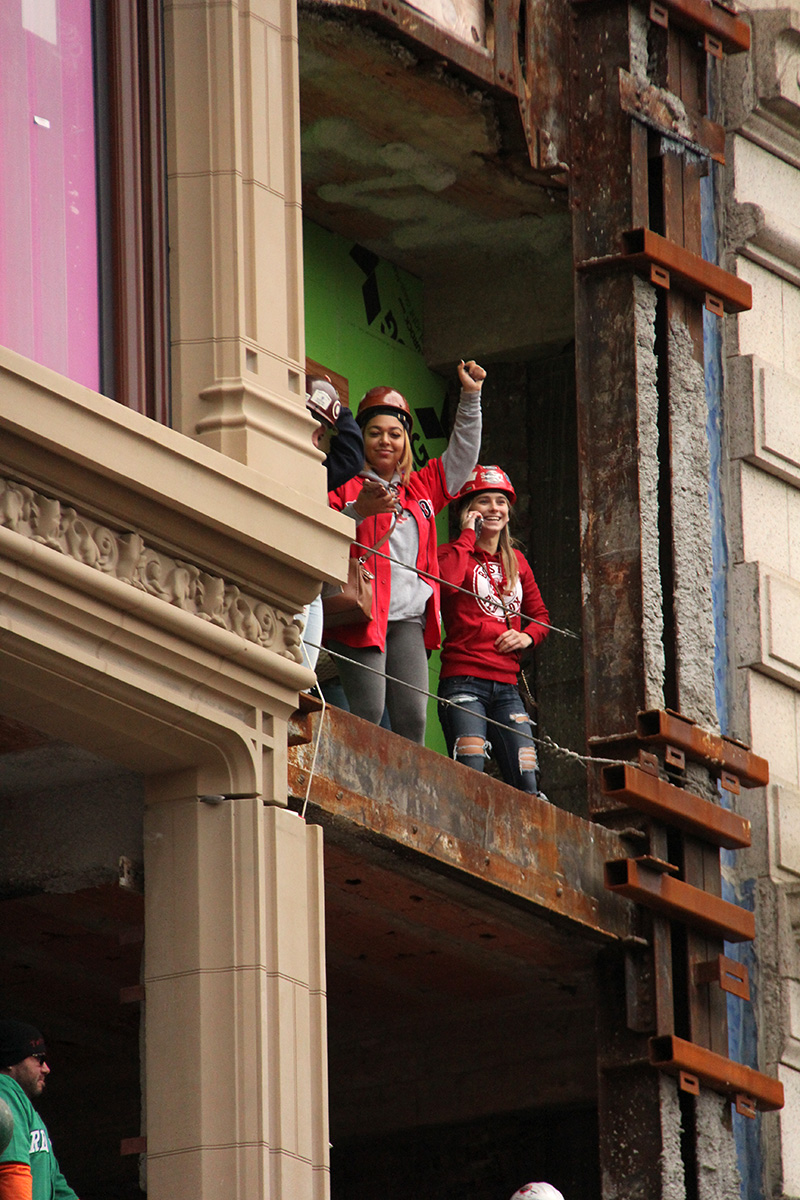 were i stood was actually a great spot, right at the corner so i could have an opportunity to catch the convoy of duck boats twice. the weather was a grey which makes for perfect exposures, with no rain. it was however still a little dark and i raised by ISO to 1600, figuring i would sacrifice a little graininess for faster shutter speed and a sharper focus. across the street they were doing construction, so that stretch of sidewalk was closed off, meaning the players would naturally turn to look at us. however what i didn't anticipate was the crowd of construction workers who all suddenly stopped working to stand by the open windows to cheer on the oncoming boats. that was enough of a distraction that made a lot of players look towards them instead of us.