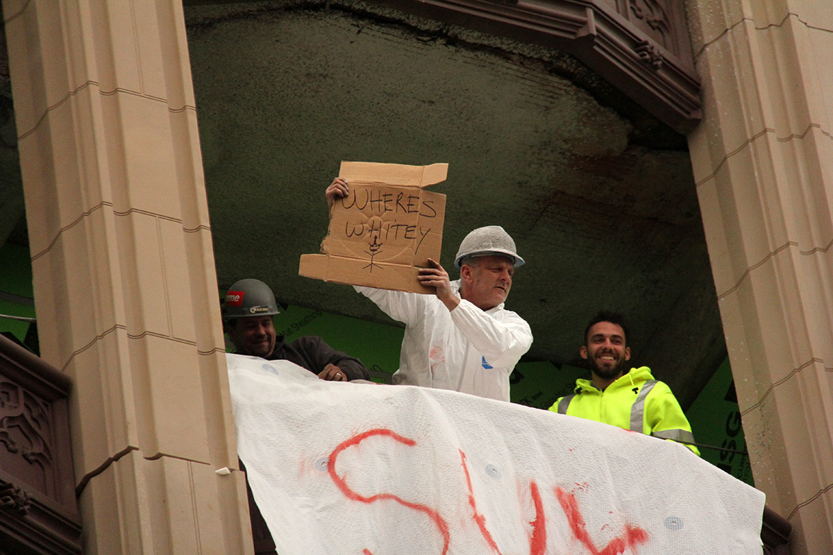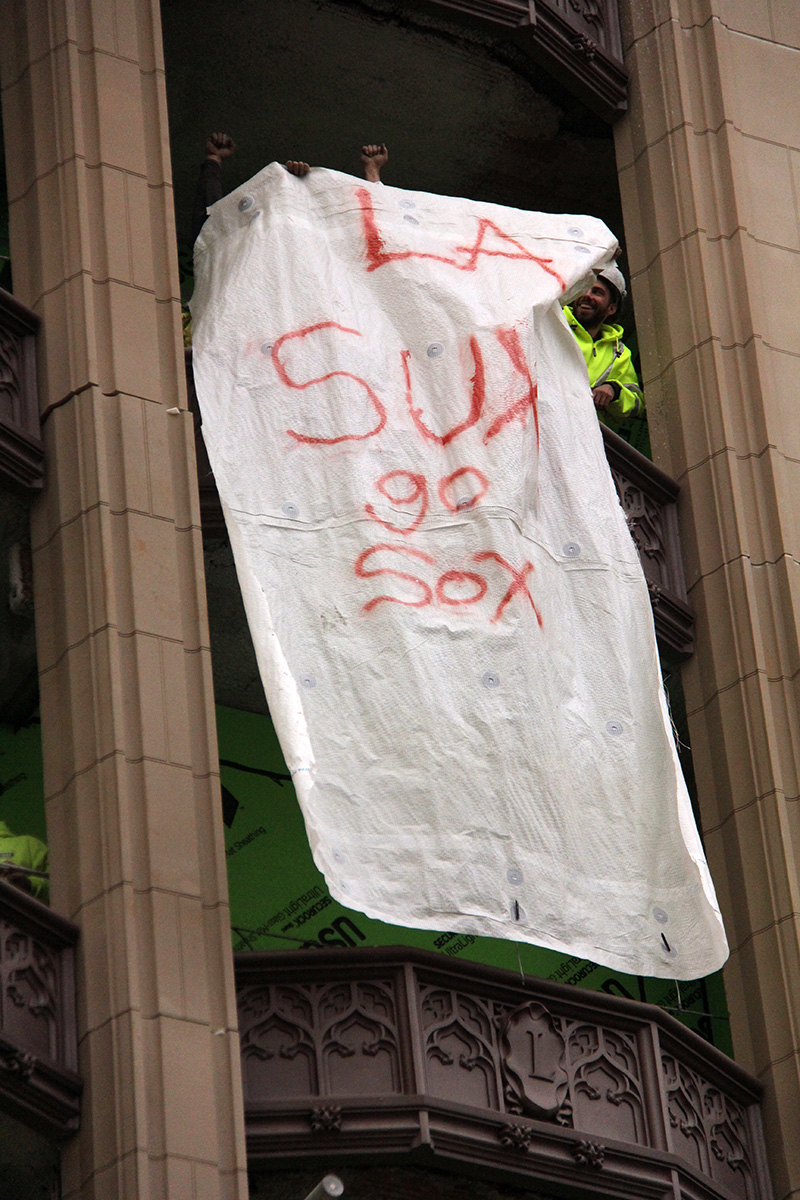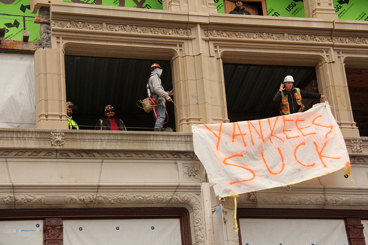 the construction guys kept everyone entertained by hanging out new makeshift banners made with spray paint and tarp. some of them were a little questionable, and they took them back down just as fast as they brought them out. banners with "yankees suck" or "la sux go sox" only made brief cameos before wiser head removed them. one guy had a "where's whitey" sign on a piece of cardboard that he only flashed for a few seconds. another construction worker seemed to want people to call him, flashing his phone number with hand gestures. it took the rowdy crowd a few tries before they finally got it.