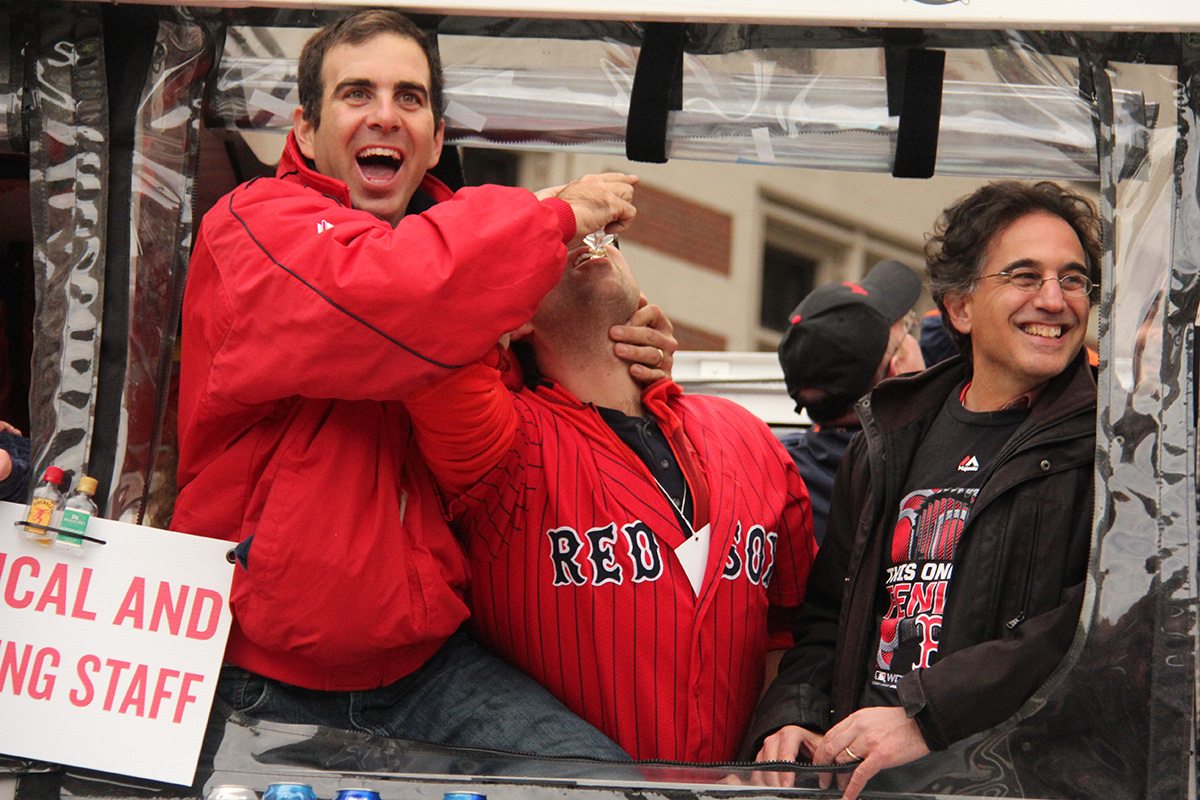 on the boat john henry (red sox co-owner) was on, i spotted pedro martinez hoisting one of the world series trophies. at first i was confused, but it seems fitting that one of boston's world series heroes and favorite player would be in charge of the trophy his team won back in 2004. the boat also carried david ortiz whom i didn't see, as well as henry's much younger and very attractive wife linda pizzuti.