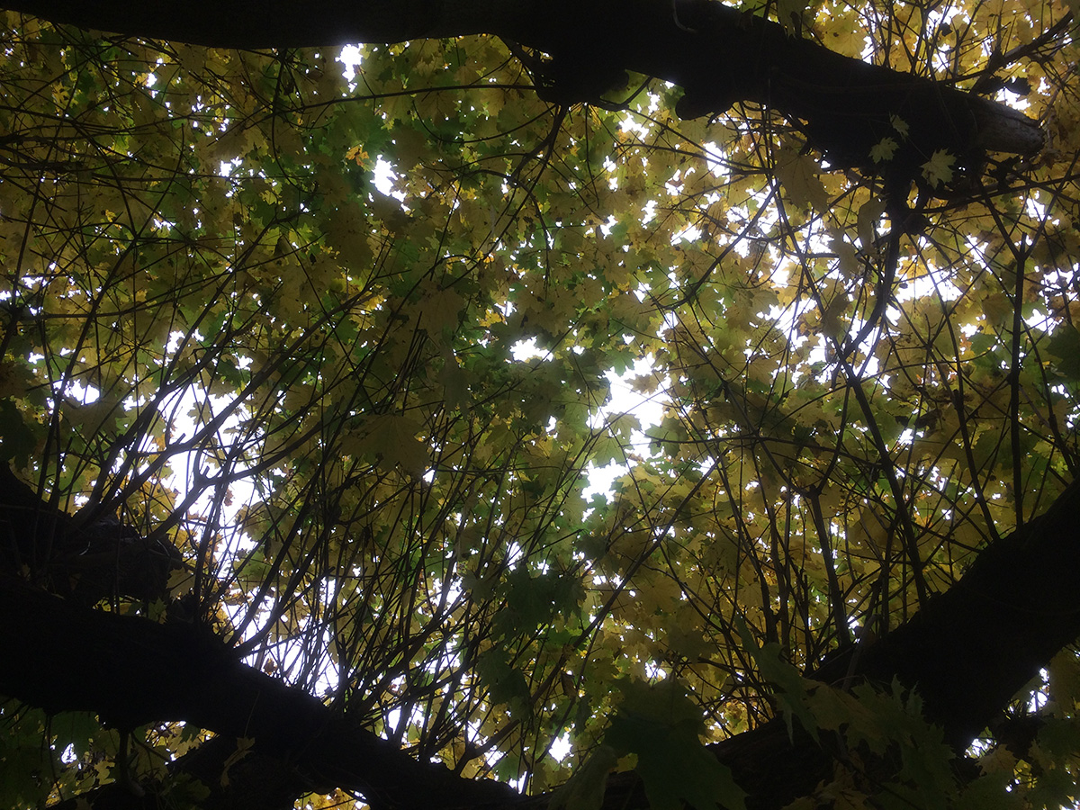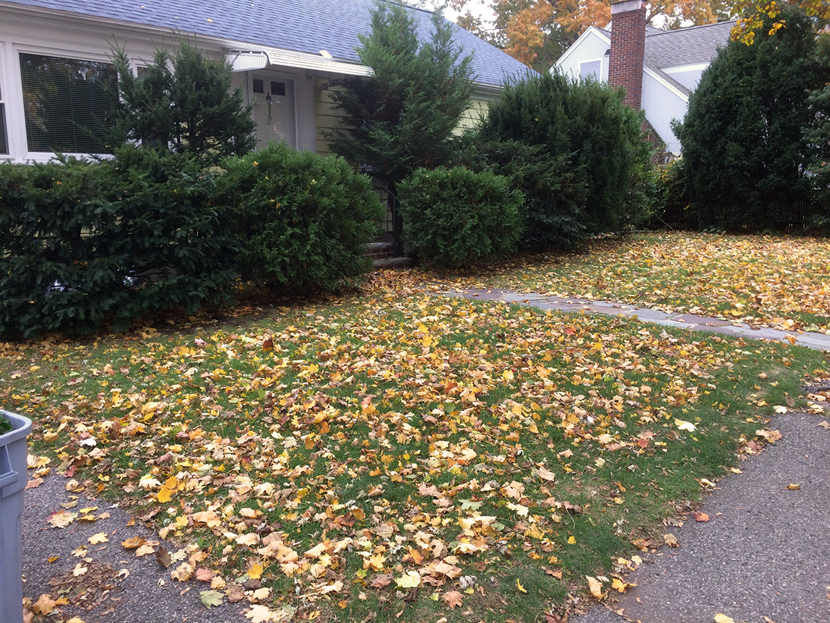 leaves on the lawn i shredded with the mower. it's messy, and bits of dead leaves flew everywhere, but whatever doesn't get picked up in the bag will end up being fertilizing for the lawn. there were more leaves in front of the house, partly from the large dying sidewalk maple tree, partly just from neighboring leaves blowing onto our property. there were less leaves in the backyard, only that single maple, which still has a good amount of yellow leaves on the branches. i finished mowing the backyard just as the mower ran out of gasoline, around 11am.