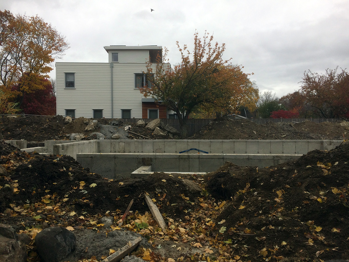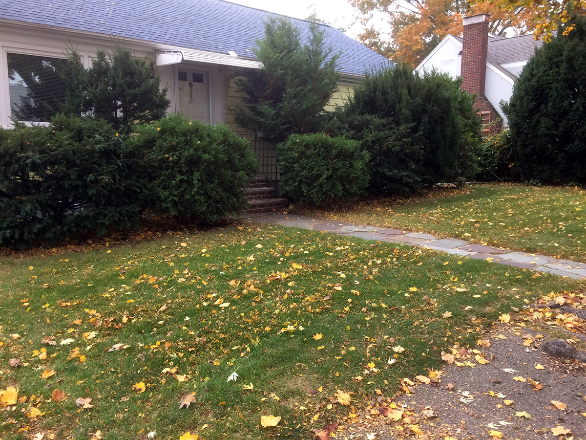 i was in belmont to mow the lawn which was a substitute for leaf raking, as i realized it was easier to pulverize the dead leaves with a mower than it is to rake them. plus, shredding the leaves this way helps with decomposition when i dump everything into the compost bin. the construction guys weren't there, perhaps scared off by the unpredictable weather forecast.