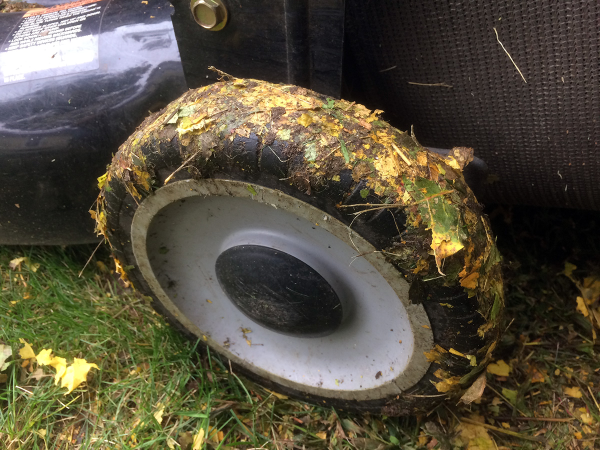 leaves along the curb next to the sidewalk i throw away because they contain too much pollutants, including leftover road salt and sand from last year. at one point the mower jammed because i was going over a too large pile of leaves. i stuck my hand in the blade to get rid of the obstruction when i suddenly realized how dangerous this was and used a weeding tool instead. there was just too much leaves along the street and since i'd throw them out anyway, no point in shredding them so i did some manually raking, filling half a dozen garden refuse bins with dead leaves.