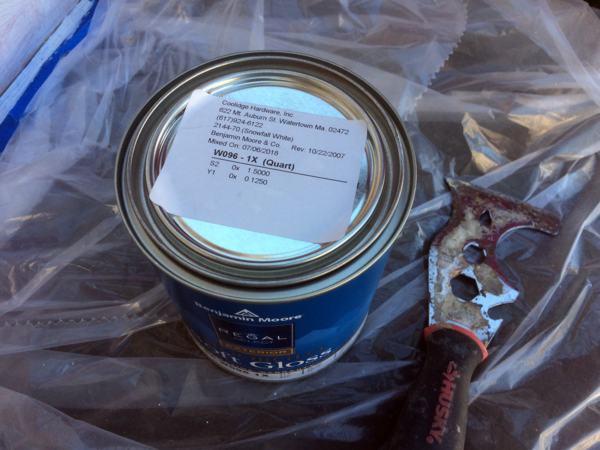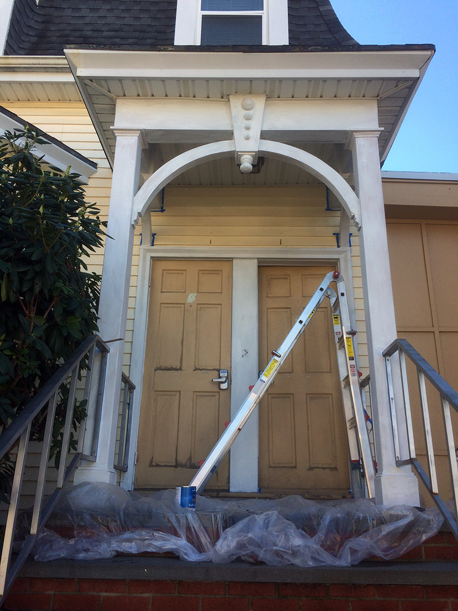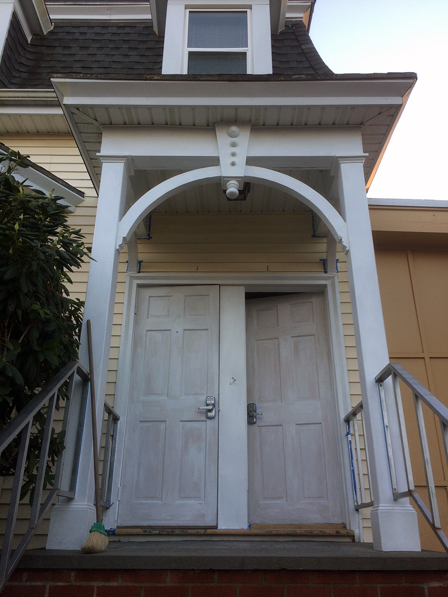 i started working at 9:30am, my sister still asleep at that time. instead of painting, i decided to prep the doors first, so any sanding i might do won't contaminate the fresh coat of paint. two simple doors ended up taking a long time to clean up, scraping off dried paint chips and patching a few spots with wood filler. i ended up not painting the porch until 11am, so much for trying to get an early start.